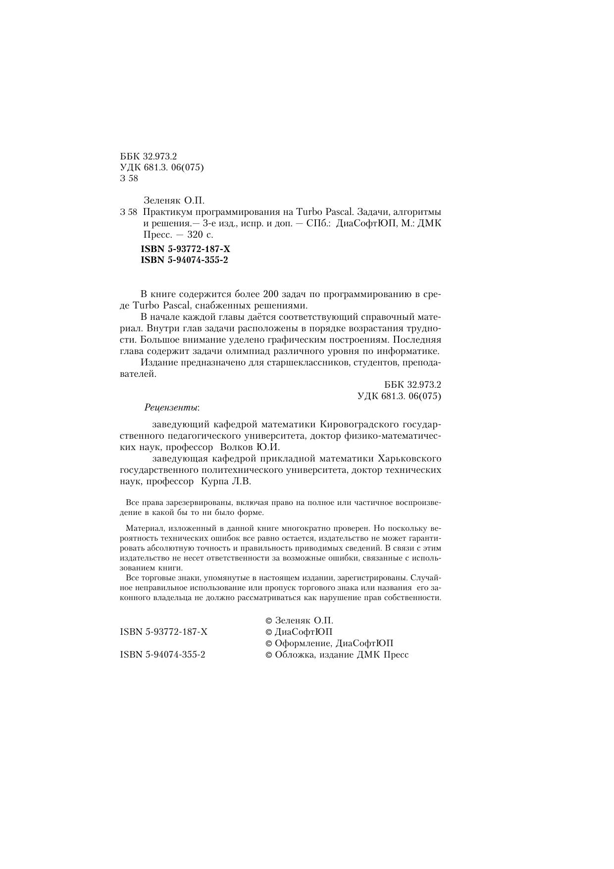 В книге содержится более 200 задач по программированию в среде Turbo Pascal, снабженных решениями. В начале каждой главы даётся соответствующий справочный материал. Внутри глав задачи расположены в порядке возрастания трудности. Большое внимание уделено графическим построениям. Последняя глава содержит задачи олимпиад различного уровня по информатике. Издание предназначено для старшеклассников, студентов, преподавателей.