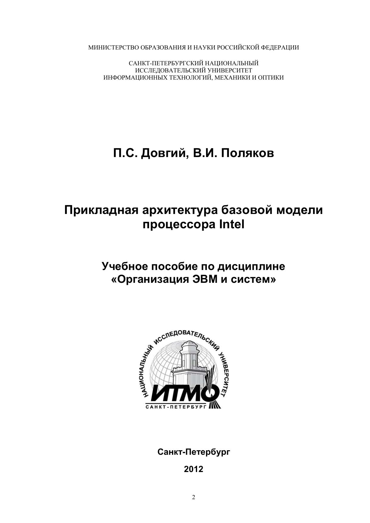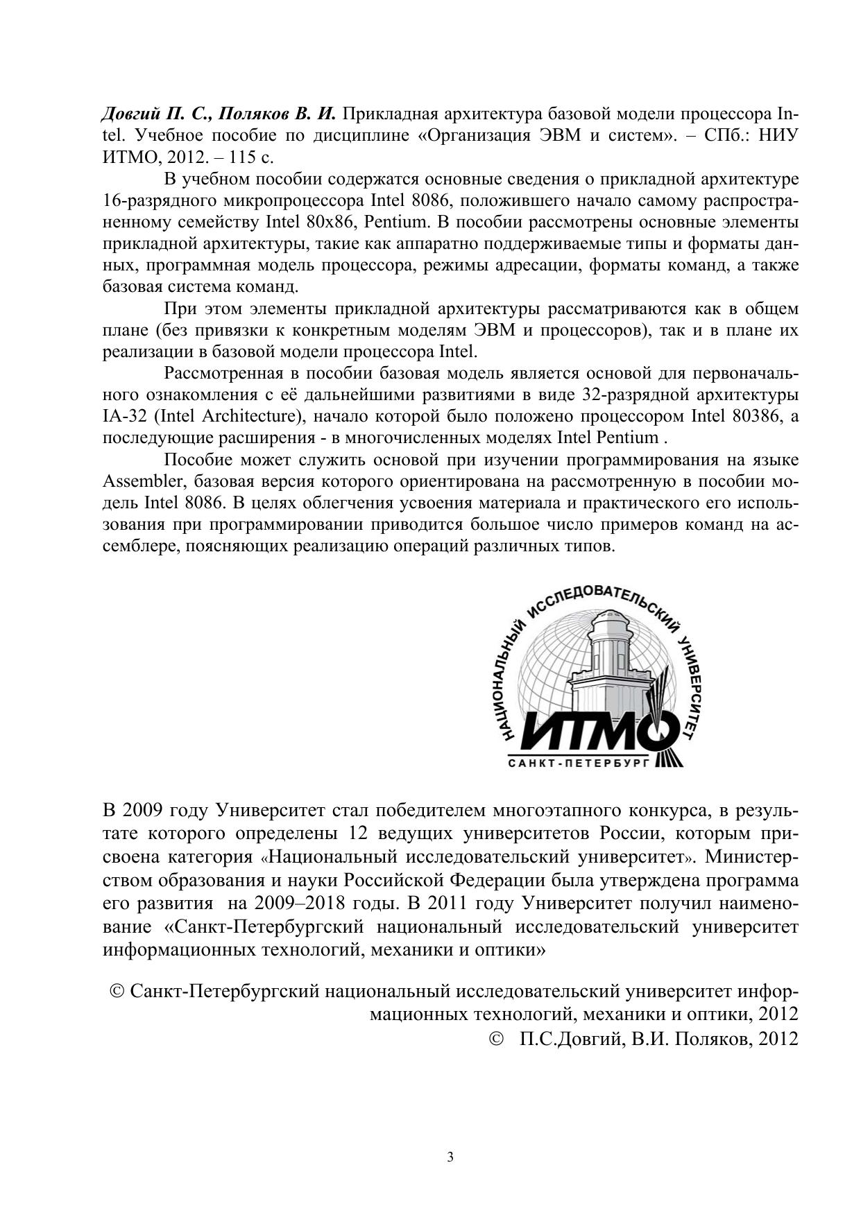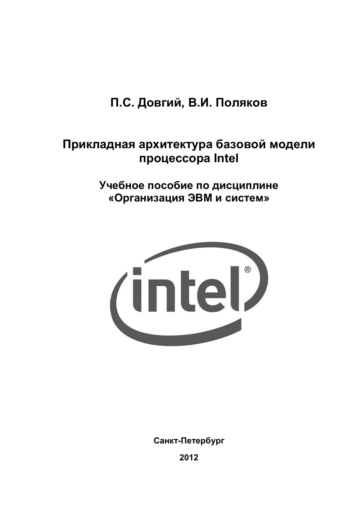 В учебном пособии содержатся основные сведения о прикладной архитектуре 16-разрядного микропроцессора Intel 8086, положившего начало самому распространенному семейству Intel 80x86, Pentium. В пособии рассмотрены основные элементыприкладной архитектуры, такие как аппаратно поддерживаемые типы и форматы данных, программная модель процессора, режимы адресации, форматы команд, а также базовая система команд. При этом элементы прикладной архитектуры рассматриваются как в общем плане (без привязки к конкретным моделям ЭВМ и процессоров), так и в плане их реализации в базовой модели процессора Intel. Рассмотренная в пособии базовая модель является основой для первоначального ознакомления с её дальнейшими развитиями в виде 32-разрядной архитектуры IA-32 (Intel Architecture), начало которой было положено процессором Intel 80386, а последующие расширения - в многочисленных моделях Intel Pentium. Пособие может служить основой при изучении программирования на языке Assembler, базовая версия которого ориентирована на рассмотренную в пособии модель Intel 8086. В целях облегчения усвоения материала и практического его использования при программировании приводится большое число примеров команд на ассемблере, поясняющих реализацию операций различных типов.