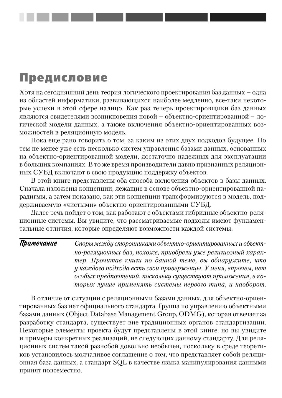 В книге описана новая технология, применяющаяся для хранения и обработки больших объемов различной информации. Рассматриваются базовые концепции функционирования БД, сравниваются полностью объектно- ориентированные и гибридные системы управления базами данных. Приводится несколько примеров их разработки, указываются преимущества и недостатки реализаций. Издание адресовано читателям, которые хотят получить общее представление о возможностях и особенностях объектно-ориентированных СУБД. Книга будет особенно полезна разработчикам баз данных для различных систем автоматизации, управления и документооборота.