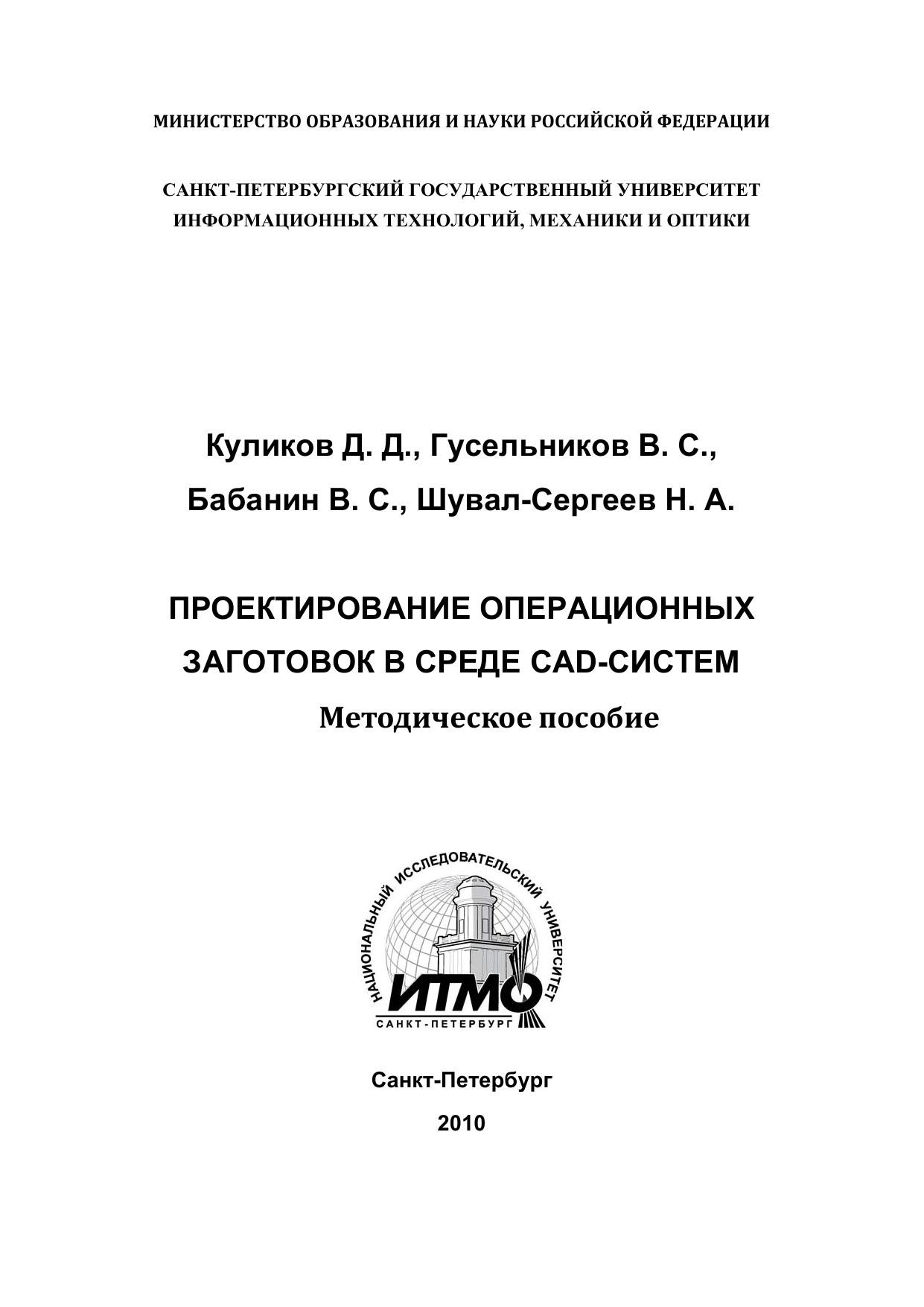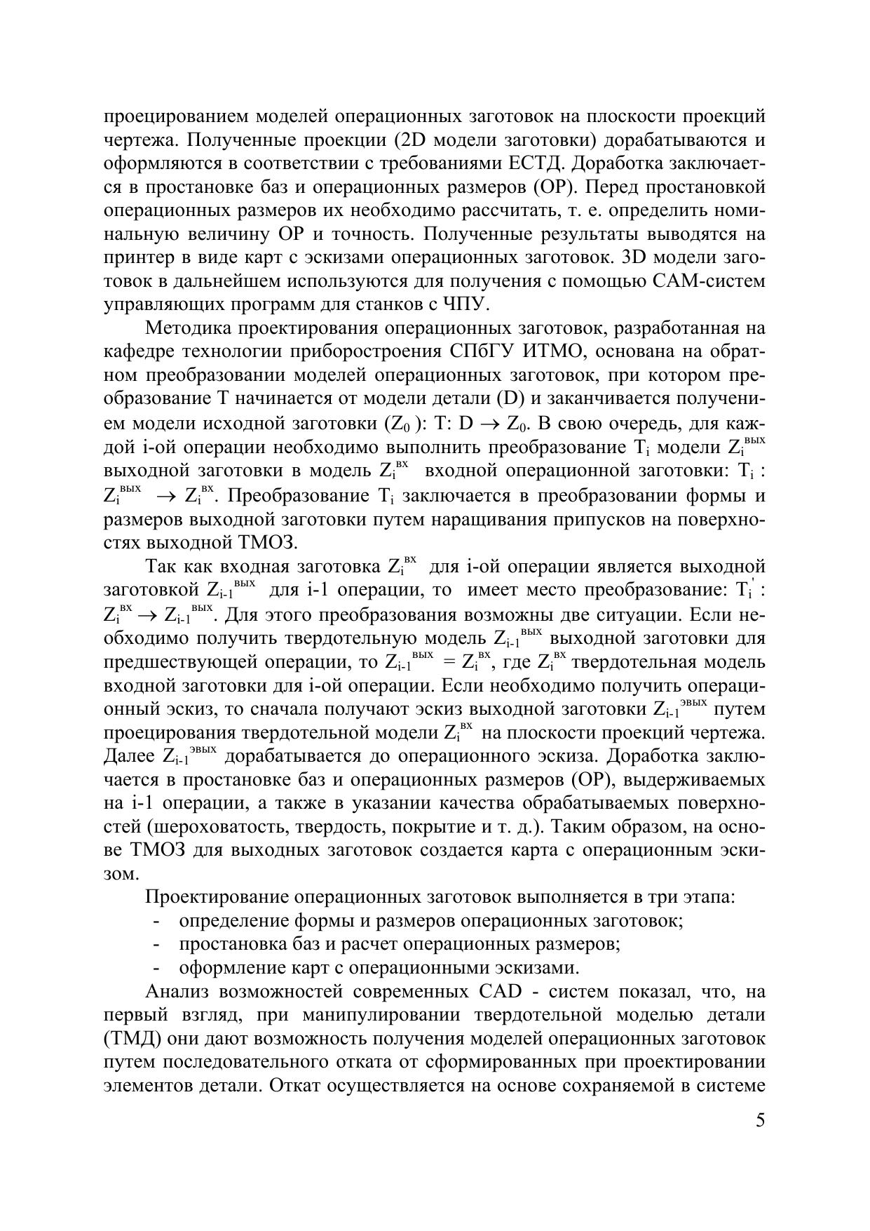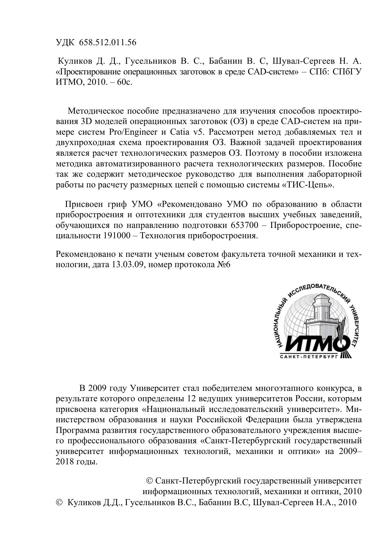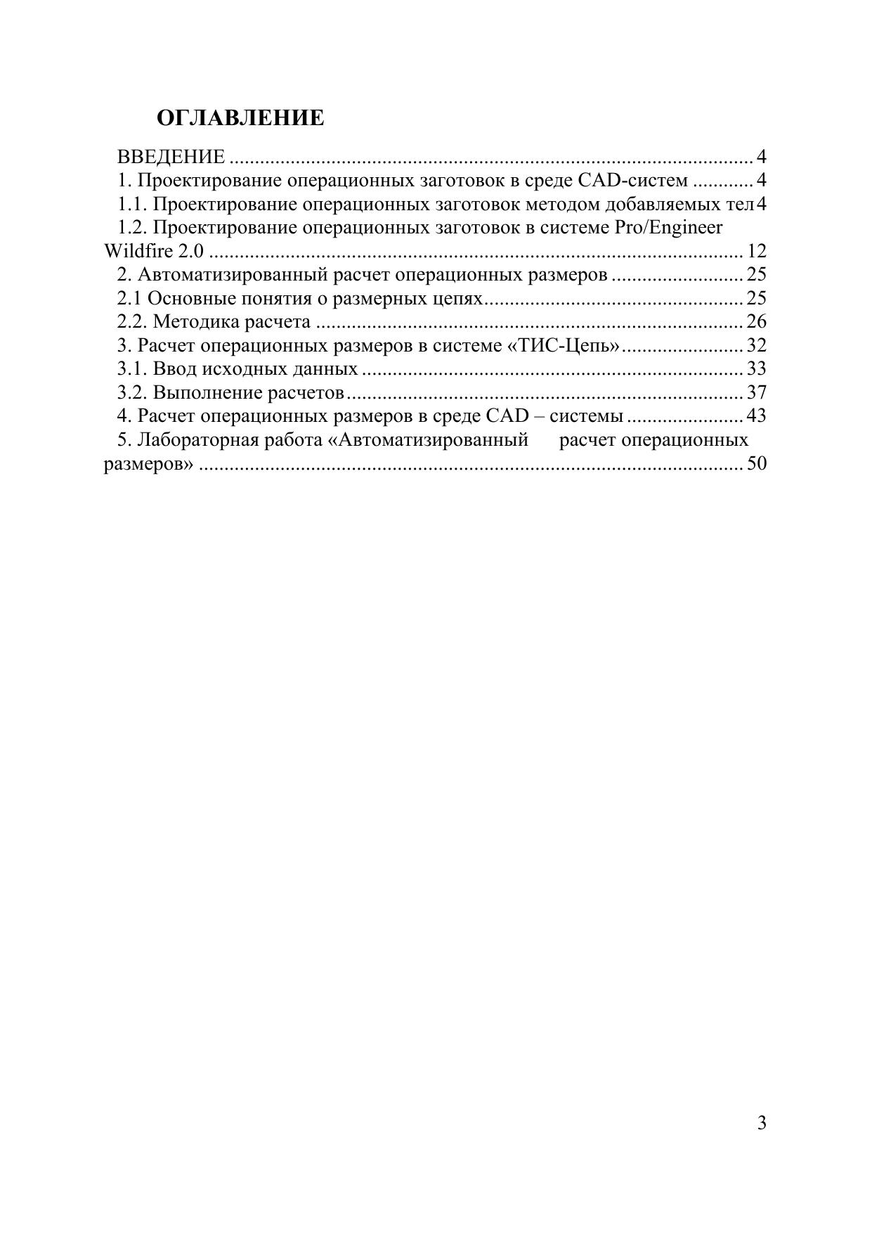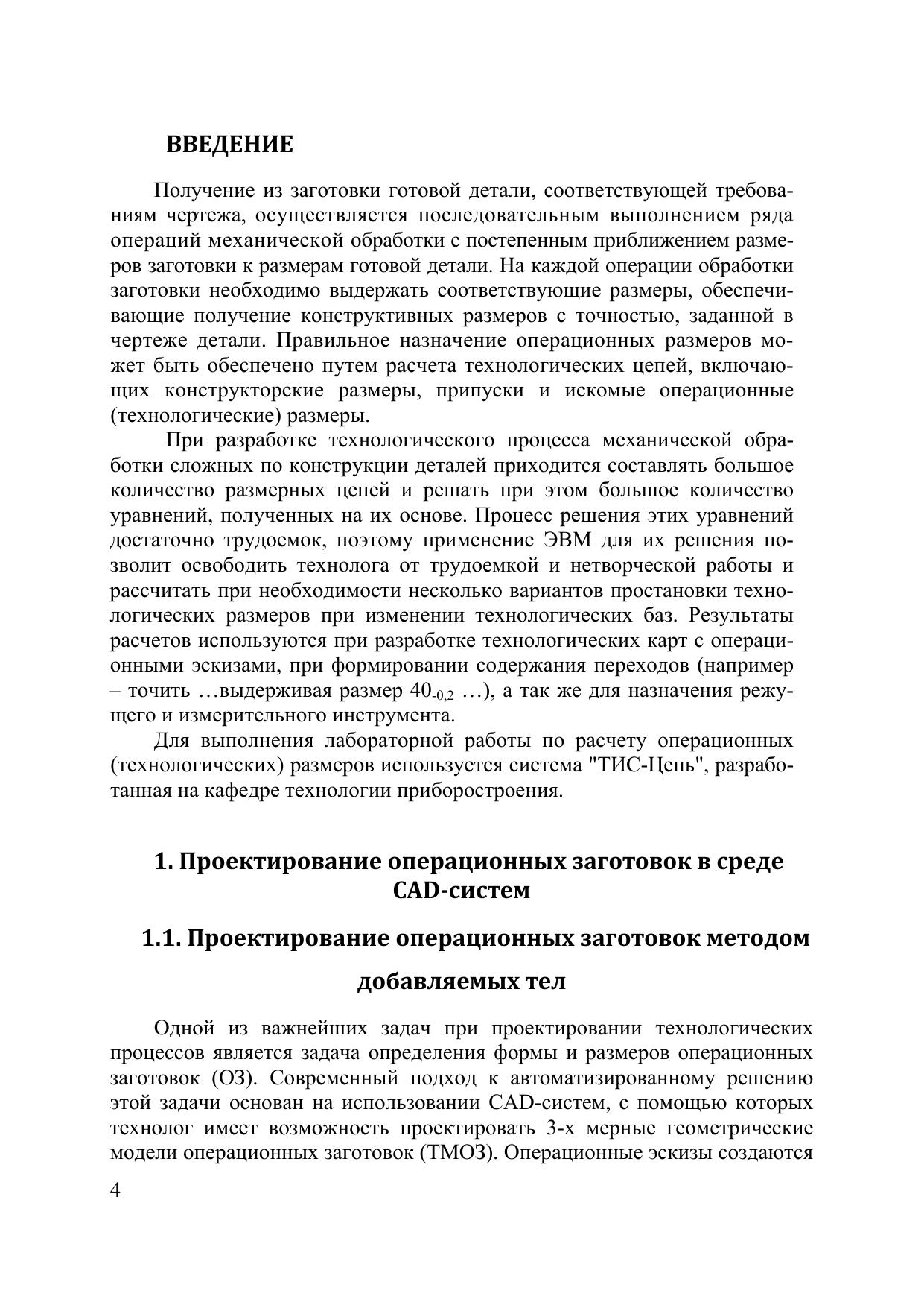 Методическое пособие предназначено для изучения способов проектирования 3D моделей операционных заготовок (ОЗ) в среде CAD-систем на примере систем Pro/Engineer и Catia v5. Рассмотрен метод добавляемых тел и двухпроходная схема проектирования ОЗ. Важной задачей проектирования является расчет технологических размеров ОЗ. Поэтому в пособии изложена методика автоматизированного расчета технологических размеров. Пособие так же содержит методическое руководство для выполнения лабораторной работы по расчету размерных цепей с помощью системы «ТИС-Цепь».