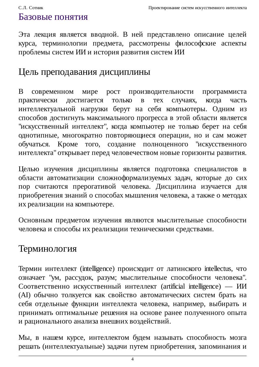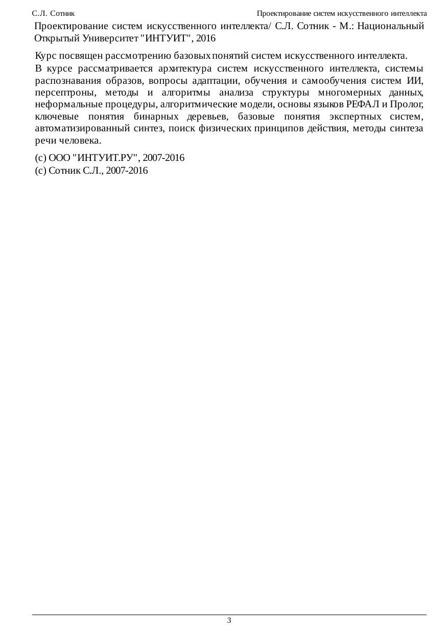 Курс посвящен рассмотрению базовых понятий систем искусственного интеллекта. В курсе рассматривается архитектура систем искусственного интеллекта, системы распознавания образов, вопросы адаптации, обучения и самообучения систем ИИ, персептроны, методы и алгоритмы анализа структуры многомерных данных, неформальные процедуры, алгоритмические модели, основы языков РЕФАЛ и Пролог, ключевые понятия бинарных деревьев, базовые понятия экспертных систем, автоматизированный синтез, поиск физических принципов действия, методы синтеза речи человека.