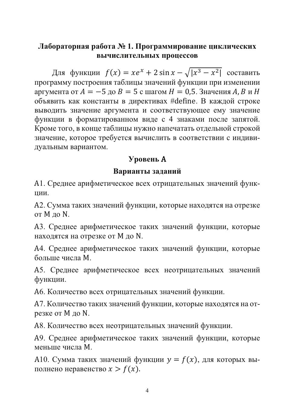 В данном лабораторном практикуме по программированию приводятся варианты индивидуальных заданий для лабораторных работ по таким темам, как «Условные операторы», «Циклы», «Одномерные массивы», «Матрицы», «Строки», «Структуры данных», «Текстовые и двоичные файлы», «Линейные динамические структуры данных», «Бинарные деревья», «Биты памяти». В лабораторных работах задания разделены на три уровня сложности (уровни A, B и C) — от простого к сложному. Составлять программы можно на разных языках программирования, но задания и примеры ориентированы на язык программирования Си. Данный практикум является дополнением к книге автора «Программирование на языке Си», вышедшей в издательстве Лань в 2022 году. Опираясь на указанную книгу, можно выполнить лабораторные работы, представленные в данном практикуме, любого уровня сложности. Предназначено для студентов вузов и всех желающих, изучающих языки программирования.