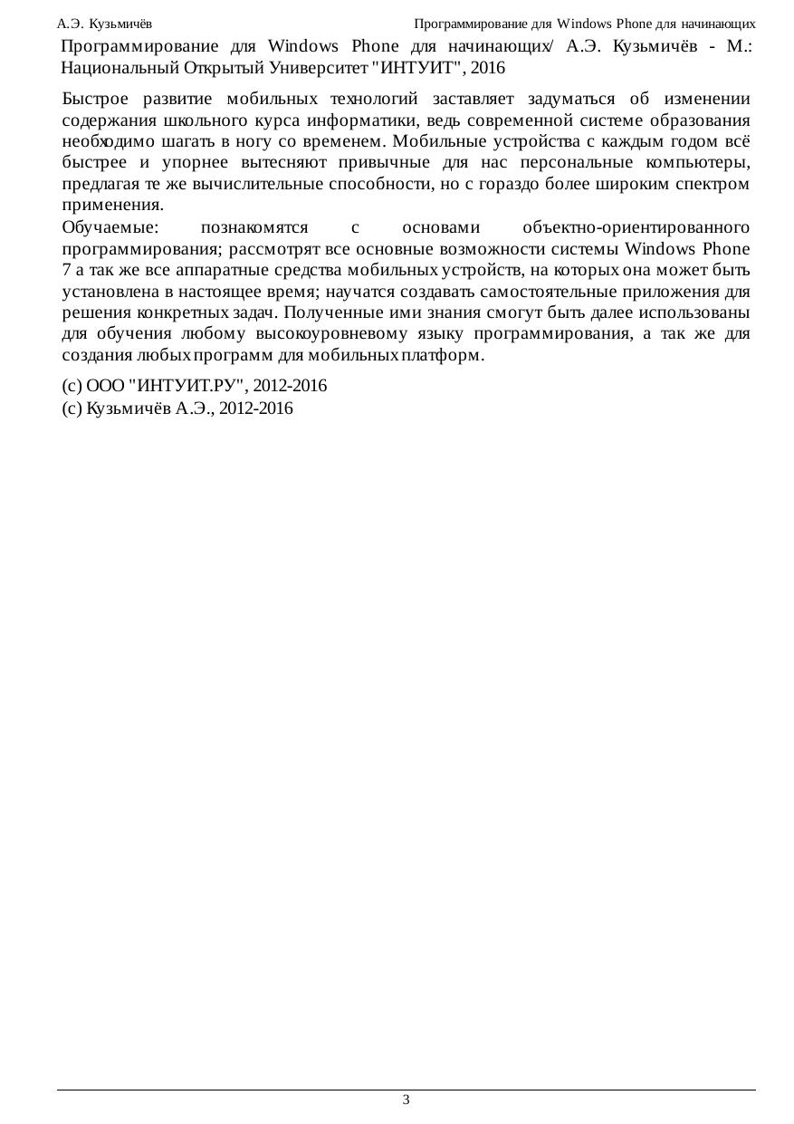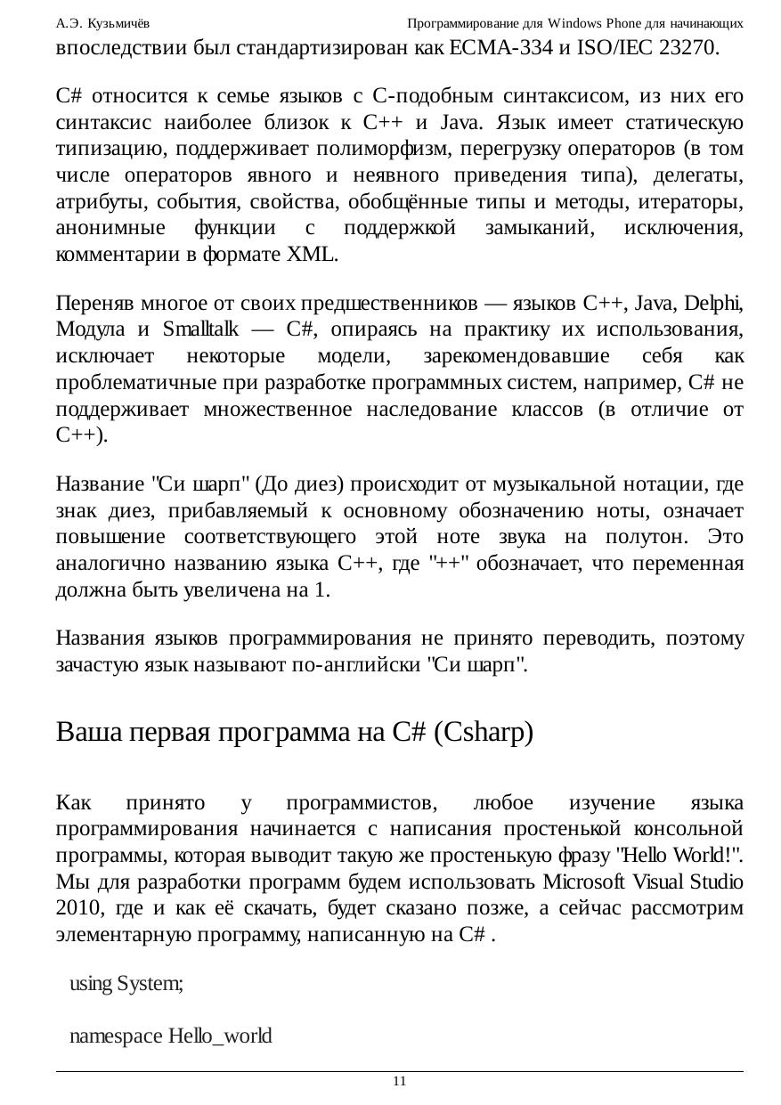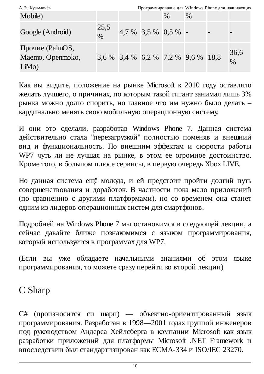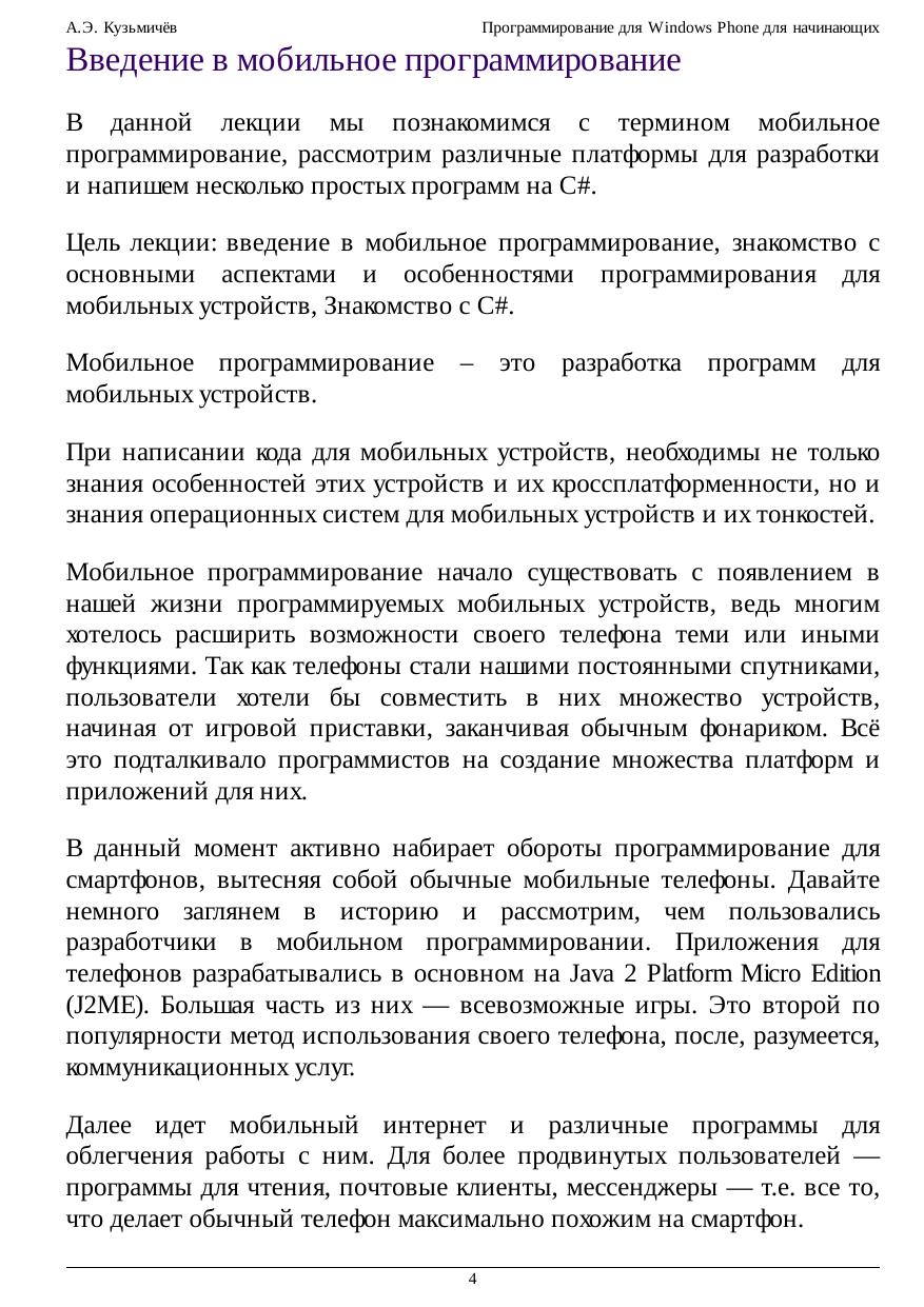 программирования; рассмотрят все основные возможности системы Windows Phone 7 а так же все аппаратные средства мобильных устройств, на которых она может быть установлена в настоящее время; научатся создавать самостоятельные приложения для решения конкретных задач. Полученные ими знания смогут быть далее использованы для обучения любому высокоуровневому языку программирования, а так же для создания любых программ для мобильных платформ.