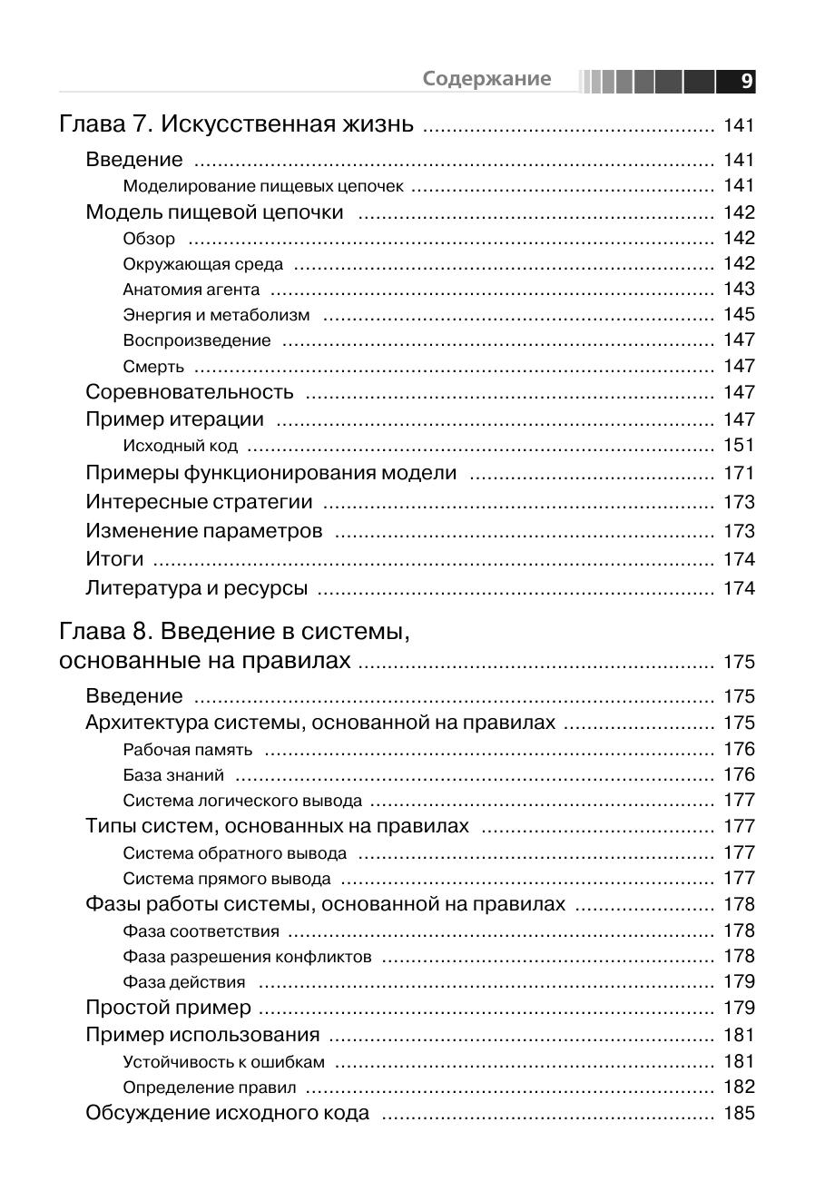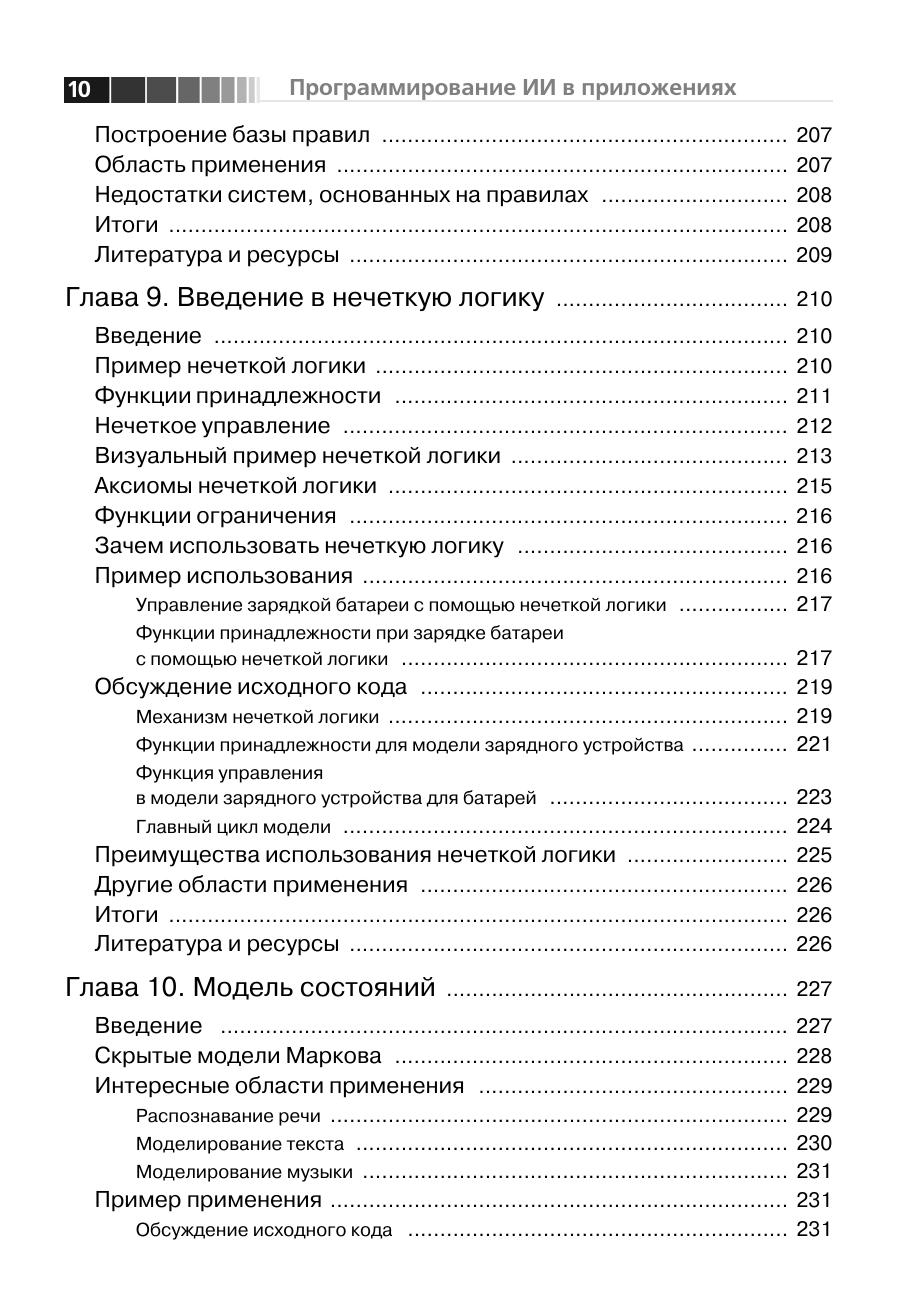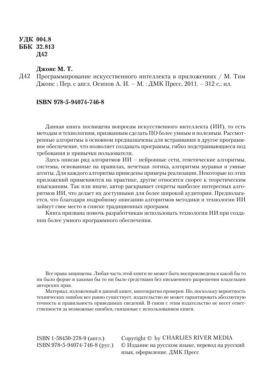 Данная книга посвящена вопросам искусственного интеллекта (ИИ), то есть методам и технологиям, призванным сделать ПО более умным и полезным. Рассмотренные алгоритмы в основном предназначены для встраивания в другое программное обеспечение, что позволяет создавать программы, гибко подстраивающиеся под требования и привычки пользователя. Здесь описан ряд алгоритмов ИИ – нейронные сети, генетические алгоритмы, системы, основанные на правилах, нечеткая логика, алгоритмы муравья и умные агенты. Для каждого алгоритма приведены примеры реализации. Некоторые из этих приложений применяются на практике, другие относятся скорее к теоретическим изысканиям. Так или иначе, автор раскрывает секреты наиболее интересных алгоритмов ИИ, что делает их доступными для более широкой аудитории. Предполагается, что благодаря подробному описанию алгоритмов методики и технологии ИИ займут свое место в списке традиционных программ. Книга призвана помочь разработчикам использовать технологии ИИ при создании более умного программного обеспечения.