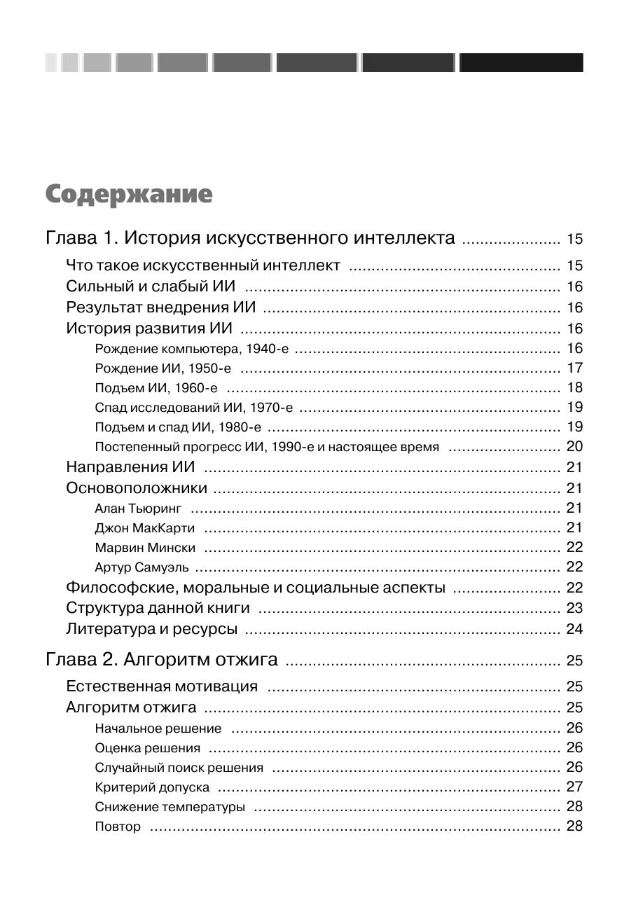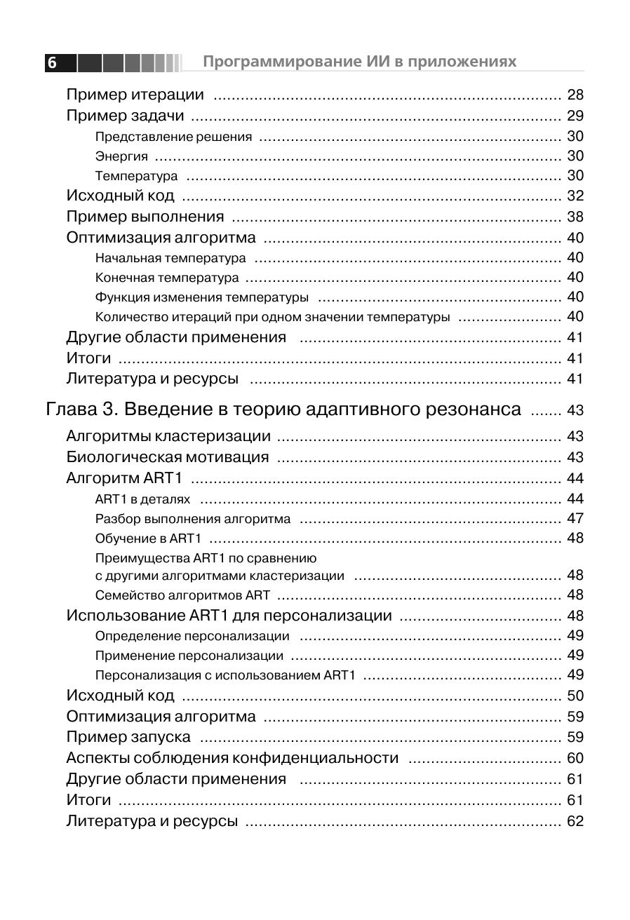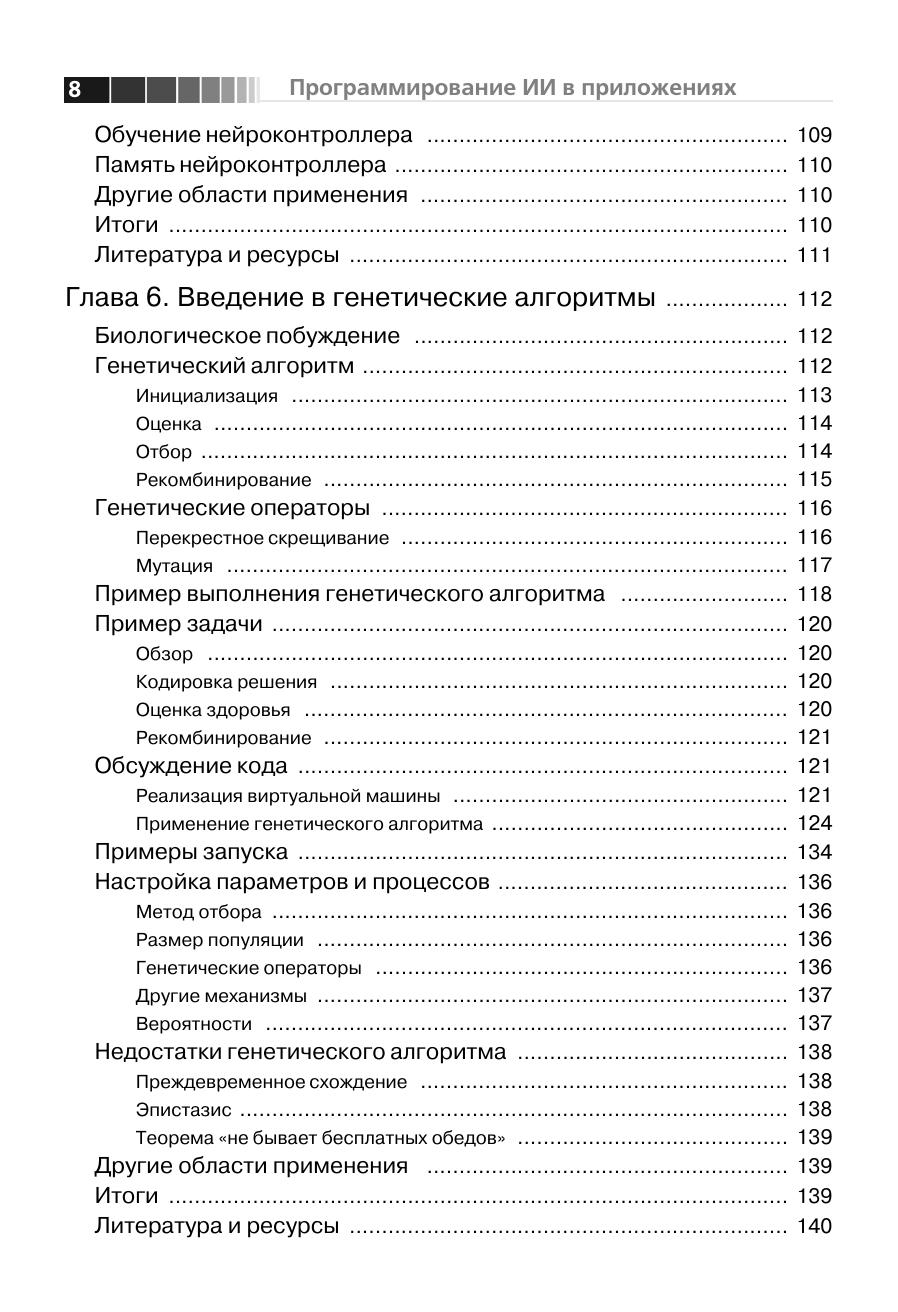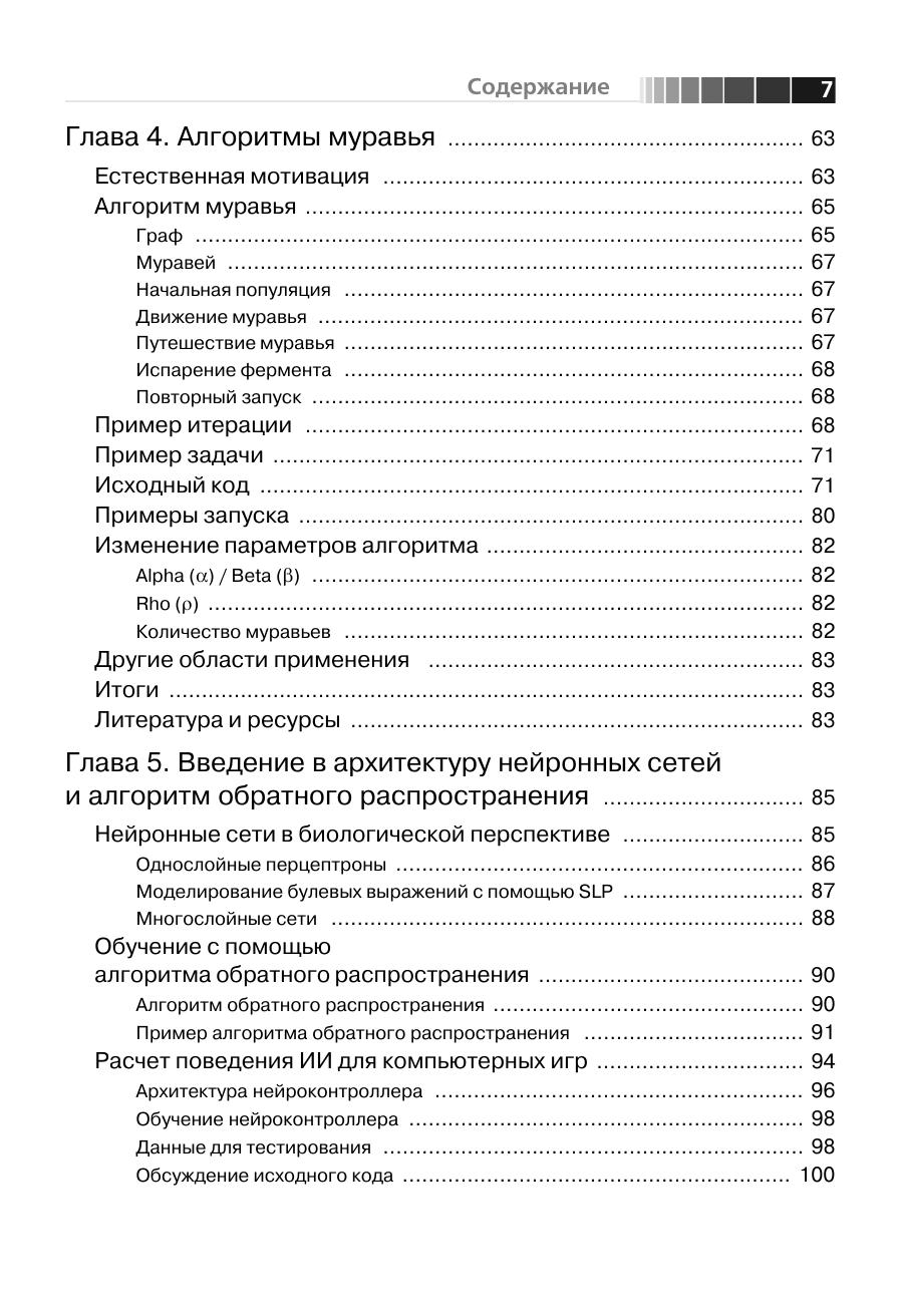 Данная книга посвящена вопросам искусственного интеллекта (ИИ), то есть методам и технологиям, призванным сделать ПО более умным и полезным. Рассмотренные алгоритмы в основном предназначены для встраивания в другое программное обеспечение, что позволяет создавать программы, гибко подстраивающиеся под требования и привычки пользователя. Здесь описан ряд алгоритмов ИИ – нейронные сети, генетические алгоритмы, системы, основанные на правилах, нечеткая логика, алгоритмы муравья и умные агенты. Для каждого алгоритма приведены примеры реализации. Некоторые из этих приложений применяются на практике, другие относятся скорее к теоретическим изысканиям. Так или иначе, автор раскрывает секреты наиболее интересных алгоритмов ИИ, что делает их доступными для более широкой аудитории. Предполагается, что благодаря подробному описанию алгоритмов методики и технологии ИИ займут свое место в списке традиционных программ. Книга призвана помочь разработчикам использовать технологии ИИ при создании более умного программного обеспечения.