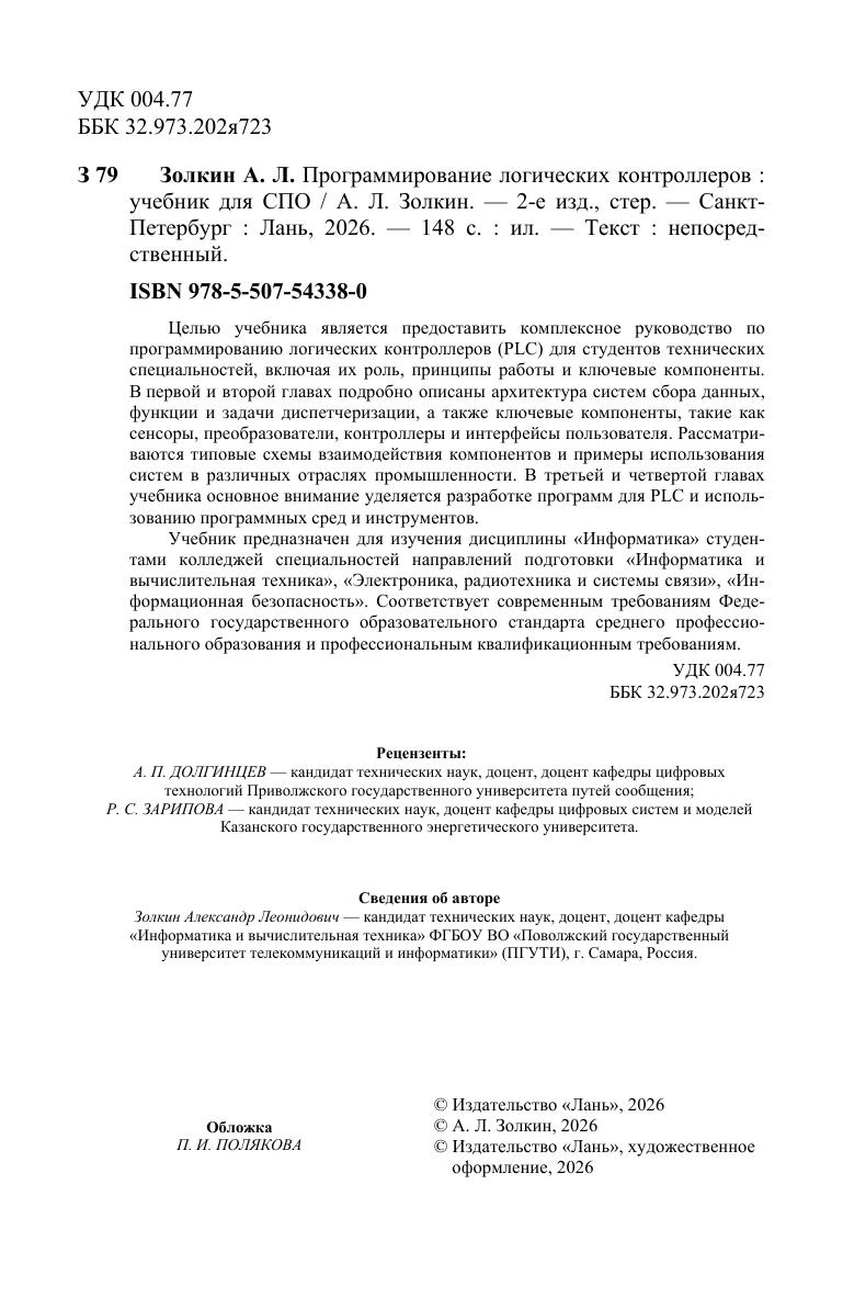 Целью учебника является предоставить комплексное руководство по программированию логических контроллеров (PLC) для студентов технических специальностей, включая их роль, принципы работы и ключевые компоненты. В первой и второй главах подробно описаны архитектура систем сбора данных, функции и задачи диспетчеризации, а также ключевые компоненты, такие как сенсоры, преобразователи, контроллеры и интерфейсы пользователя. Рассматриваются типовые схемы взаимодействия компонентов и примеры использования систем в различных отраслях промышленности. В третьей и четвертой главах учебника основное внимание уделяется разработке программ для PLC и использованию программных сред и инструментов. Учебник предназначен для изучения дисциплины «Информатика» студентами колледжей специальностей направлений подготовки «Информатика и вычислительная техника», «Электроника, радиотехника и системы связи», «Информационная безопасность». Соответствует современным требованиям Федерального государственного образовательного стандарта среднего профессионального образования и профессиональным квалификационным требованиям.