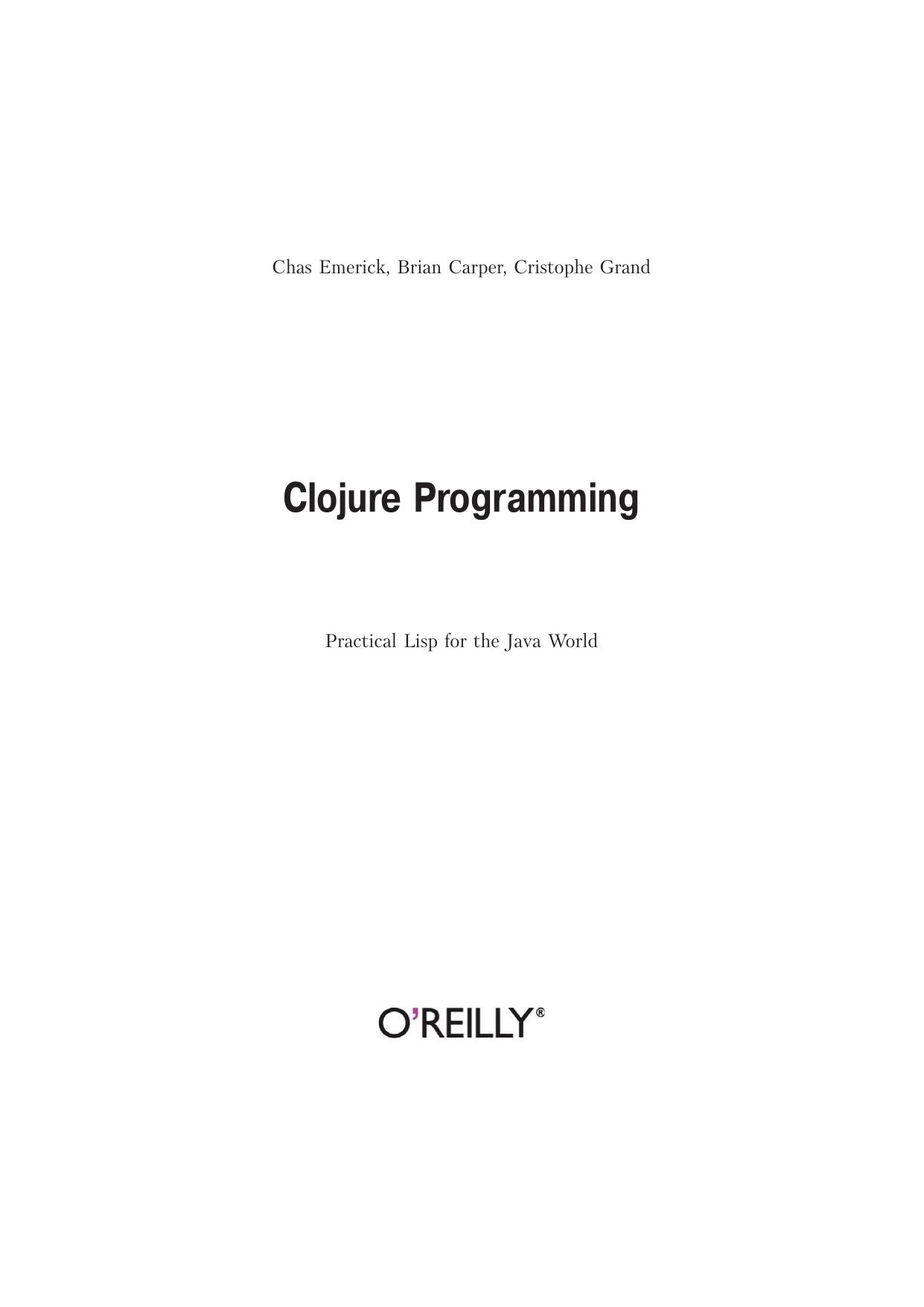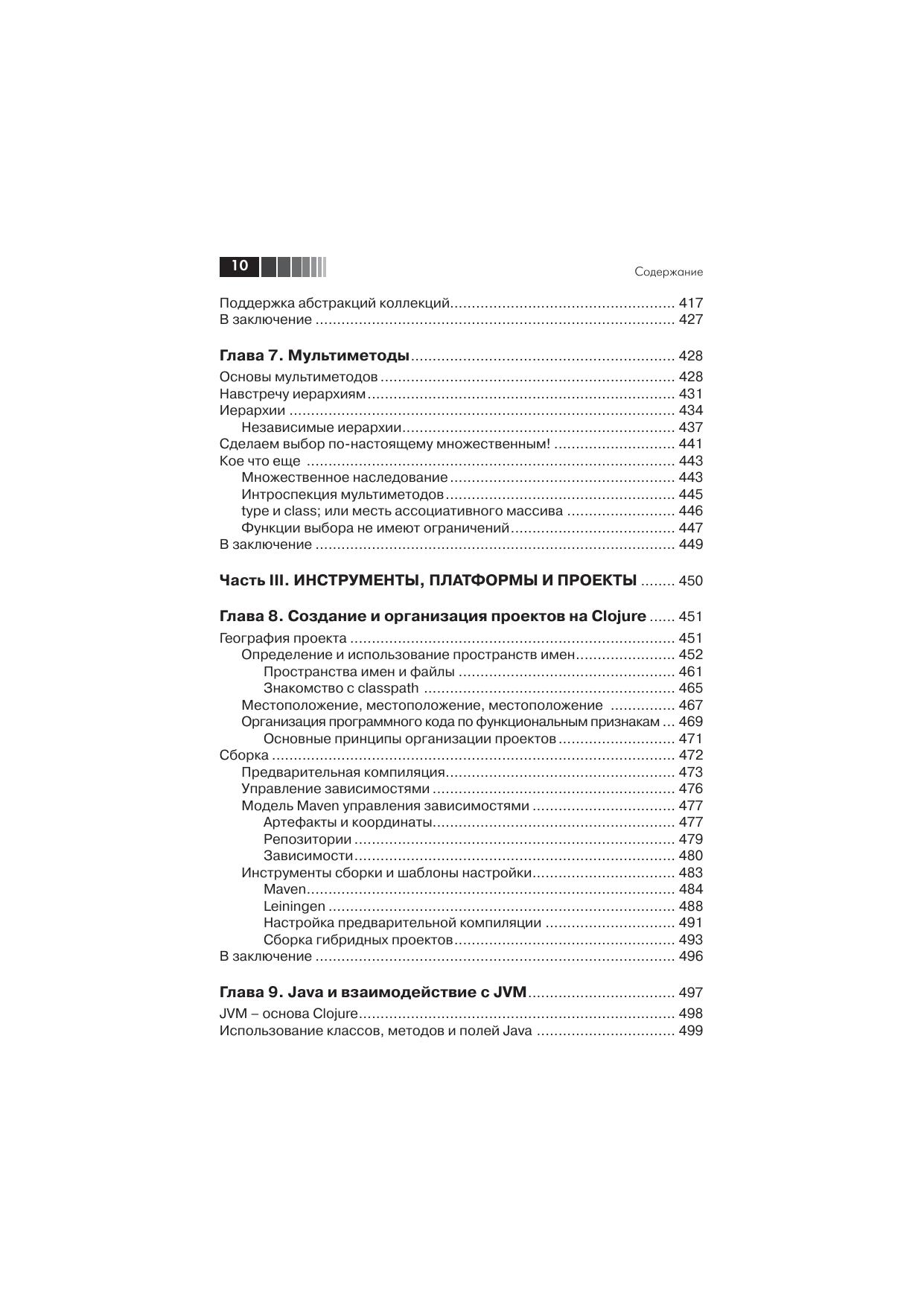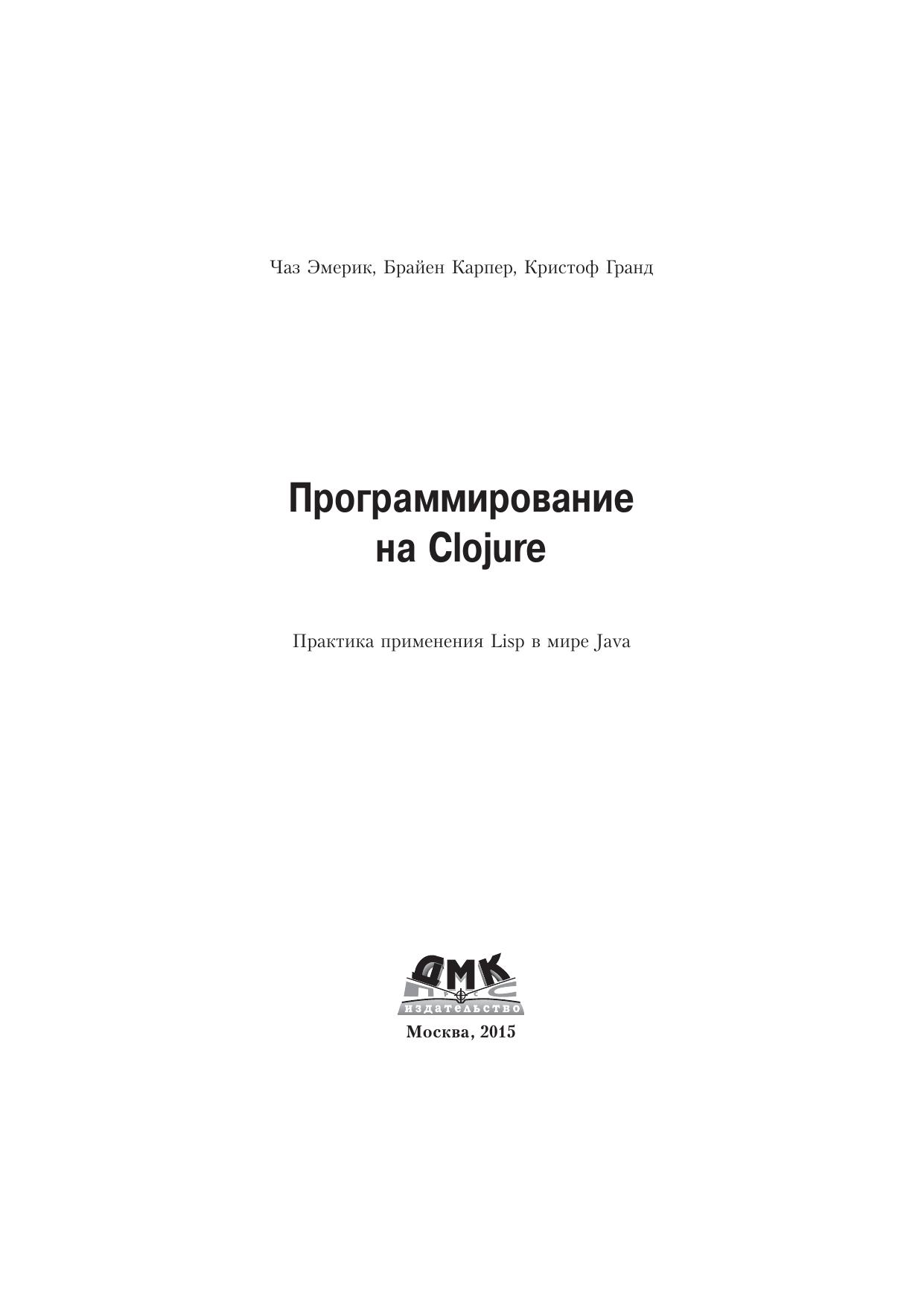 Почему многие выбирают Clojure? Потому что это функциональный язык программирования, не только позволяющий использовать Java-библиотеки, службы и другие ресурсы JVM, но и соперничающий с другими динамическими языками, такими как Ruby и Python. Эта книга продемонстрирует вам гибкость Clojure в решении типичных задач, таких как разработка веб-приложений и взаимодействие с базами данных. Вы быстро поймете, что этот язык помогает устранить ненужные сложности в своей практике и открывает новые пути решения сложных проблем, включая многопоточное программирование. Издание предназначено для программистов, желающих освоить всю мощь и гибкость функционального программирования
