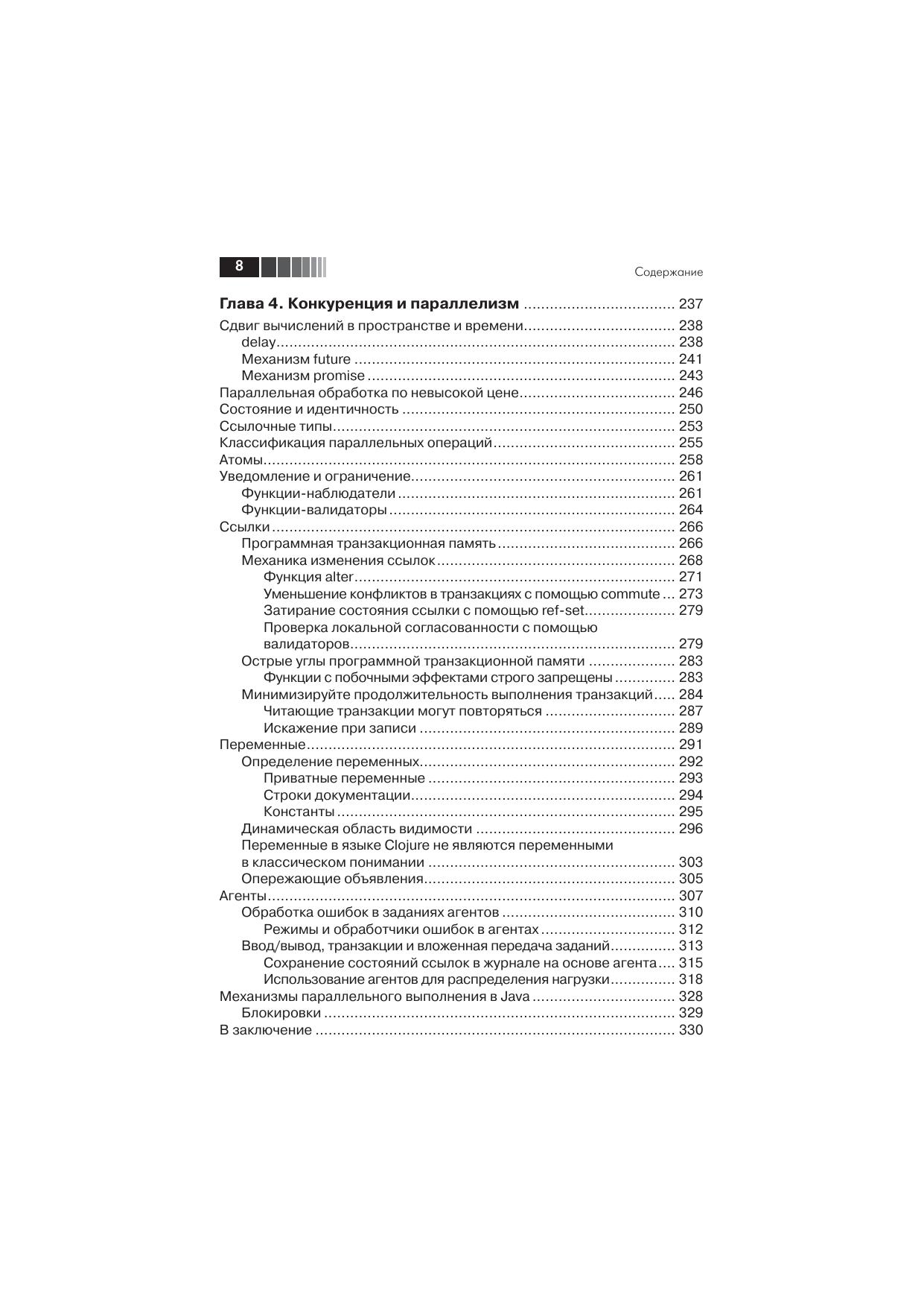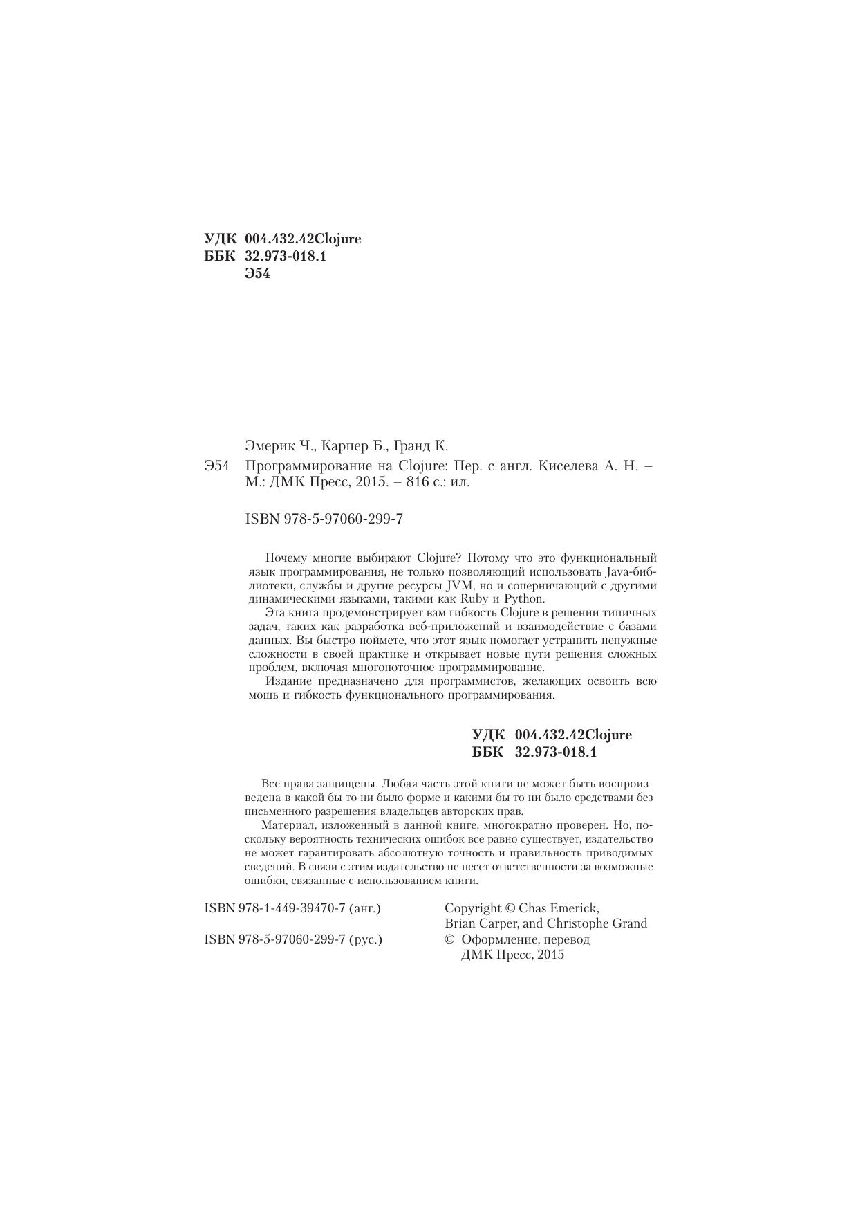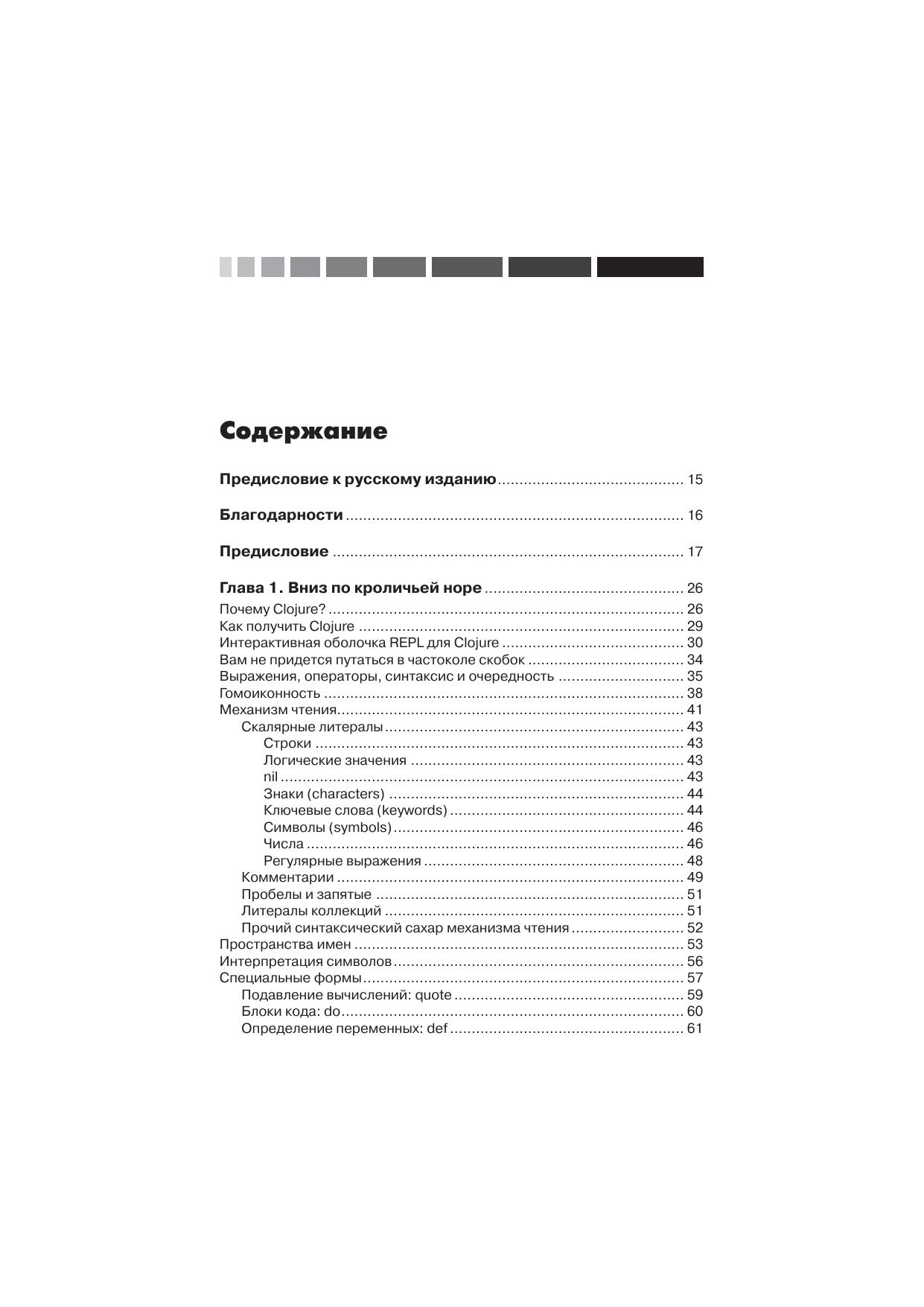 Почему многие выбирают Clojure? Потому что это функциональный язык программирования, не только позволяющий использовать Java-библиотеки, службы и другие ресурсы JVM, но и соперничающий с другими динамическими языками, такими как Ruby и Python. Эта книга продемонстрирует вам гибкость Clojure в решении типичных задач, таких как разработка веб-приложений и взаимодействие с базами данных. Вы быстро поймете, что этот язык помогает устранить ненужные сложности в своей практике и открывает новые пути решения сложных проблем, включая многопоточное программирование. Издание предназначено для программистов, желающих освоить всю мощь и гибкость функционального программирования