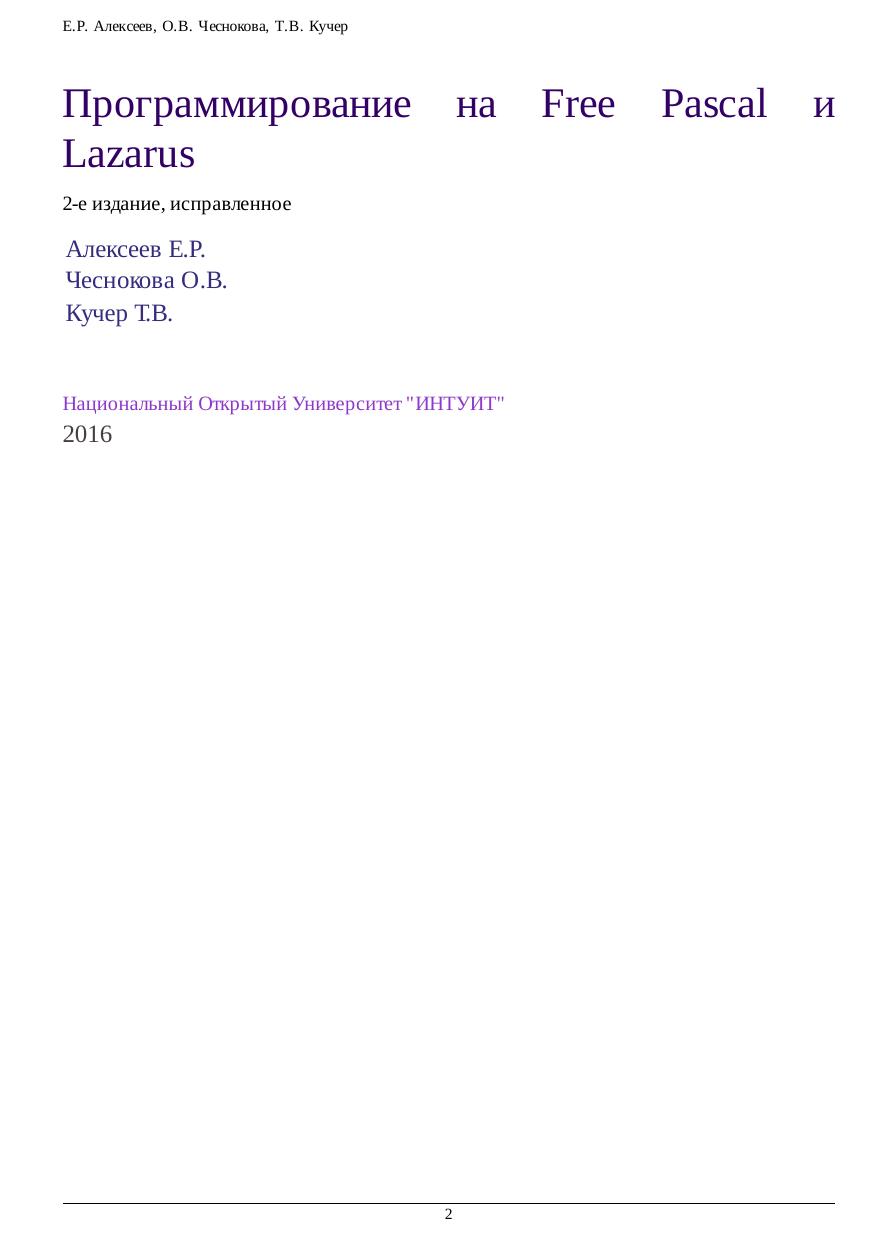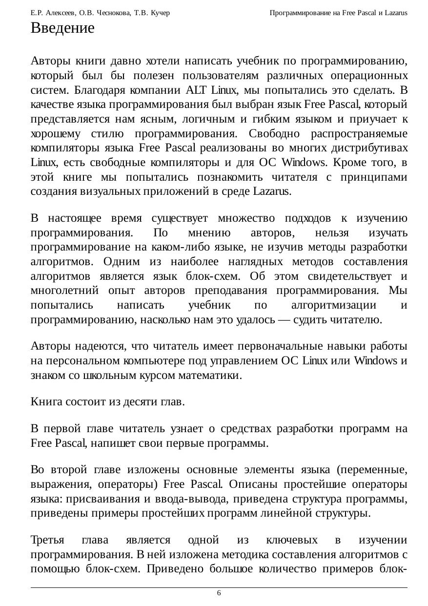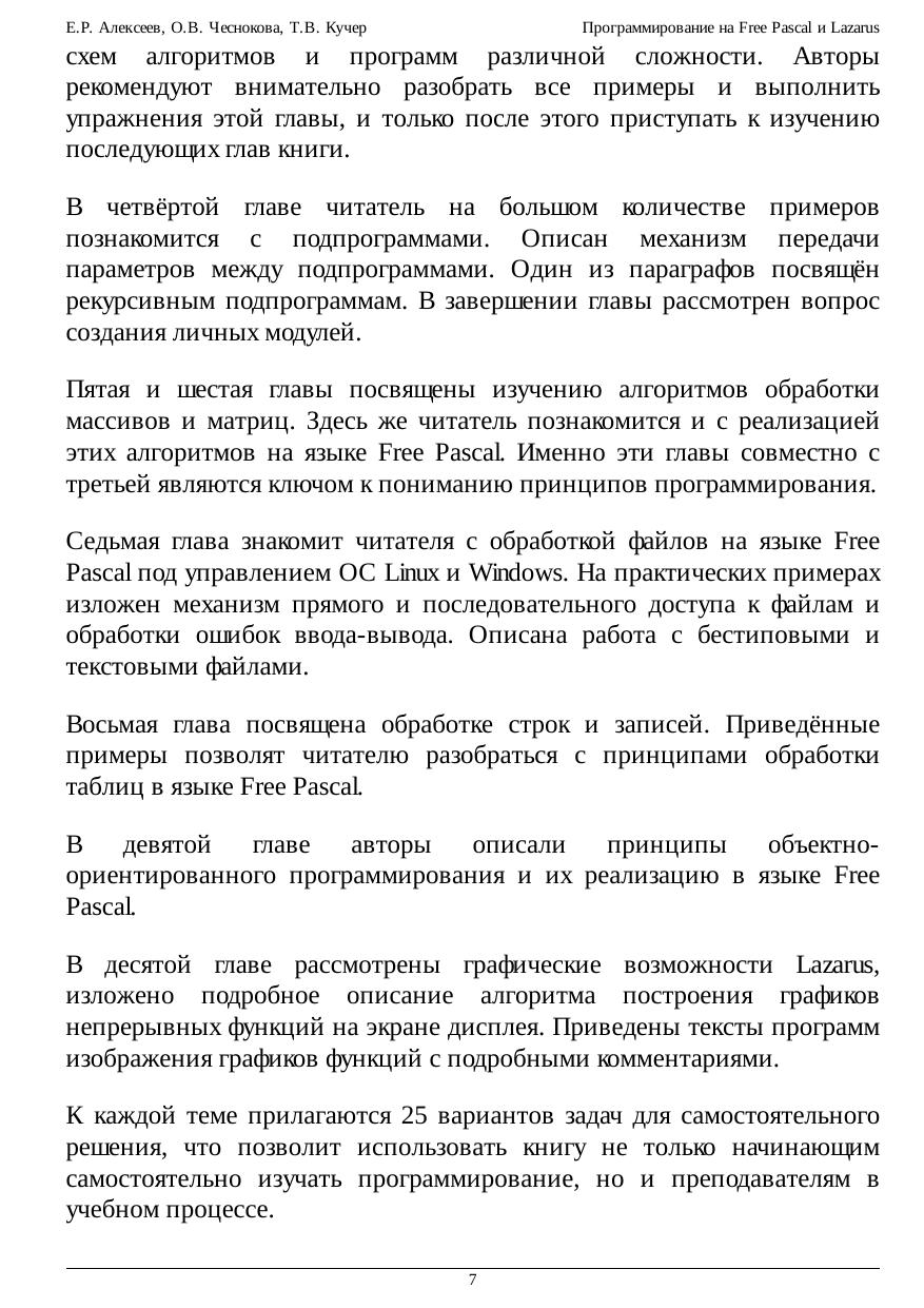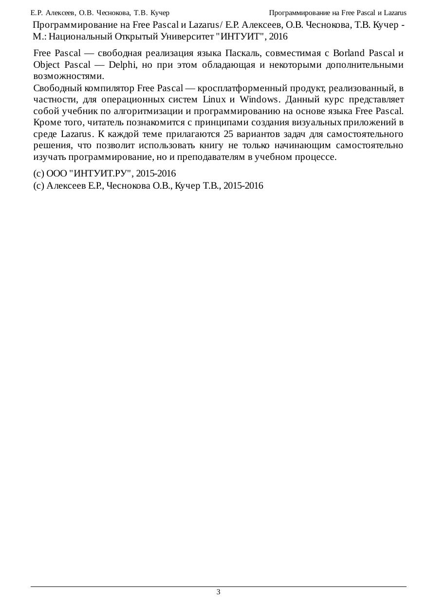 Free Pascal — свободная реализация языка Паскаль, совместимая с Borland Pascal и Object Pascal — Delphi, но при этом обладающая и некоторыми дополнительными возможностями. Свободный компилятор Free Pascal — кросплатформенный продукт, реализованный, в частности, для операционных систем Linux и Windows. Данный курс представляет собой учебник по алгоритмизации и программированию на основе языка Free Pascal. Кроме того, читатель познакомится с принципами создания визуальных приложений в среде Lazarus. К каждой теме прилагаются 25 вариантов задач для самостоятельного решения, что позволит использовать книгу не только начинающим самостоятельно изучать программирование, но и преподавателям в учебном процессе.