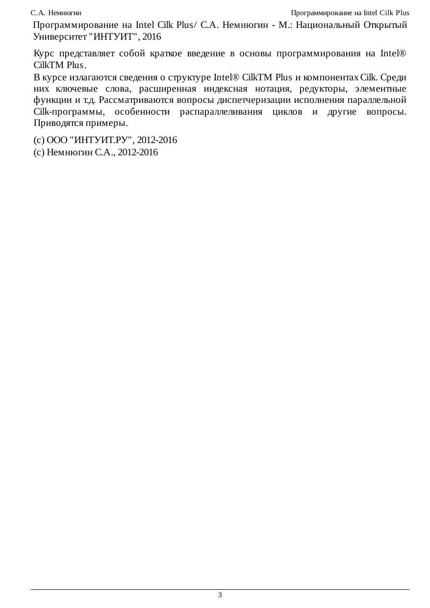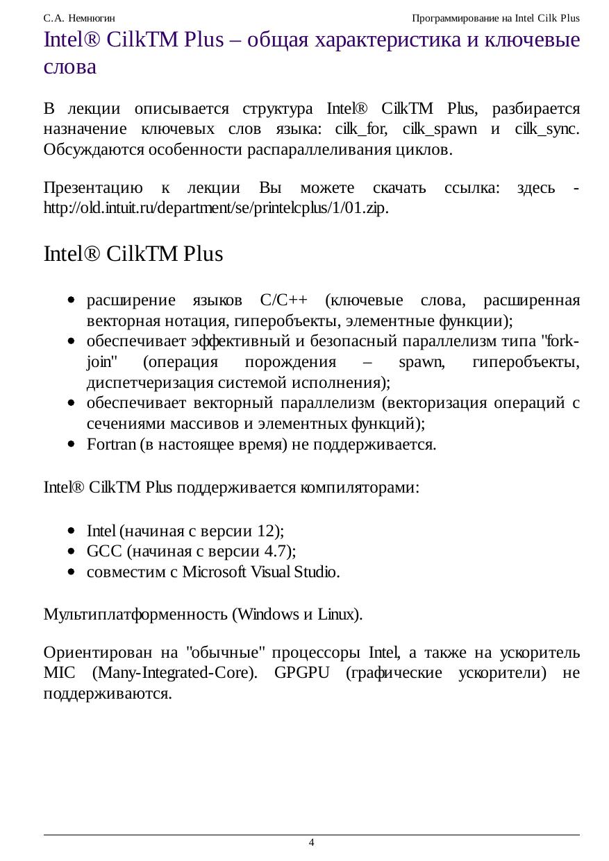 Курс представляет собой краткое введение в основы программирования на Intel® CilkTM Plus. В курсе излагаются сведения о структуре Intel® CilkTM Plus и компонентах Cilk. Среди них ключевые слова, расширенная индексная нотация, редукторы, элементные функции и т.д. Рассматриваются вопросы диспетчеризации исполнения параллельной Cilk-программы, особенности распараллеливания циклов и другие вопросы. Приводятся примеры.