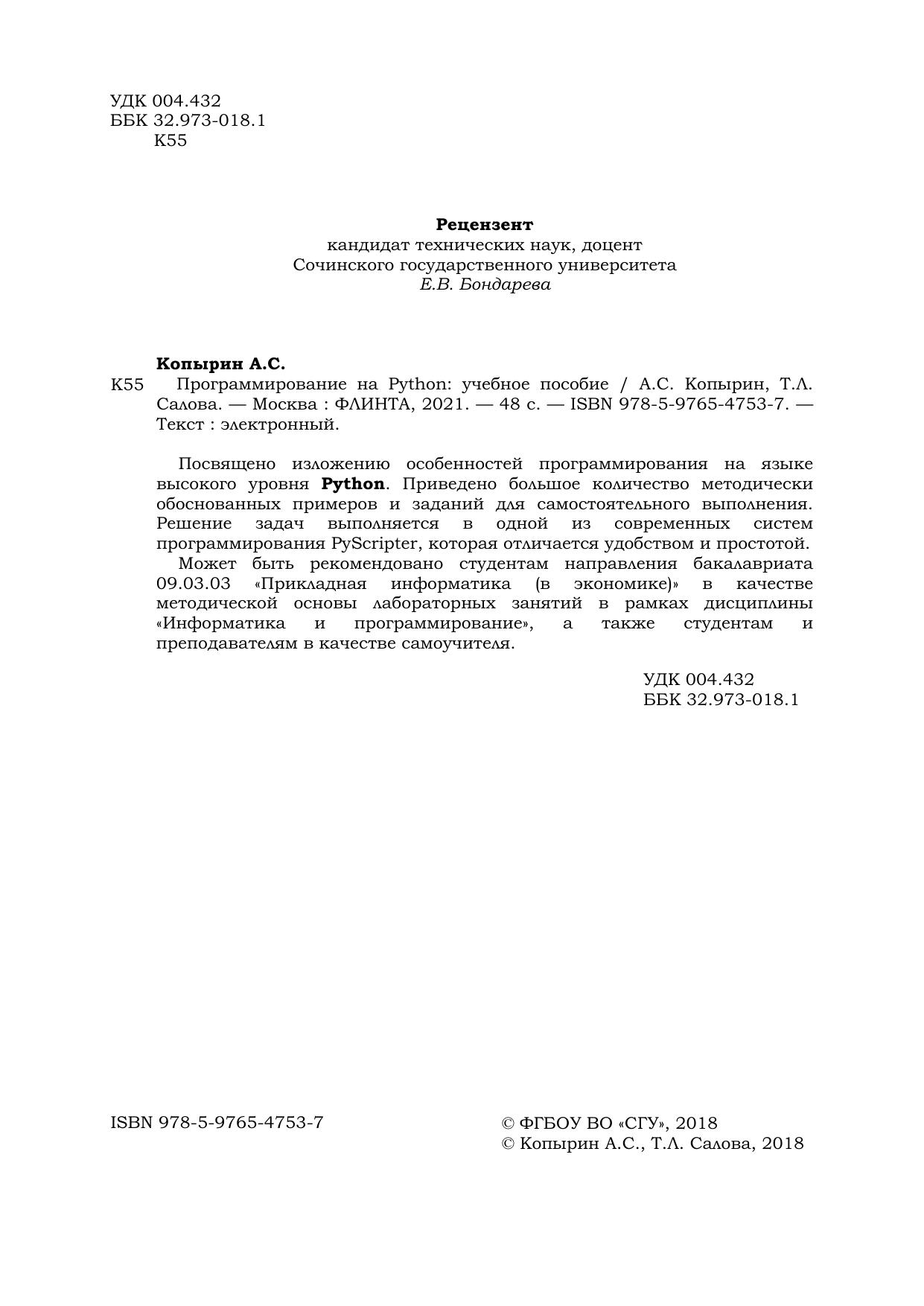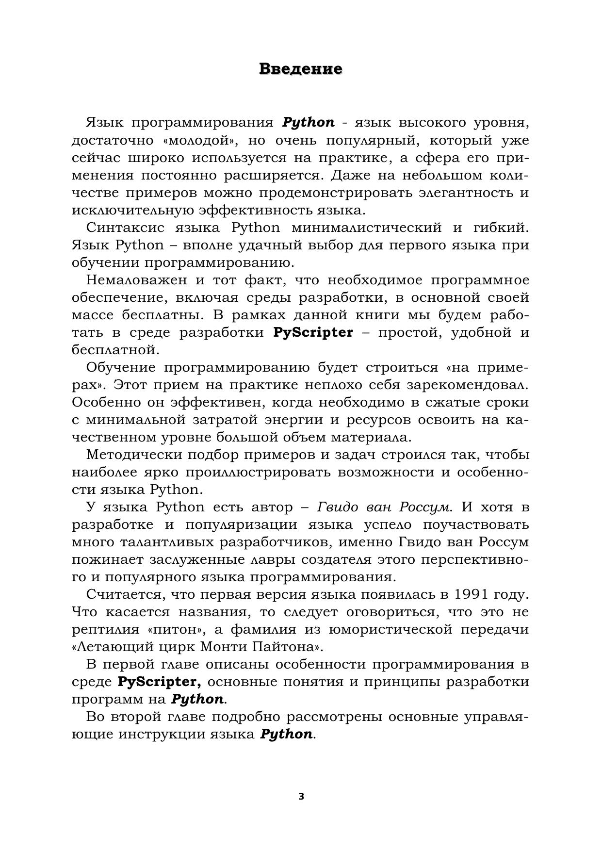 Посвящено изложению особенностей программирования на языке высокого уровня Python. Приведено большое количество методически обоснованных примеров и заданий для самостоятельного выполнения. Решение задач выполняется в одной из современных систем программирования PyScripter, которая отличается удобством и простотой.