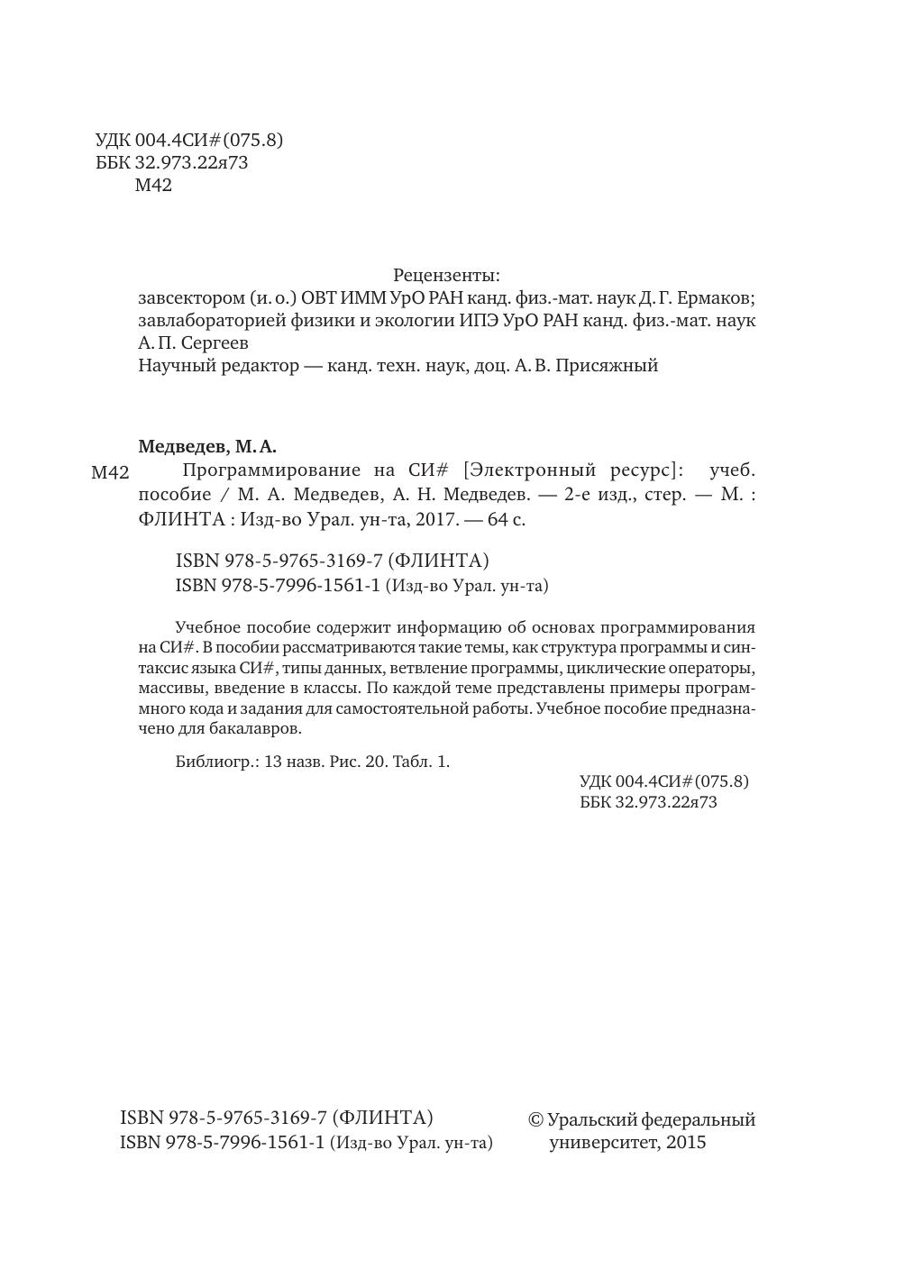 Учебное пособие содержит информацию об основах программирования на СИ#. В пособии рассматриваются такие темы, как структура программы и синтаксис языка СИ#, типы данных, ветвление программы, циклические операторы, массивы, введение в классы. По каждой теме представлены примеры программного кода и задания для самостоятельной работы. Учебное пособие предназначено для бакалавров.