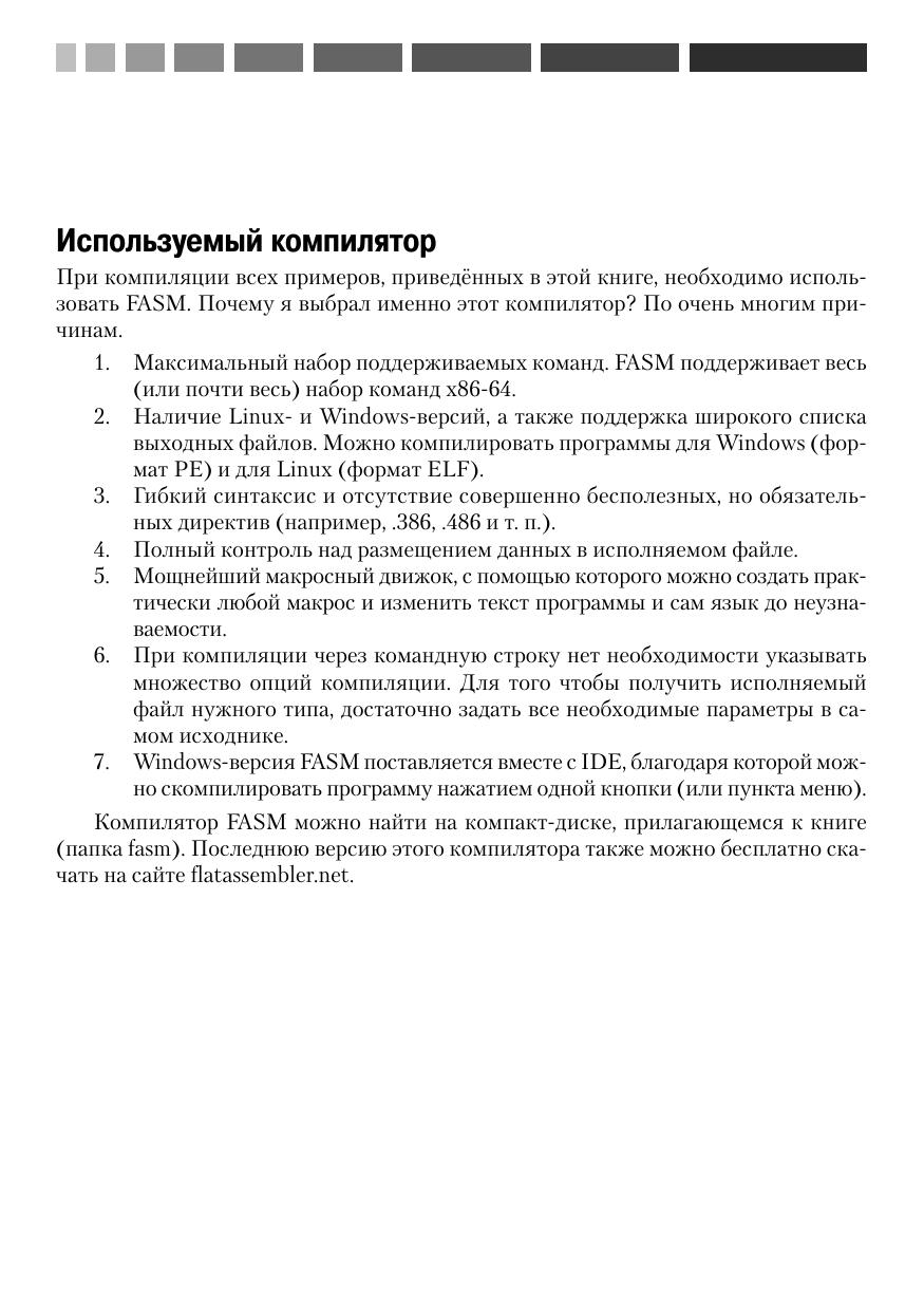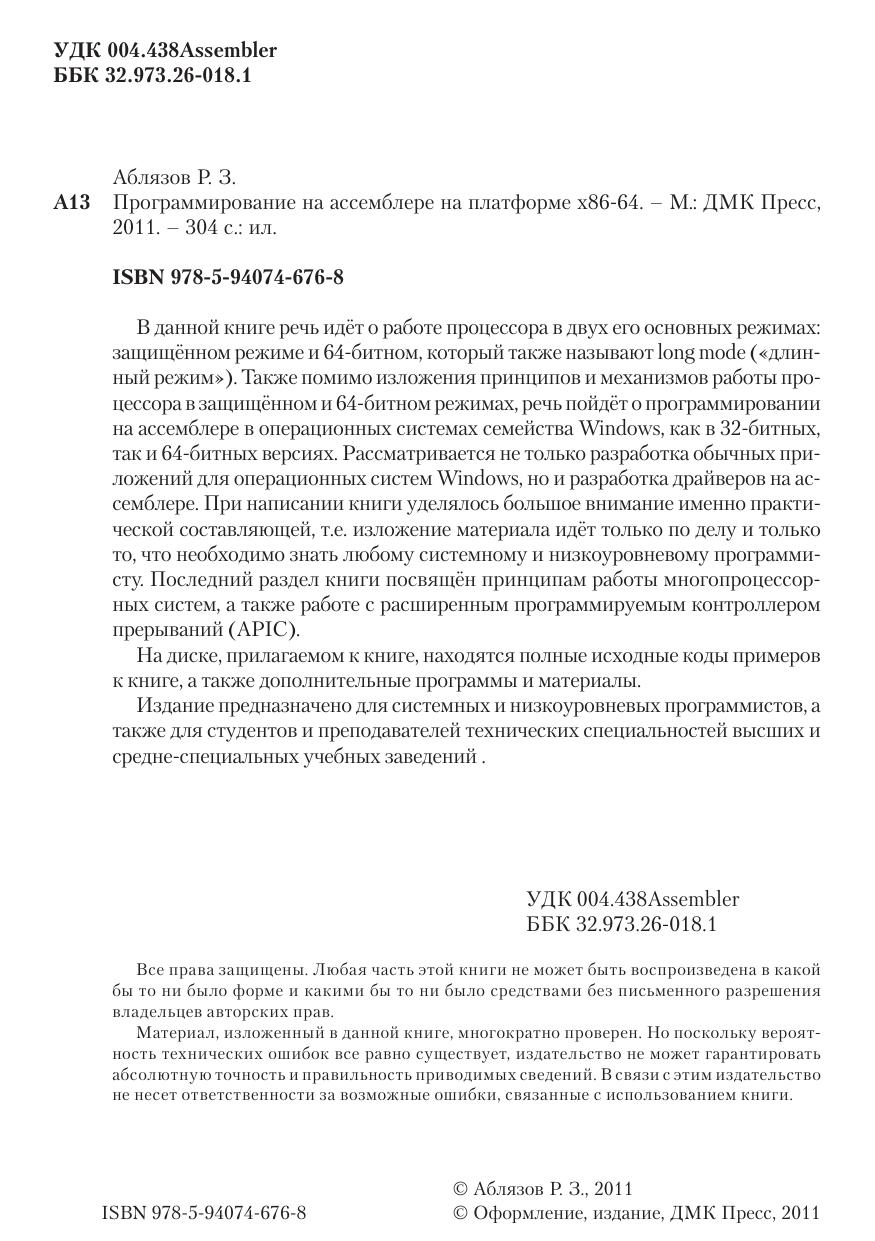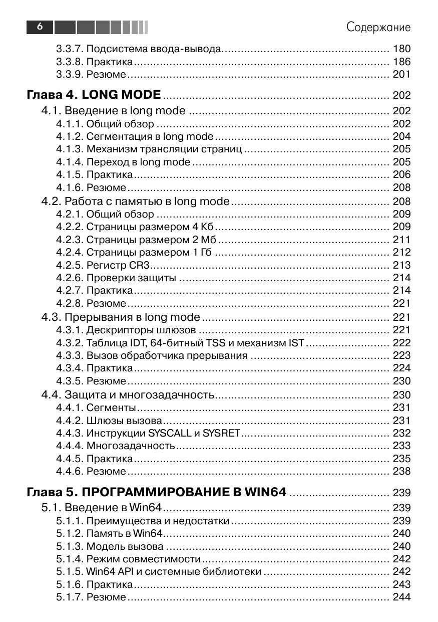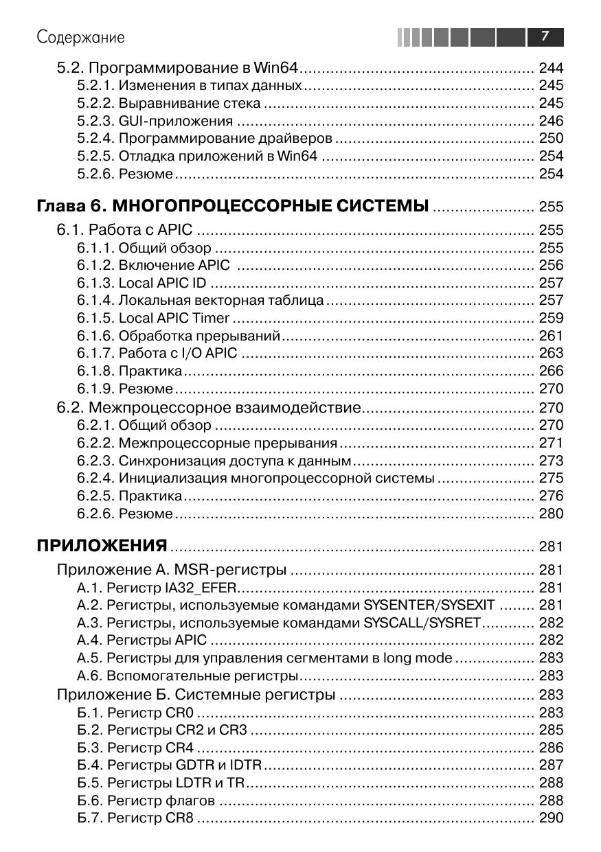 В данной книге речь идёт о работе процессора в двух его основных режимах: защищённом режиме и 64-битном, который также называют long mode («длинный режим»). Также помимо изложения принципов и механизмов работы процессора в защищённом и 64-битном режимах, речь пойдёт о программировании на ассемблере в операционных системах семейства Windows, как в 32-битных, так и 64-битных версиях. Рассматривается не только разработка обычных приложений для операционных систем Windows, но и разработка драйверов на ассемблере. При написании книги уделялось большое внимание именно практической составляющей, т.е. изложение материала идёт только по делу и только то, что необходимо знать любому системному и низкоуровневому программисту. Последний раздел книги посвящён принципам работы многопроцессорных систем, а также работе с расширенным программируемым контроллером прерываний (APIC). Издание предназначено для системных и низкоуровневых программистов, а также для студентов и преподавателей технических специальностей высших и средне-специальных учебных заведений.