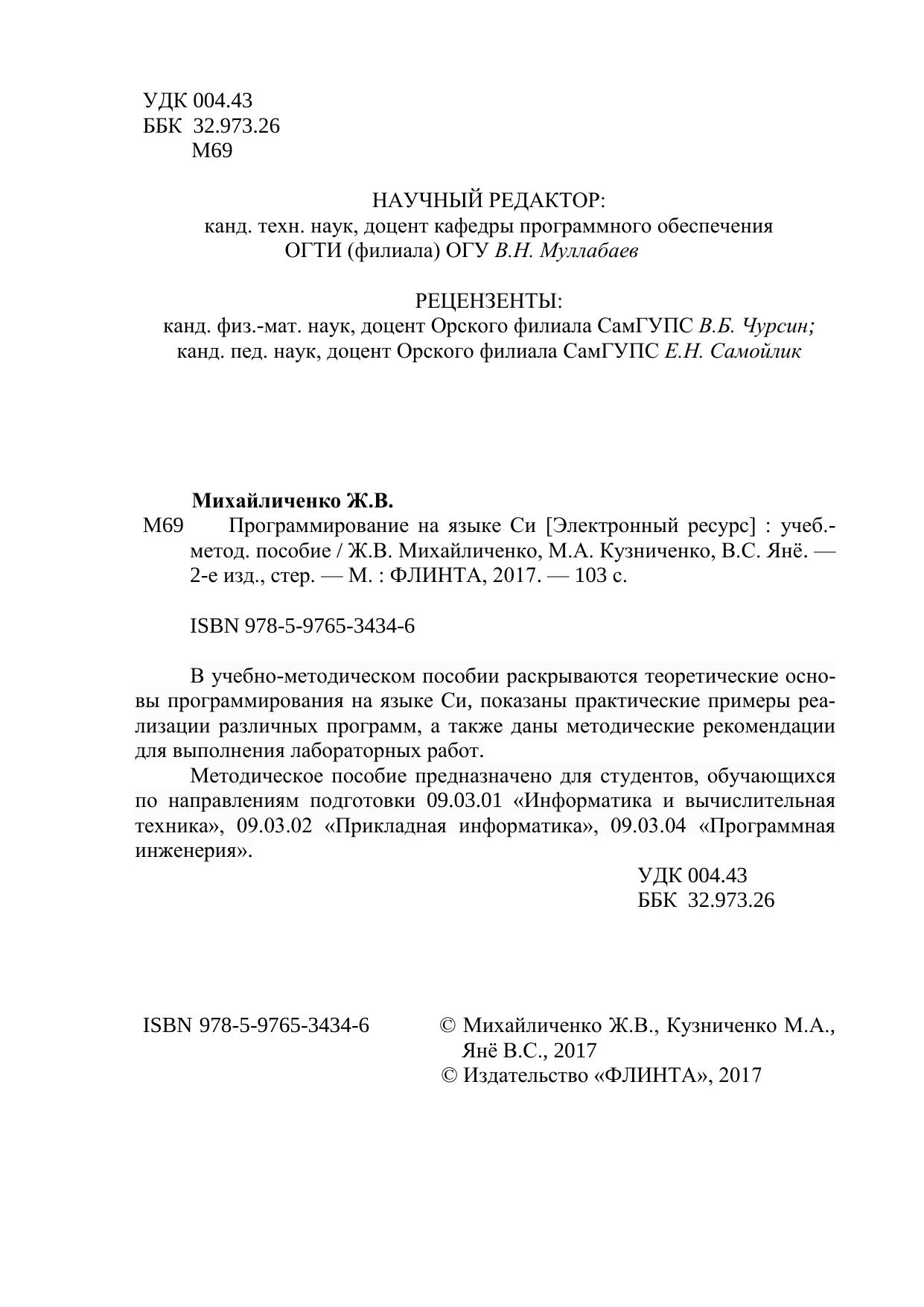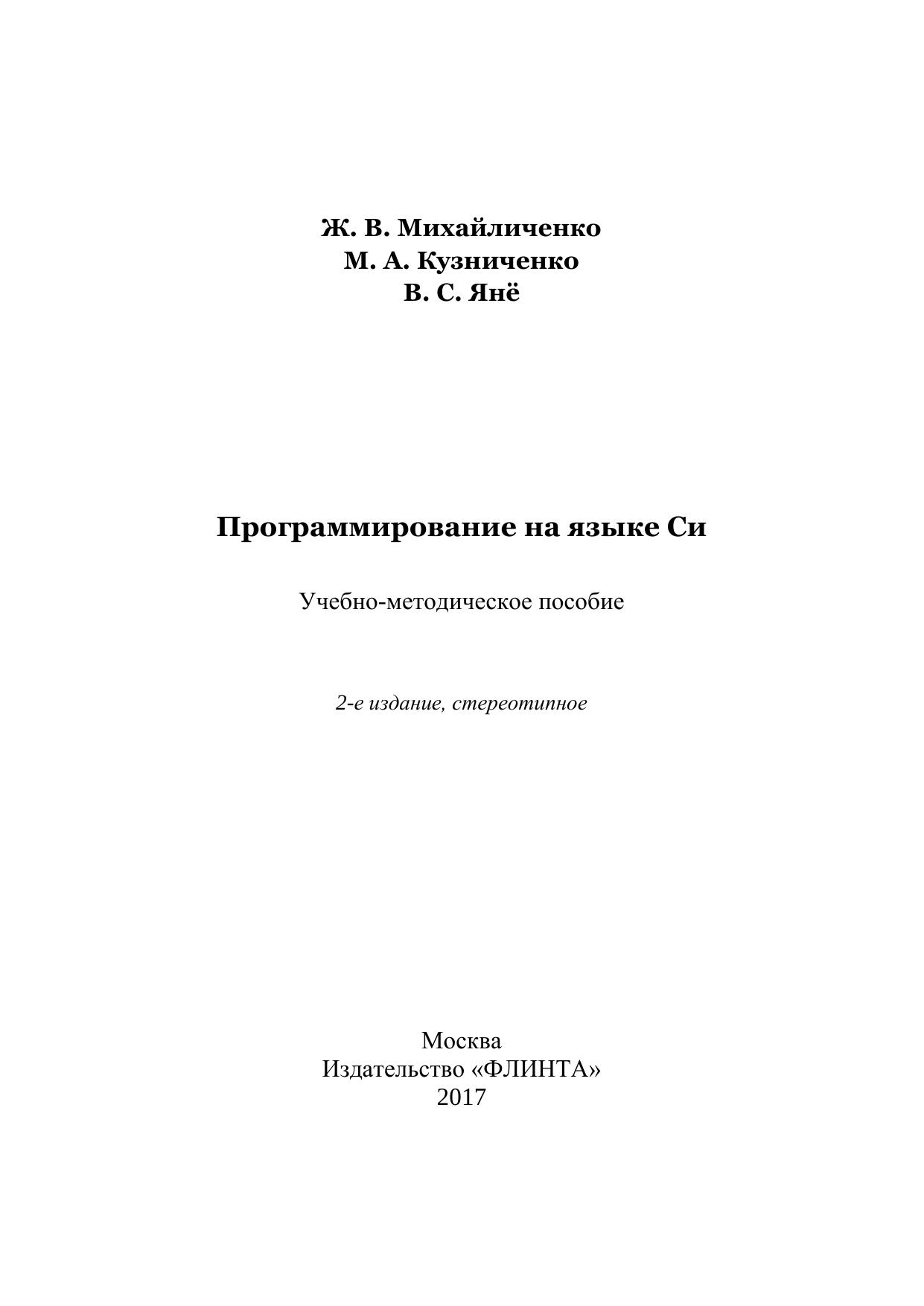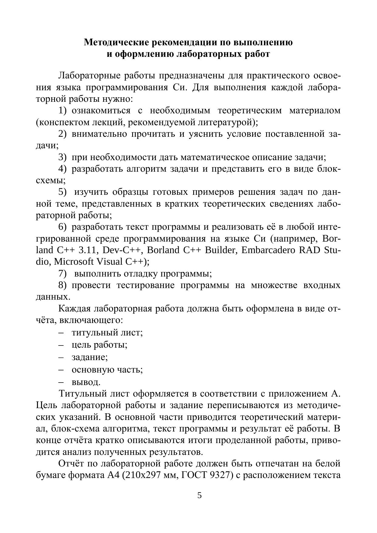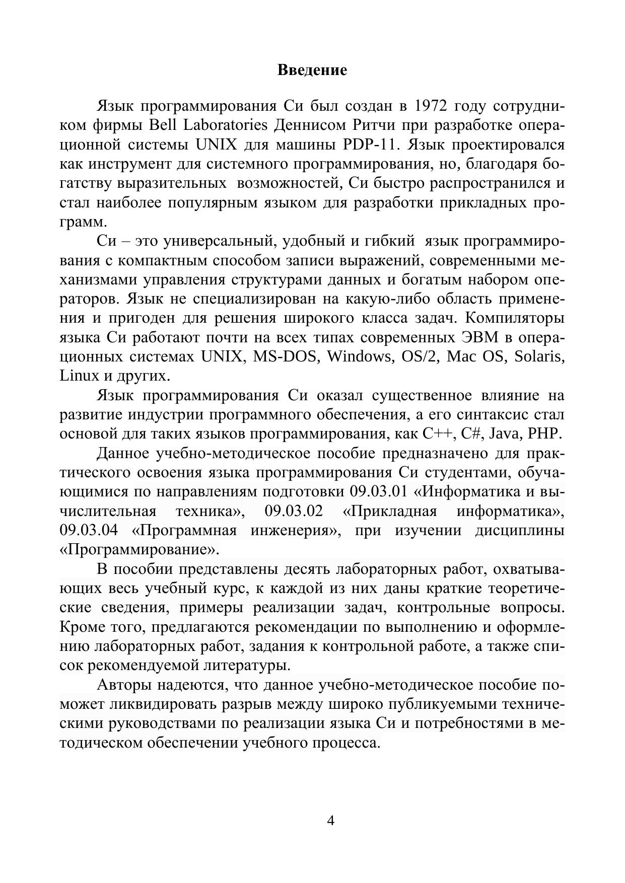 В учебно-методическом пособии раскрываются теоретические основы программирования на языке Си, показаны практические примеры реализации различных программ, а также даны методические рекомендации для выполнения лабораторных работ. Методическое пособие предназначено для студентов, обучающихся по направлениям подготовки 09.03.01 «Информатика и вычислительная техника», 09.03.02 «Прикладная информатика», 09.03.04 «Программная инженерия».
