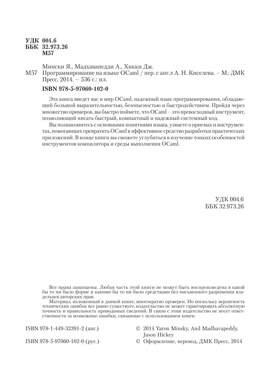 Эта книга введет вас в мир OCaml, надежный язык программирования, обладающий большой выразительностью, безопасностью и быстродействием. Пройдя через множество примеров, вы быстро поймете, что OCaml – это превосходный инструмент, позволяющий писать быстрый, компактный и надежный системный код. Вы познакомитесь с основными понятиями языка, узнаете о приемах и инструментах, помогающих превратить OCaml в эффективное средство разработки практических приложений. В конце книги вы сможете углубиться в изучение тонких особенностей инструментов компилятора и среды выполнения OCaml.