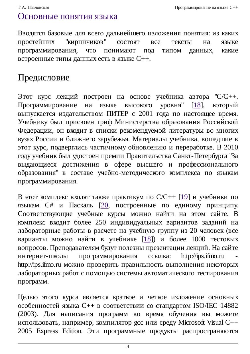 В курсе изучаются основы программирования на языке C++. В лекциях кратко изложены основные особенности языка С++ в соответствии со стандартом ISO/IEC 14882 (2003). Для написания программ во время обучения можно использовать, компилятор gcc или среду Microsoft Visual C++ 2005 Express Edition.