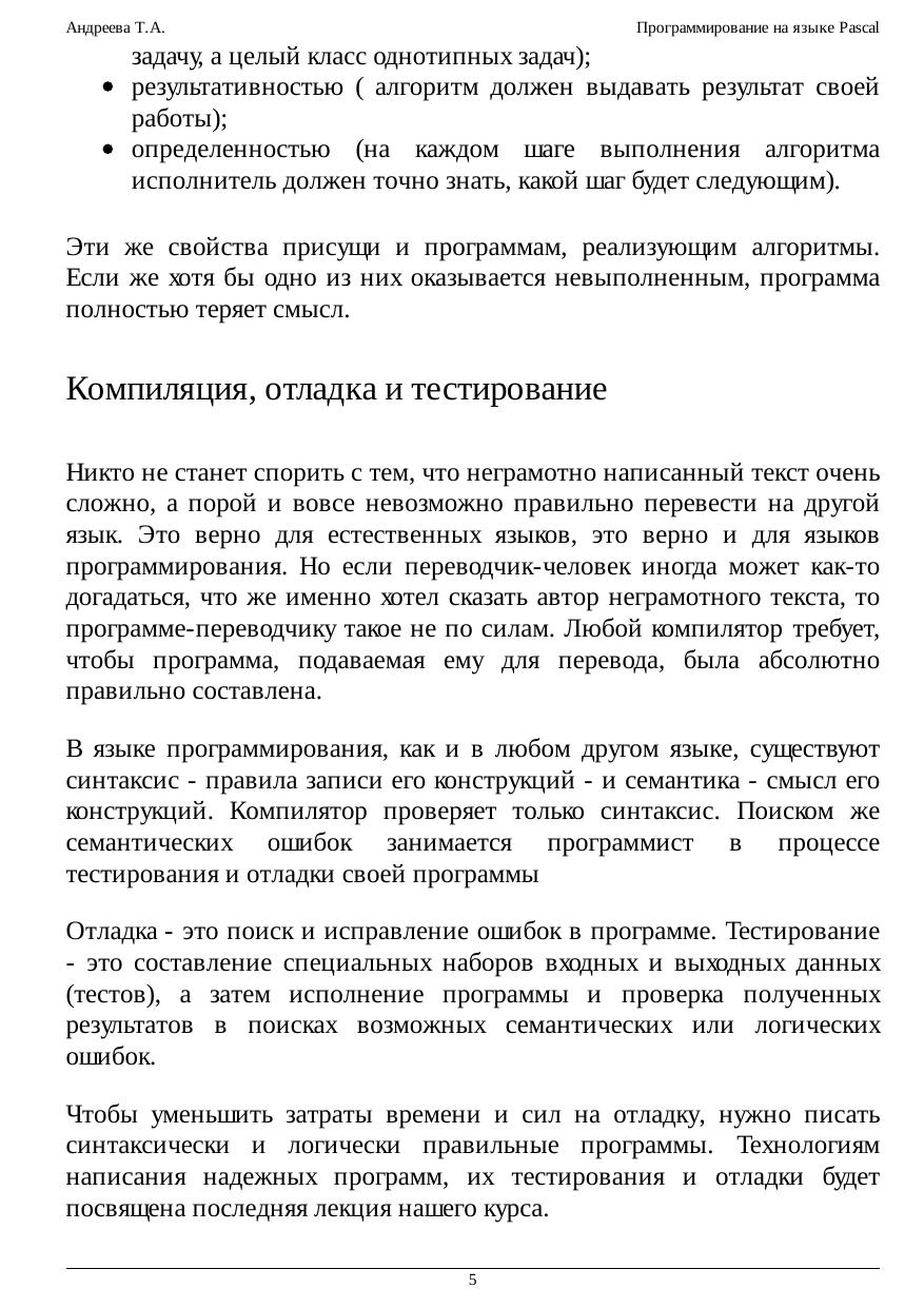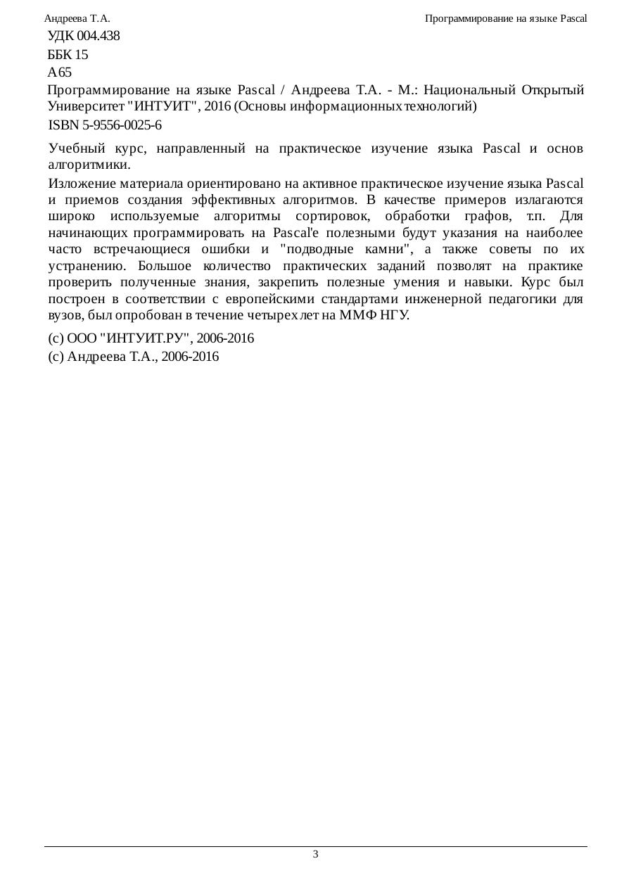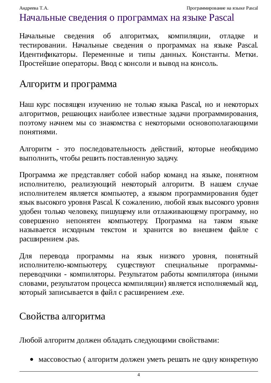 Учебный курс, направленный на практическое изучение языка Pascal и основ алгоритмики. Изложение материала ориентировано на активное практическое изучение языка Pascal и приемов создания эффективных алгоритмов. В качестве примеров излагаются широко используемые алгоритмы сортировок, обработки графов, т.п. Для начинающих программировать на Pascal'e полезными будут указания на наиболее часто встречающиеся ошибки и "подводные камни", а также советы по их устранению. Большое количество практических заданий позволят на практике проверить полученные знания, закрепить полезные умения и навыки. Курс был построен в соответствии с европейскими стандартами инженерной педагогики для вузов, был опробован в течение четырех лет на ММФ НГУ.