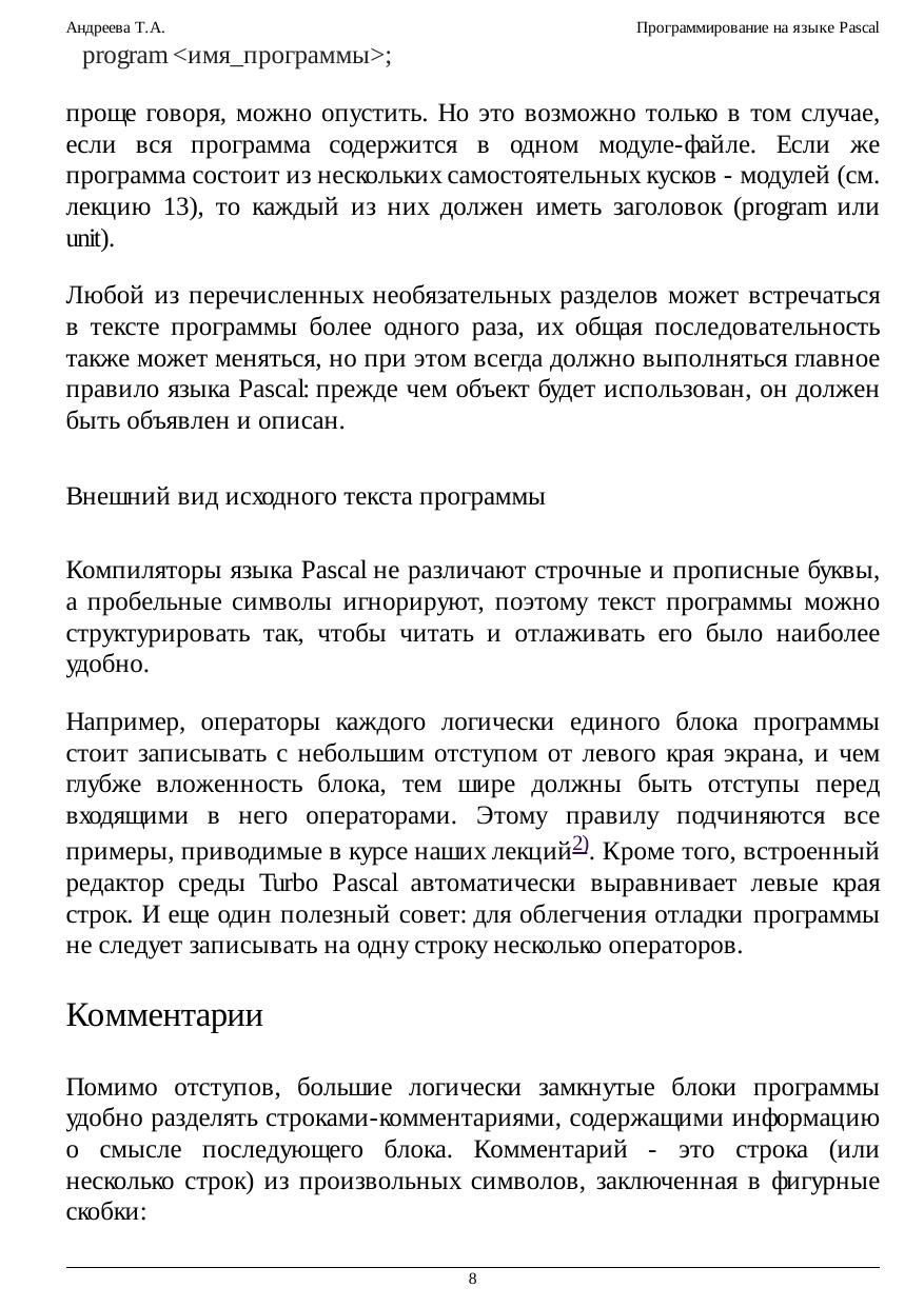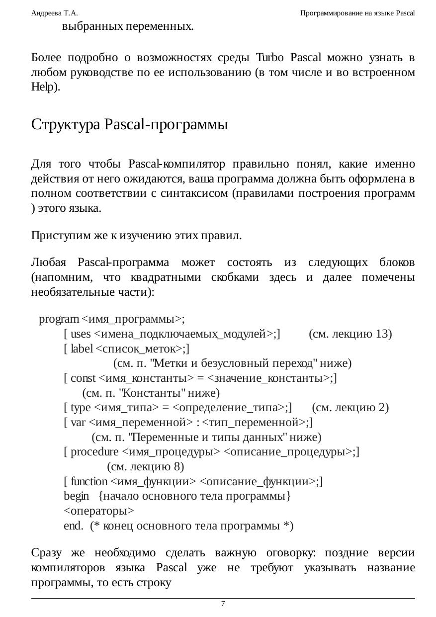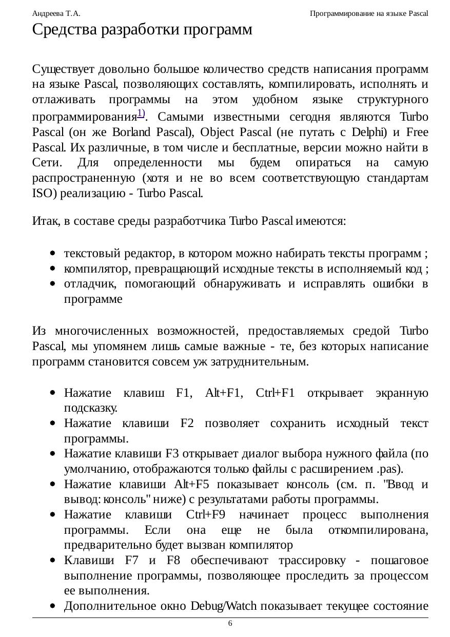Учебный курс, направленный на практическое изучение языка Pascal и основ алгоритмики. Изложение материала ориентировано на активное практическое изучение языка Pascal и приемов создания эффективных алгоритмов. В качестве примеров излагаются широко используемые алгоритмы сортировок, обработки графов, т.п. Для начинающих программировать на Pascal'e полезными будут указания на наиболее часто встречающиеся ошибки и "подводные камни", а также советы по их устранению. Большое количество практических заданий позволят на практике проверить полученные знания, закрепить полезные умения и навыки. Курс был построен в соответствии с европейскими стандартами инженерной педагогики для вузов, был опробован в течение четырех лет на ММФ НГУ.