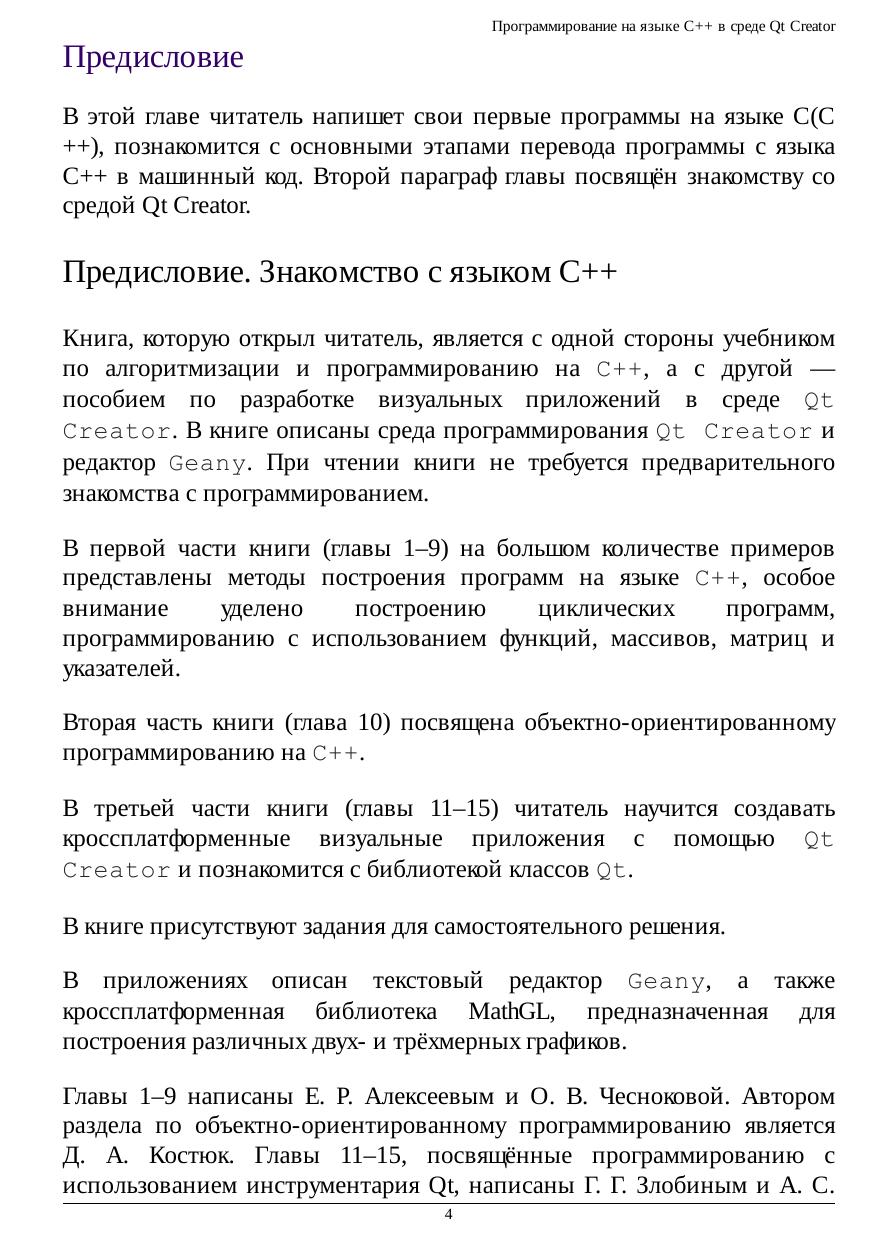 Курс по алгоритмизации и программированию на С++ по разработке визуальных приложений в среде Qt Creator. В курсе описаны среда программирования Qt Creator, редактор Geany, кроссплатформенная билиотека построения графиков MathGL. При изучении курса не требуется предварительного знакомства с программированием.