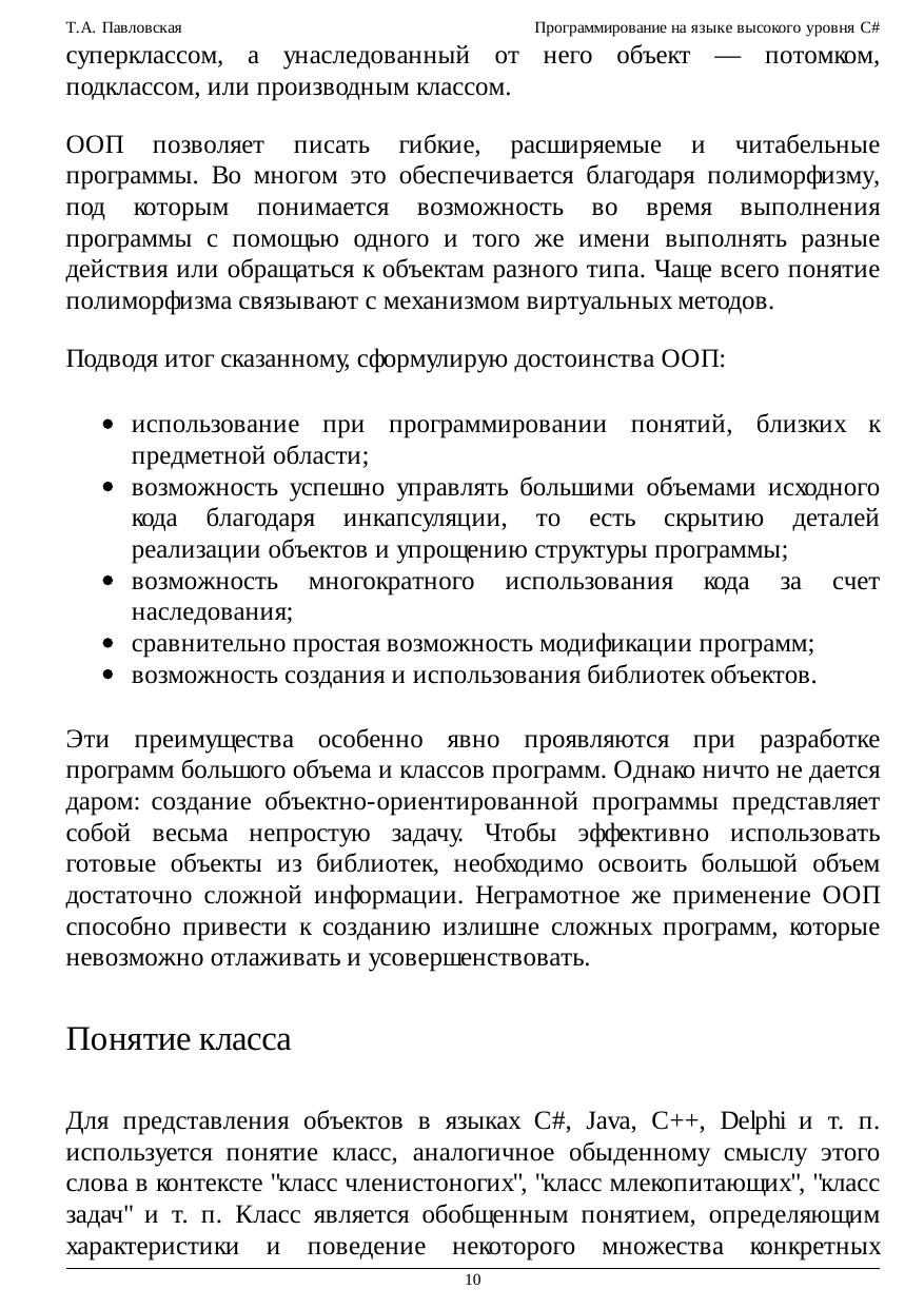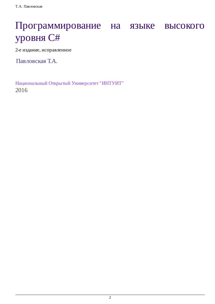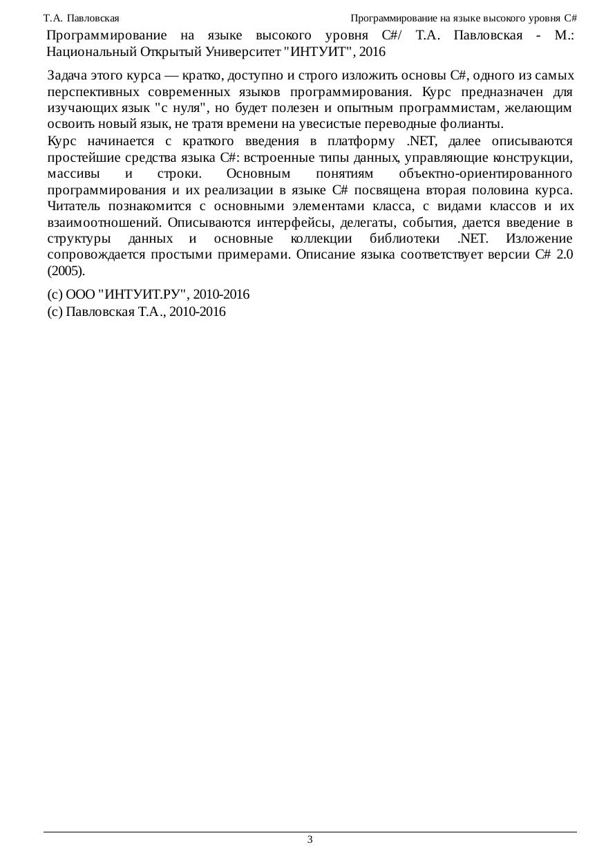 Задача этого курса — кратко, доступно и строго изложить основы C#, одного из самых перспективных современных языков программирования. Курс предназначен для изучающих язык "с нуля", но будет полезен и опытным программистам, желающим освоить новый язык, не тратя времени на увесистые переводные фолианты. Курс начинается с краткого введения в платформу .NET, далее описываются простейшие средства языка C#: встроенные типы данных, управляющие конструкции, массивы и строки. Основным понятиям объектно-ориентированного программирования и их реализации в языке C# посвящена вторая половина курса. Читатель познакомится с основными элементами класса, с видами классов и их взаимоотношений. Описываются интерфейсы, делегаты, события, дается введение в структуры данных и основные коллекции библиотеки .NET. Изложение сопровождается простыми примерами. Описание языка соответствует версии C# 2.0 (2005).