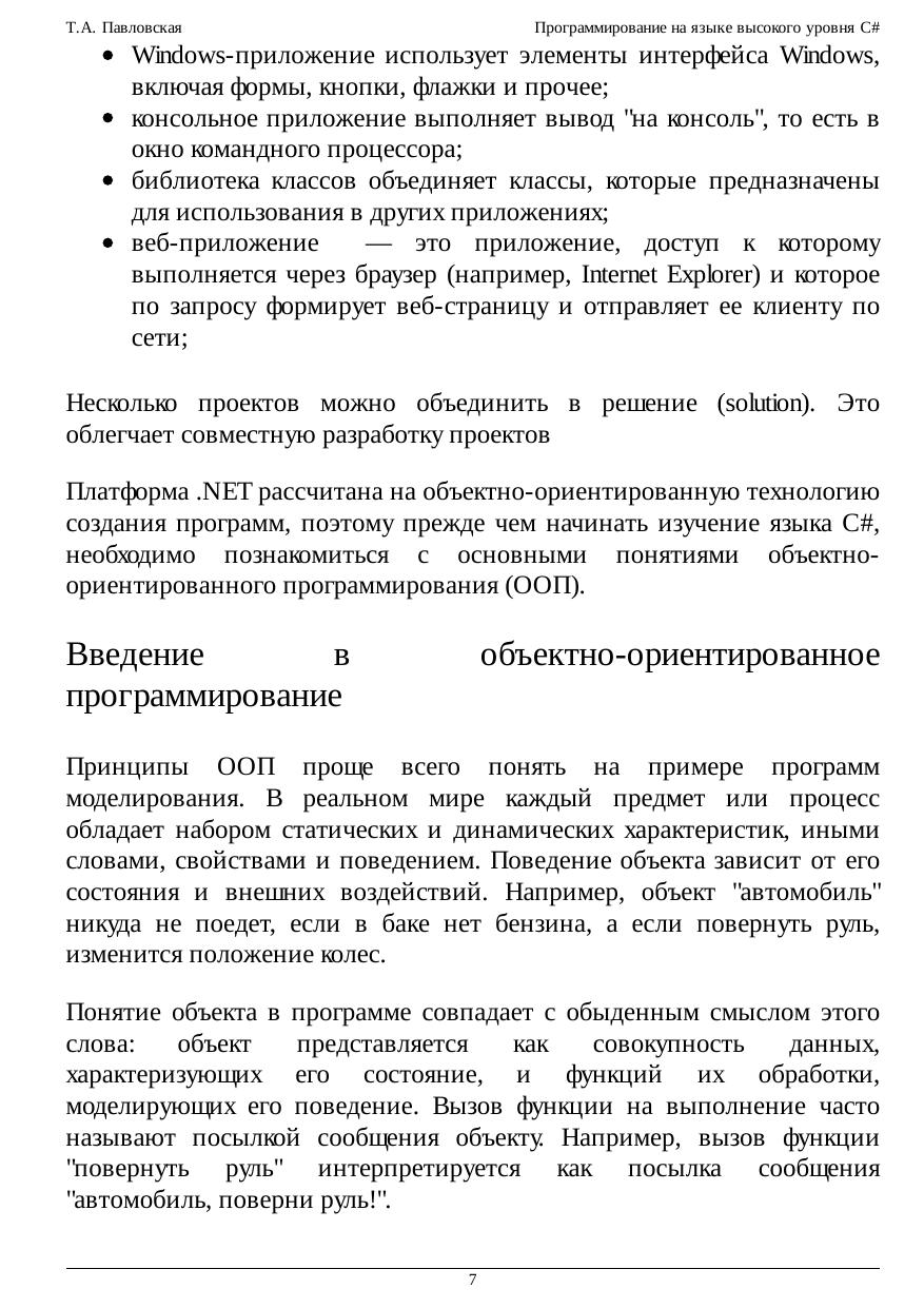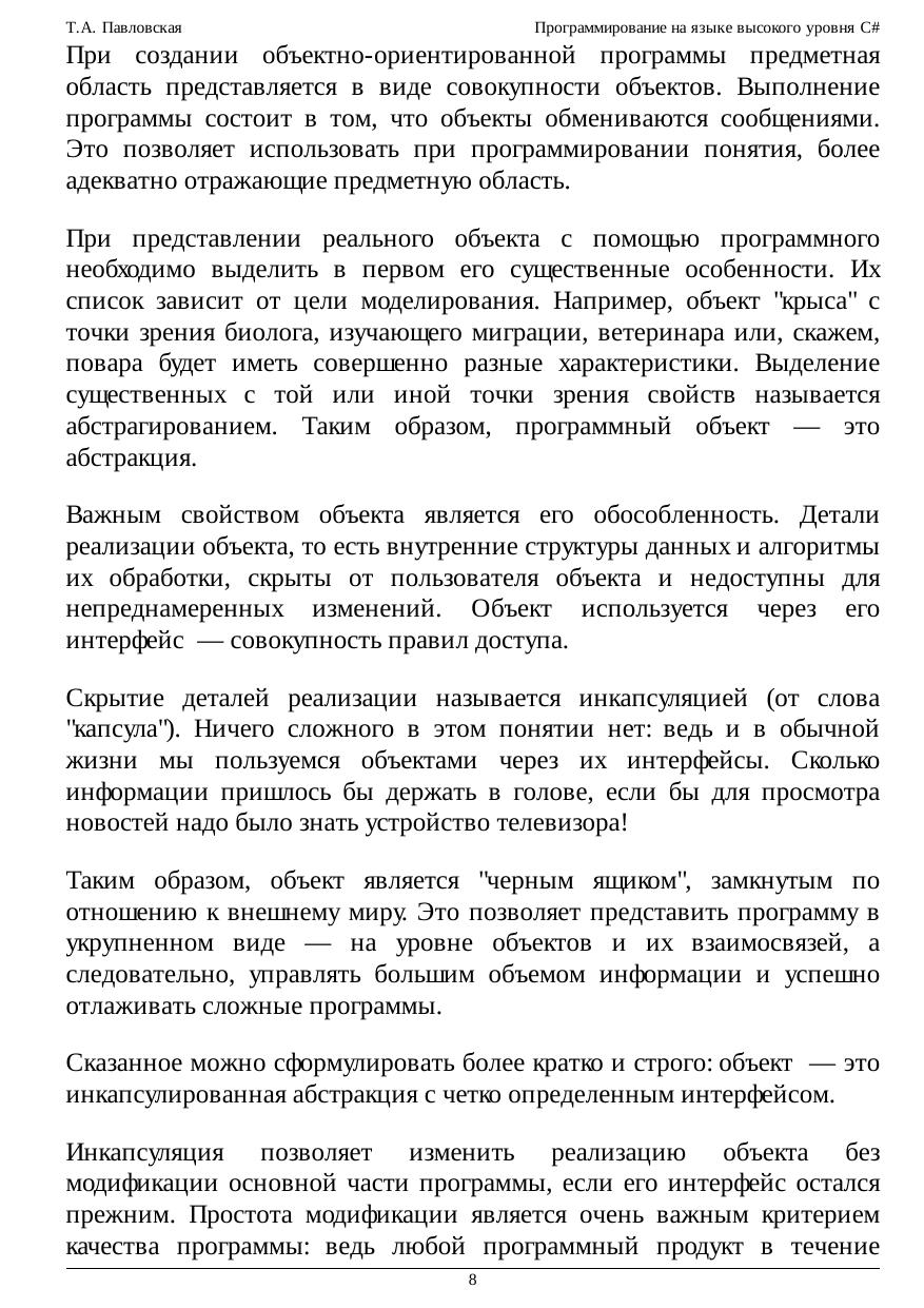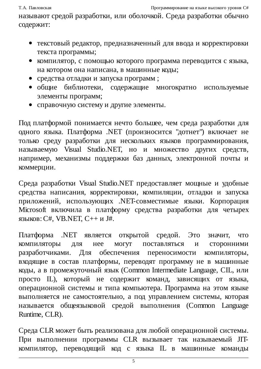 Задача этого курса — кратко, доступно и строго изложить основы C#, одного из самых перспективных современных языков программирования. Курс предназначен для изучающих язык "с нуля", но будет полезен и опытным программистам, желающим освоить новый язык, не тратя времени на увесистые переводные фолианты. Курс начинается с краткого введения в платформу .NET, далее описываются простейшие средства языка C#: встроенные типы данных, управляющие конструкции, массивы и строки. Основным понятиям объектно-ориентированного программирования и их реализации в языке C# посвящена вторая половина курса. Читатель познакомится с основными элементами класса, с видами классов и их взаимоотношений. Описываются интерфейсы, делегаты, события, дается введение в структуры данных и основные коллекции библиотеки .NET. Изложение сопровождается простыми примерами. Описание языка соответствует версии C# 2.0 (2005).
