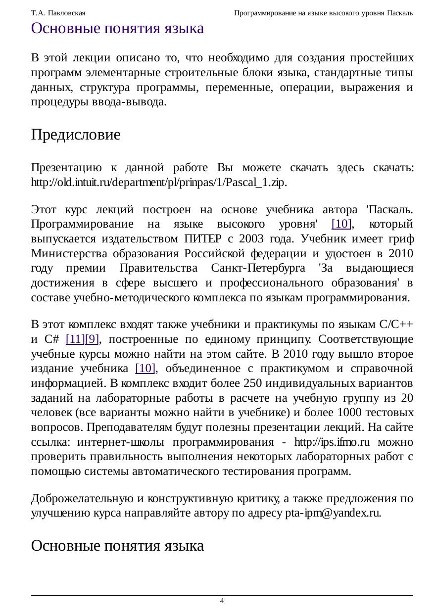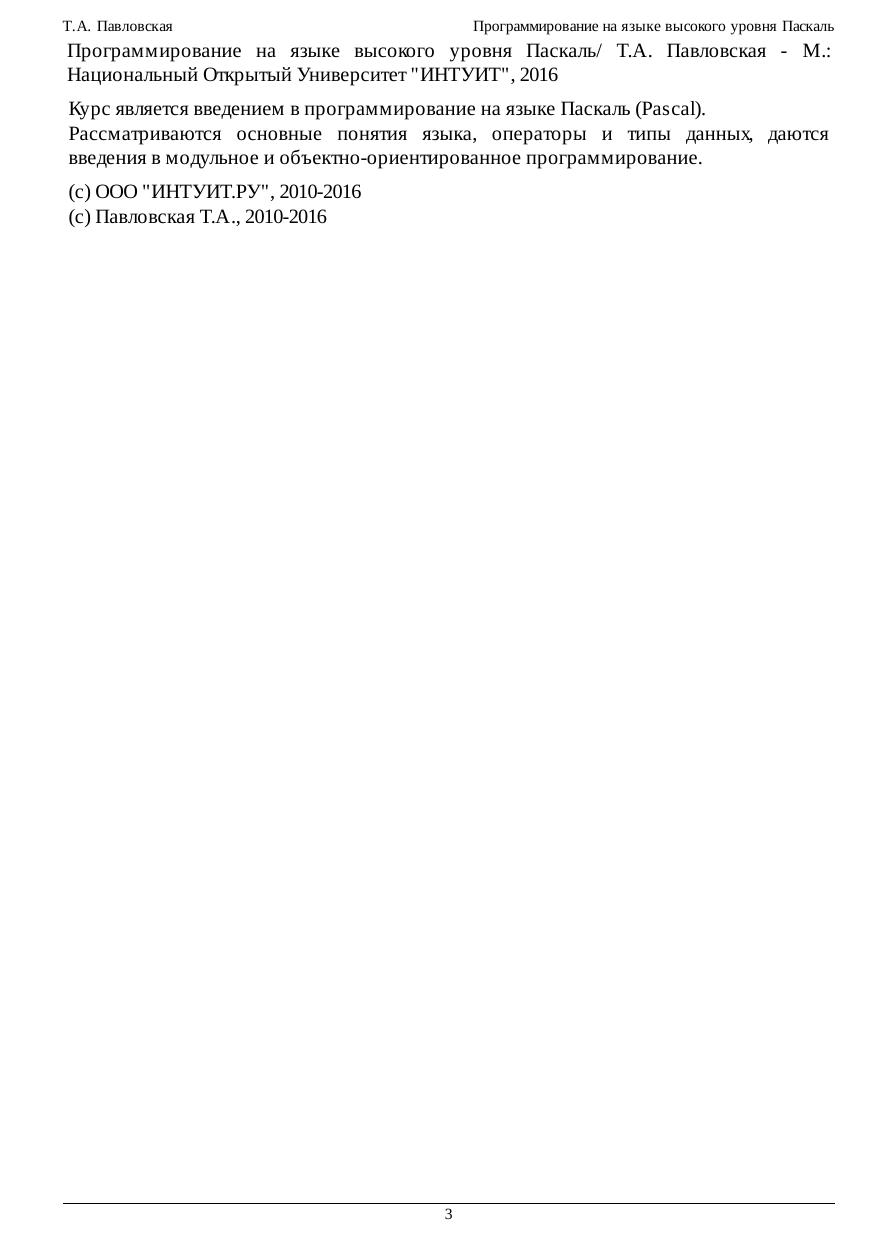 Курс является введением в программирование на языке Паскаль (Pascal). Рассматриваются основные понятия языка, операторы и типы данных, даются введения в модульное и объектно-ориентированное программирование.