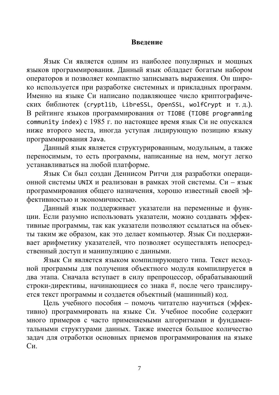 Учебное пособие предлагает читателю курс программирования, ориентированный на язык Си. Пособие содержит много примеров с часто применяемыми алгоритмами и фундаментальными структурами данных, при этом для некоторых задач приводится несколько способов решения в зависимости от начальных условий с целью повышения эффективности работы программы. Большое внимание уделено алгоритмам сортировок таких объектов, как массивы, матрицы, строки, файлы, списки. Также имеется большое количество задач для отработки основных приемов программирования на языке Си. Целью данного учебного пособия является не только познакомить читателя с языком Си, но и показать тонкости данного языка, а также научить составлять правильные и эффективные программы. Предназначено для преподавателей, магистрантов, студентов физико-математических и информационных специальностей.