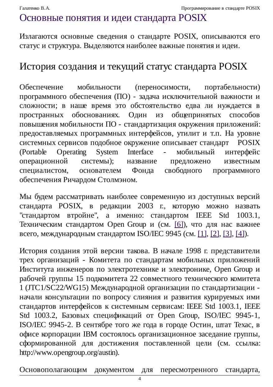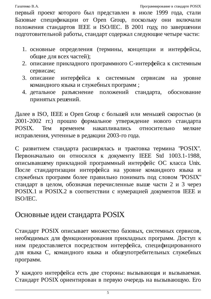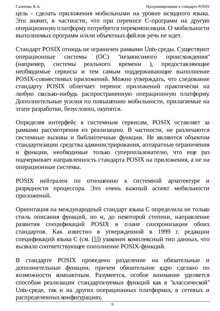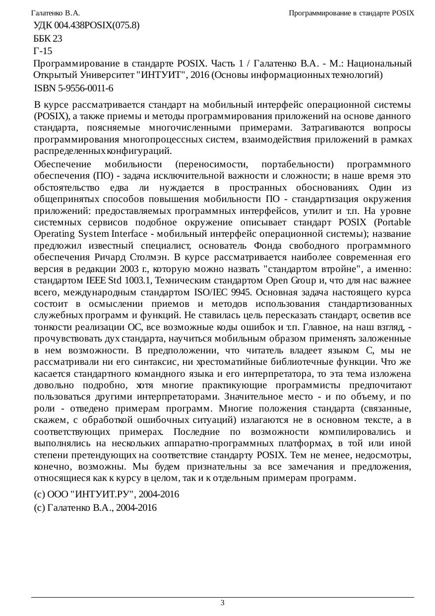 программирования многопроцессных систем, взаимодействия приложений в рамках распределенных конфигураций. Обеспечение мобильности (переносимости, портабельности) программного обеспечения (ПО) - задача исключительной важности и сложности; в наше время это обстоятельство едва ли нуждается в пространных обоснованиях. Один из общепринятых способов повышения мобильности ПО - стандартизация окружения приложений: предоставляемых программных интерфейсов, утилит и т.п. На уровне системных сервисов подобное окружение описывает стандарт POSIX (Portable Operating System Interface - мобильный интерфейс операционной системы); название предложил известный специалист, основатель Фонда свободного программного обеспечения Ричард Столмэн. В курсе рассматривается наиболее современная его версия в редакции 2003 г., которую можно назвать "стандартом втройне", а именно: стандартом IEEE Std 1003.1, Техническим стандартом Open Group и, что для нас важнее всего, международным стандартом ISO/IEC 9945. Основная задача настоящего курса состоит в осмыслении приемов и методов использования стандартизованных служебных программ и функций. Не ставилась цель пересказать стандарт, осветив все тонкости реализации ОС, все возможные коды ошибок и т.п. Главное, на наш взгляд, - прочувствовать дух стандарта, научиться мобильным образом применять заложенные в нем возможности. В предположении, что читатель владеет языком C, мы не рассматривали ни его синтаксис, ни хрестоматийные библиотечные функции. Что же касается стандартного командного языка и его интерпретатора, то эта тема изложена довольно подробно, хотя многие практикующие программисты предпочитают пользоваться другими интерпретаторами. Значительное место - и по объему, и по роли - отведено примерам программ. Многие положения стандарта (связанные, скажем, с обработкой ошибочных ситуаций) излагаются не в основном тексте, а в соответствующих примерах. Последние по возможности компилировались и выполнялись на нескольких аппаратно-программных платформах, в той или иной степени претендующих на соответствие стандарту POSIX. Тем не менее, недосмотры, конечно, возможны. Мы будем признательны за все замечания и предложения, относящиеся как к курсу в целом, так и к отдельным примерам программ.