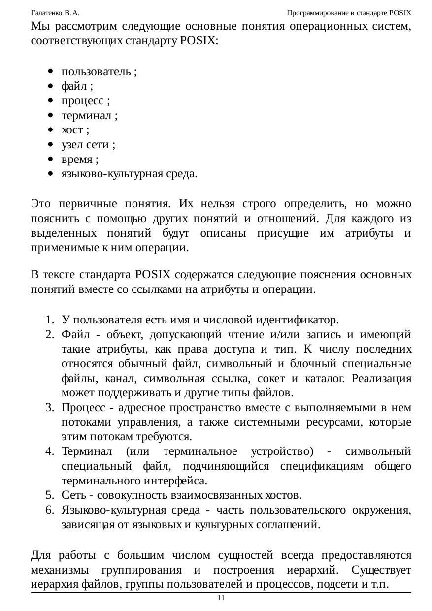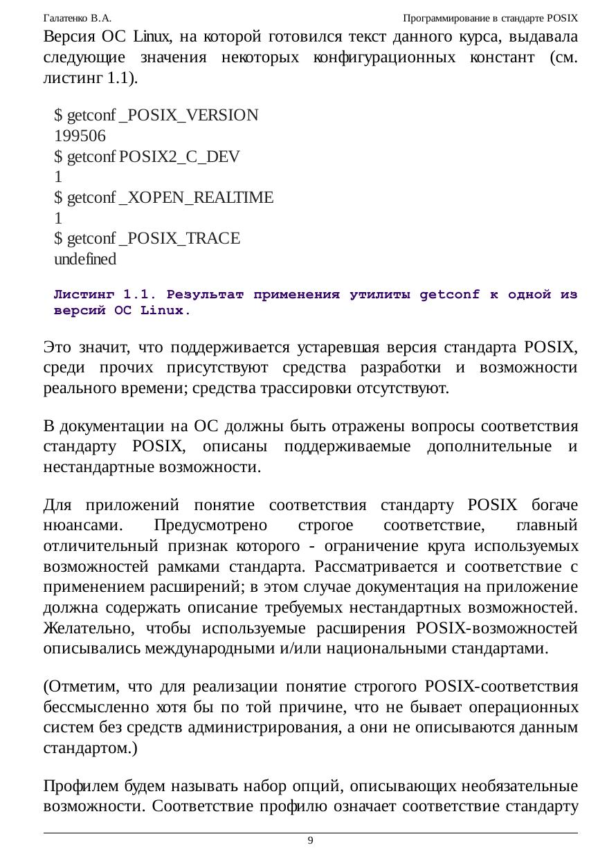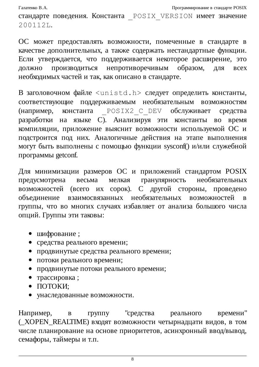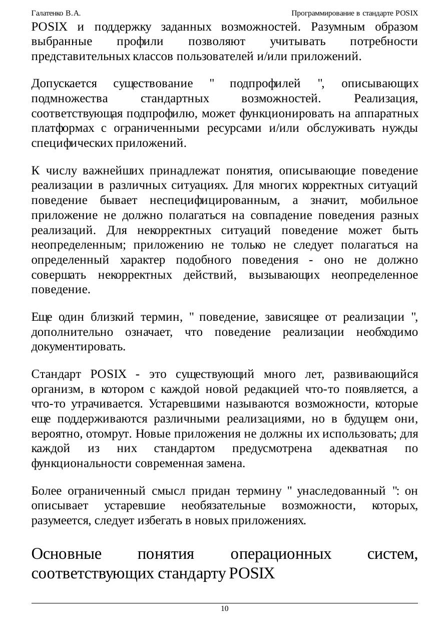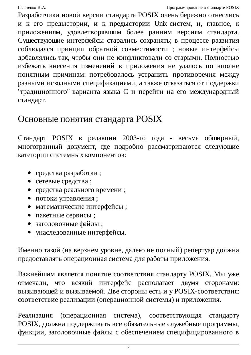программирования многопроцессных систем, взаимодействия приложений в рамках распределенных конфигураций. Обеспечение мобильности (переносимости, портабельности) программного обеспечения (ПО) - задача исключительной важности и сложности; в наше время это обстоятельство едва ли нуждается в пространных обоснованиях. Один из общепринятых способов повышения мобильности ПО - стандартизация окружения приложений: предоставляемых программных интерфейсов, утилит и т.п. На уровне системных сервисов подобное окружение описывает стандарт POSIX (Portable Operating System Interface - мобильный интерфейс операционной системы); название предложил известный специалист, основатель Фонда свободного программного обеспечения Ричард Столмэн. В курсе рассматривается наиболее современная его версия в редакции 2003 г., которую можно назвать "стандартом втройне", а именно: стандартом IEEE Std 1003.1, Техническим стандартом Open Group и, что для нас важнее всего, международным стандартом ISO/IEC 9945. Основная задача настоящего курса состоит в осмыслении приемов и методов использования стандартизованных служебных программ и функций. Не ставилась цель пересказать стандарт, осветив все тонкости реализации ОС, все возможные коды ошибок и т.п. Главное, на наш взгляд, - прочувствовать дух стандарта, научиться мобильным образом применять заложенные в нем возможности. В предположении, что читатель владеет языком C, мы не рассматривали ни его синтаксис, ни хрестоматийные библиотечные функции. Что же касается стандартного командного языка и его интерпретатора, то эта тема изложена довольно подробно, хотя многие практикующие программисты предпочитают пользоваться другими интерпретаторами. Значительное место - и по объему, и по роли - отведено примерам программ. Многие положения стандарта (связанные, скажем, с обработкой ошибочных ситуаций) излагаются не в основном тексте, а в соответствующих примерах. Последние по возможности компилировались и выполнялись на нескольких аппаратно-программных платформах, в той или иной степени претендующих на соответствие стандарту POSIX. Тем не менее, недосмотры, конечно, возможны. Мы будем признательны за все замечания и предложения, относящиеся как к курсу в целом, так и к отдельным примерам программ.