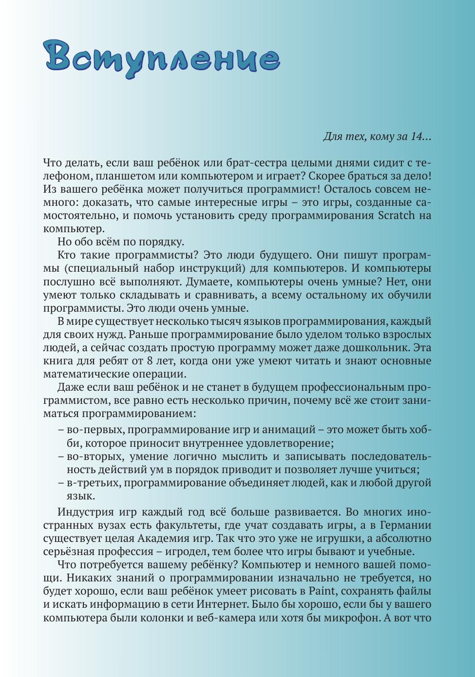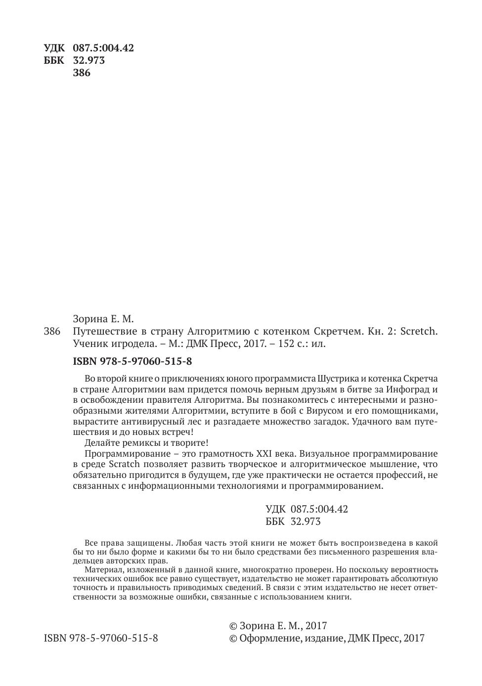 Во второй книге о приключениях юного программиста Шустрика и котенка Скретча в стране Алгоритмии вам придется помочь верным друзьям в битве за Инфоград и в освобождении правителя Алгоритма. Вы познакомитесь с интересными и разнообразными жителями Алгоритмии, вступите в бой с Вирусом и его помощниками, вырастите антивирусный лес и разгадаете множество загадок. Удачного вам путешествия и до новых встреч! Делайте ремиксы и творите! Программирование – это грамотность XXI века. Визуальное программирование в среде Scratch позволяет развить творческое и алгоритмическое мышление, что обязательно пригодится в будущем, где уже практически не остается профессий, не связанных с информационными технологиями и программированием.
