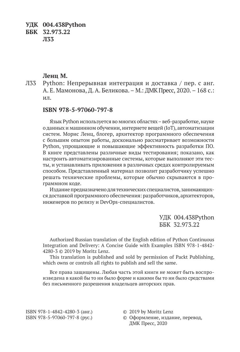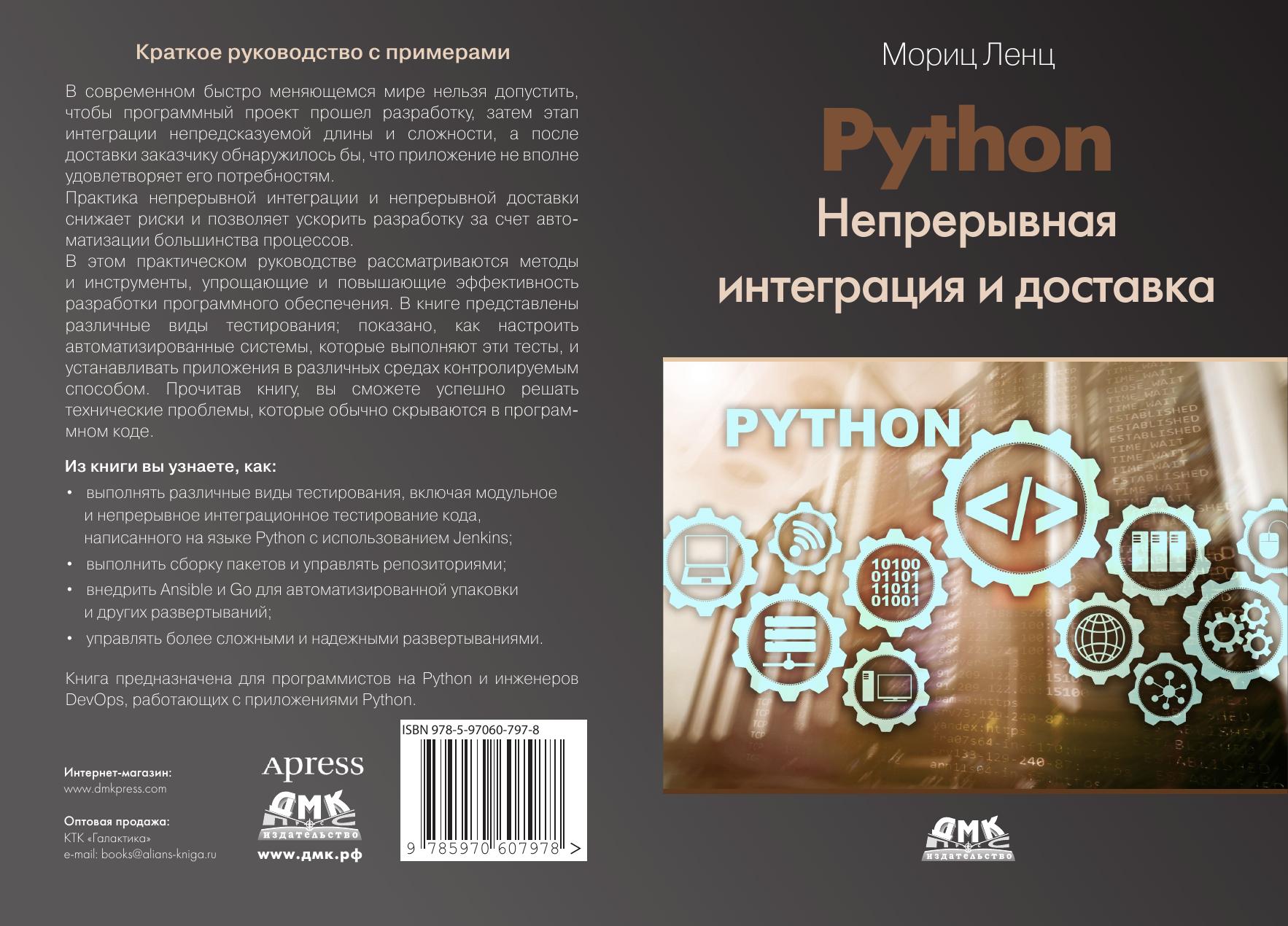 Изучите методы и инструменты, которые обеспечивают плавный и эффективный процесс разработки программного обеспечения, с помощью этого краткого и практического руководства по непрерывной интеграции и непрерывной доставке с использованием Python. В книге представлены различные виды тестирования и показано, как настроить автоматизированные системы, которые выполняют эти тесты, и устанавливать приложения в различных средах контролируем способом на базе примеров. С помощью этой книги можно решить технические проблемы, связанные с разработкой программного обеспечения, которые обычно скрываются в чистых текстах программирования.