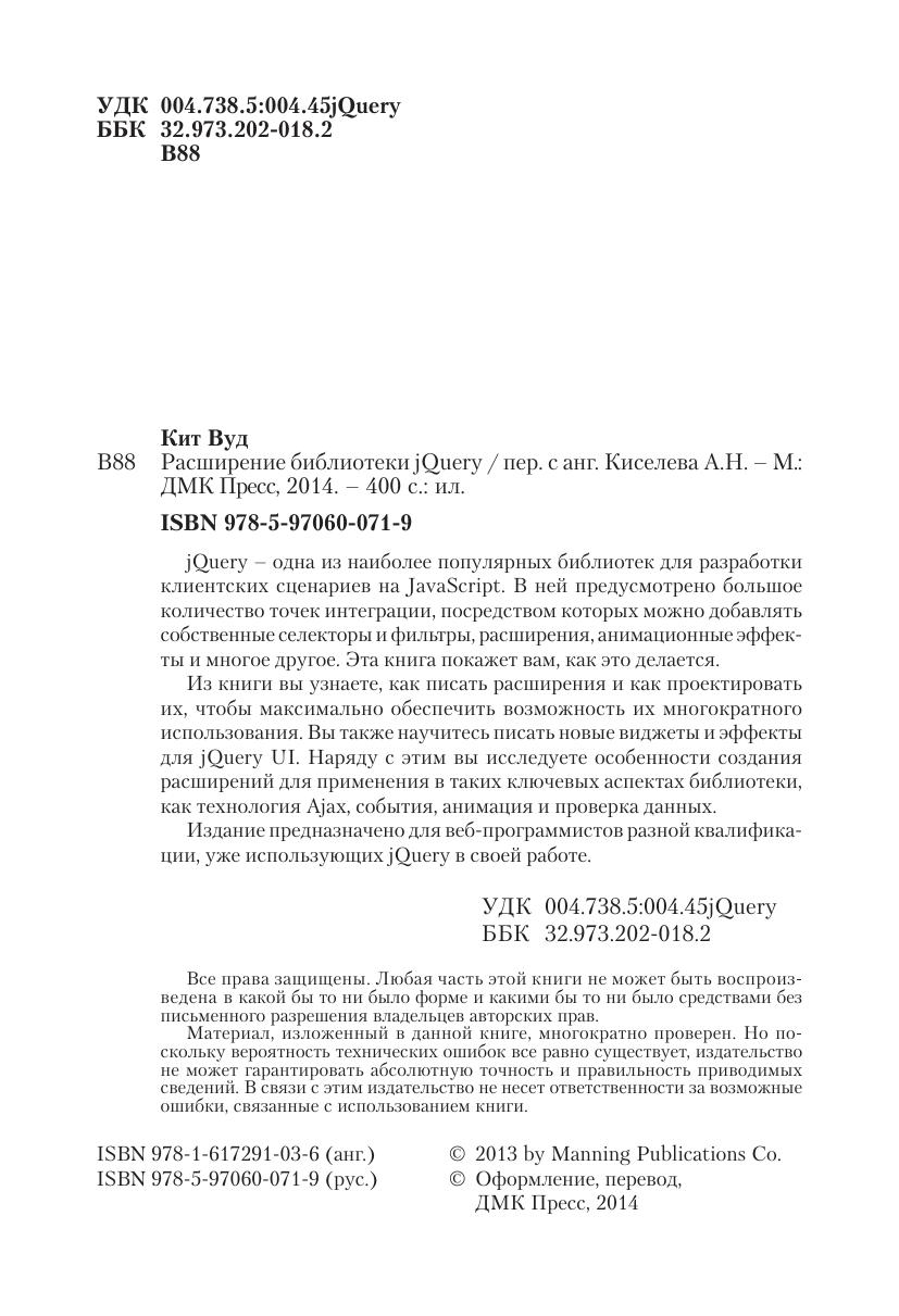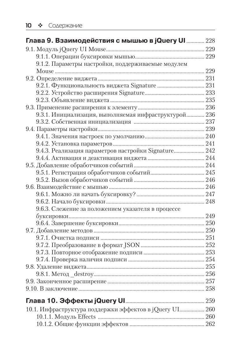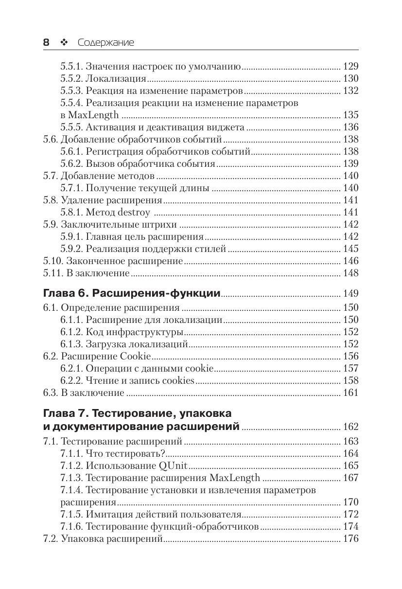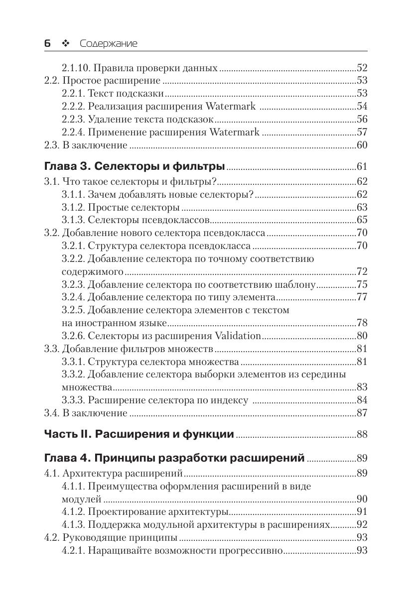 jQuery – одна из наиболее популярных библиотек для разработки клиентских сценариев на JavaScript. В ней предусмотрено большое количество точек интеграции, посредством которых можно добавлять собственные селекторы и фильтры, расширения , анимационные эффекты и многое другое. Эта книга покажет вам, как это делается. Из книги вы узнаете, как писать расширения и как проектировать их, чтобы максимально обеспечить возможность их многократного использования. Вы также научитесь писать новые виджеты и эффекты для jQuery UI. Наряду с этим вы исследуете особенности создания расширений для применения в таких ключевых аспектах библиотеки, как технология Ajax, события, анимация и проверка данных. Издание предназначено для веб-программистов разной квалификации, уже использующ их jQuery в своей работе.