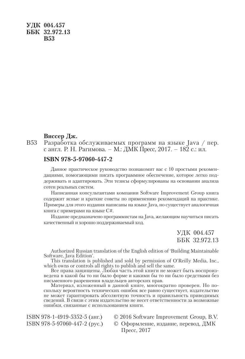 Написанная консультантами компании Software Improvement Group книга содержит ясные и краткие советы по применению рекомендаций на практике. Примеры для этого издания написаны на языке Java, но существует аналогичная книга с примерами на языке C#.
