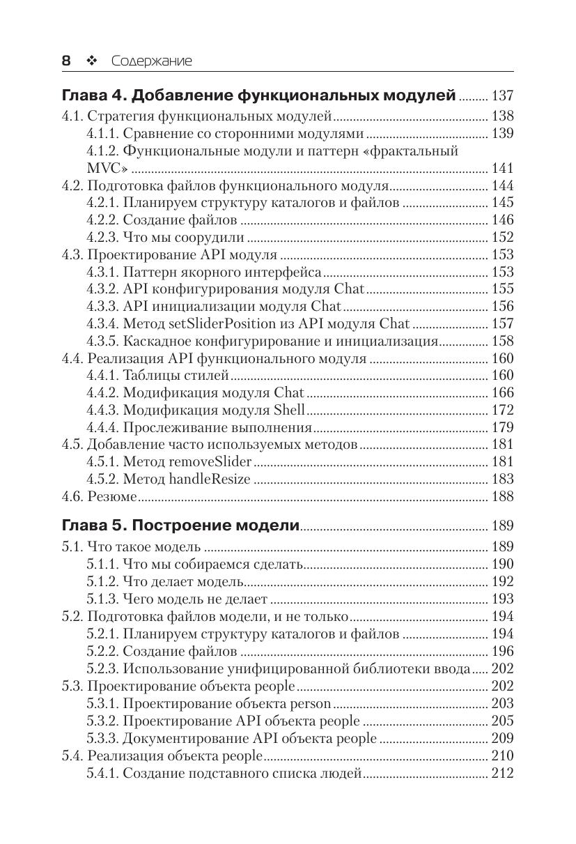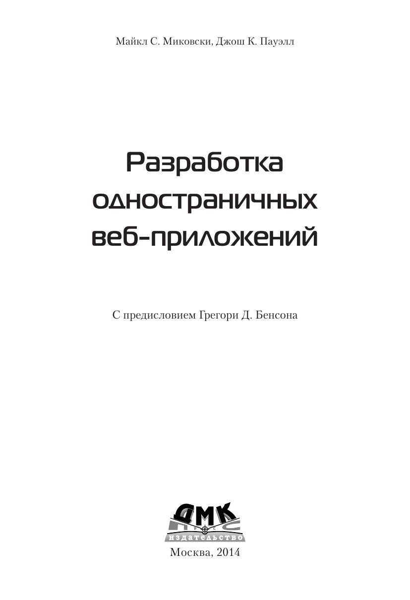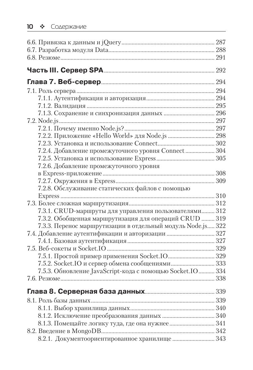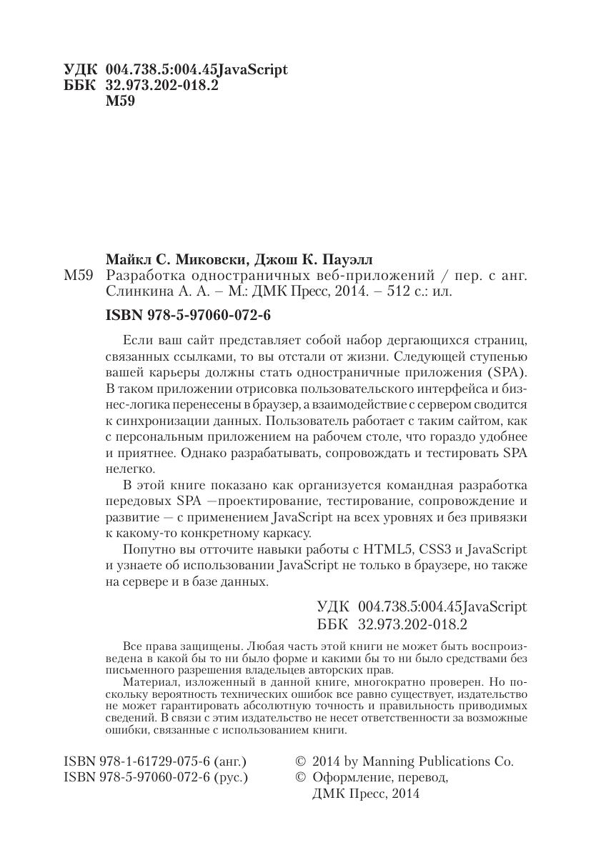 Если ваш сайт представляет собой набор дергающихся страниц, связанных ссылками, то вы отстали от жизни. Следующей ступенью вашей карьеры должны стать одностраничные приложения (SPA). В таком приложении отрисовка пользовательского интерфейса и бизнес-логика перенесены в браузер, а взаимодействие с сервером сводится к синхронизации данных. Пользователь работает с таким сайтом, как с персональным приложением на рабочем столе, что гораздо удобнее и приятнее. Однако разрабатывать, сопровождать и тестировать SPA нелегко. В этой книге показано как организуется командная разработка передовых SPA —проектирование, тестирование, сопровождение и развитие — с применением JavaScript на всех уровнях и без привязки к какому-то конкретному каркасу. Попутно вы отточите навыки работы с HTML5, CSS3 и JavaScript и узнаете об использовании JavaScript не только в браузере, но также на сервере и в базе данных.