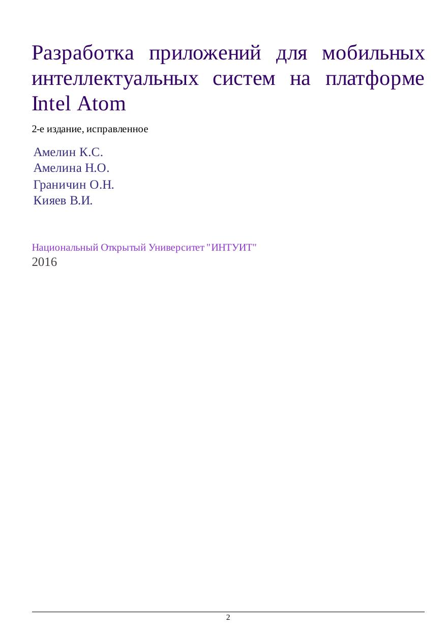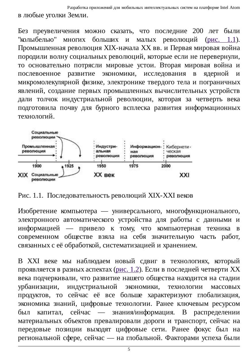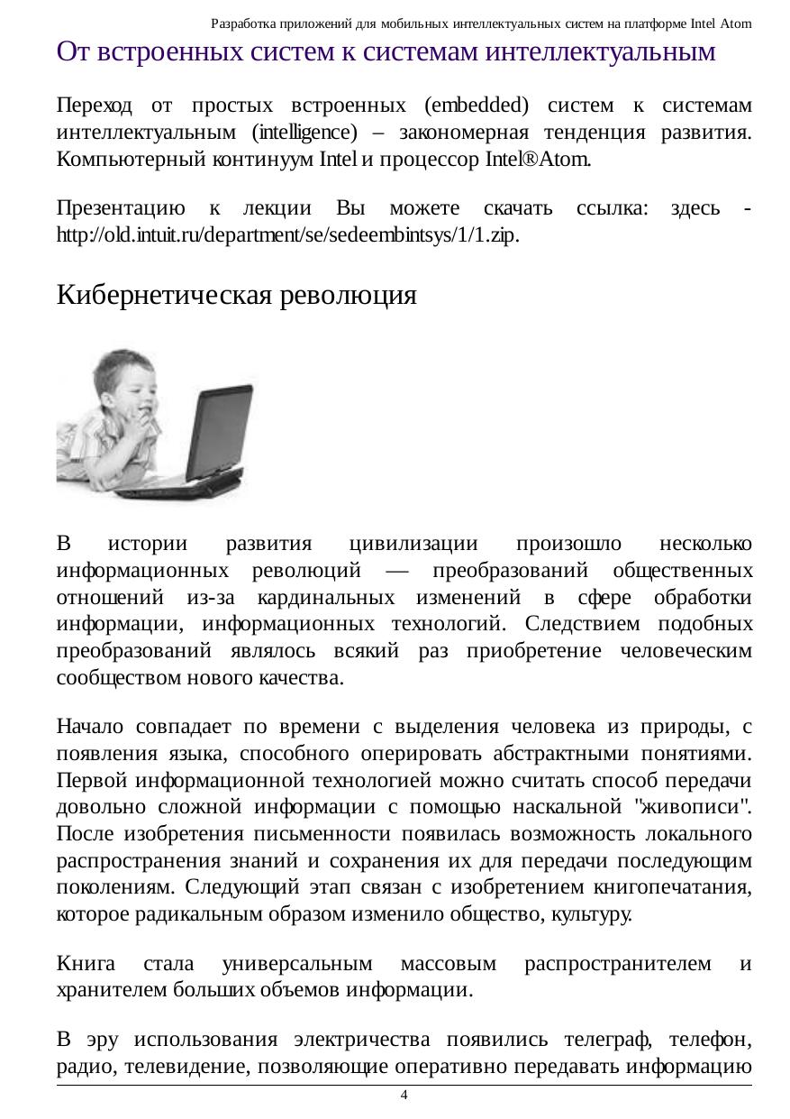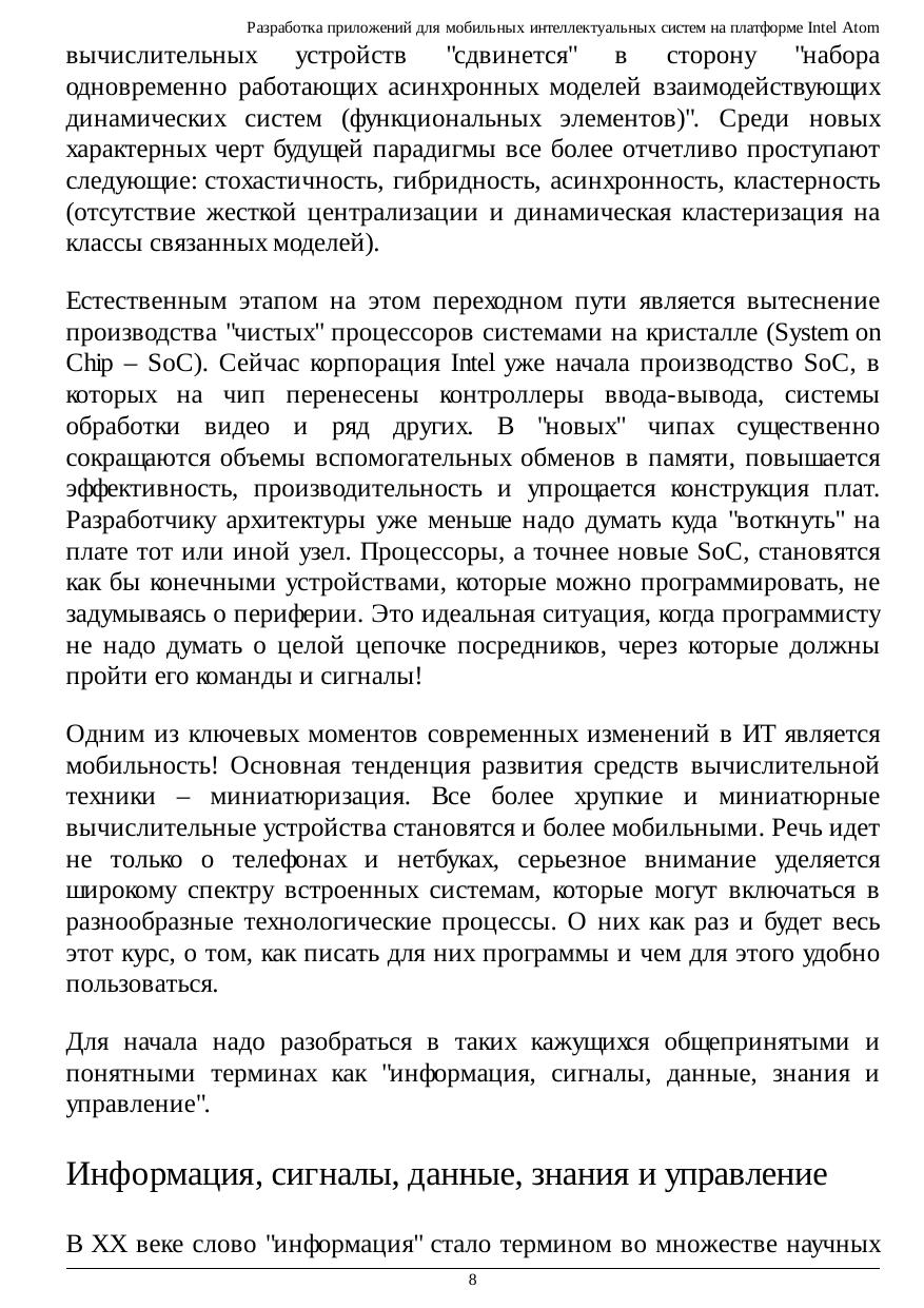 В курсе представлены новые результаты авторов по разработке приложений для мобильных интеллектуальных систем на платформе Intel Atom, прочитанные авторами для студентов Математико-механического факультета СПбГУ, стажеров Лаборатории системного программирования и информационных технологий (СПРИНТ, СПбГУ-Intel) и слушателей молодежных образовательных школ вузов Российской Федерации. В курсе представлены полезные сведения, касающиеся создания и управления интеллектуальной собственностью. Материал сопровождается описанием иллюстративных лабораторных работ для самостоятельного изучения. В курсе описаны перспективы развития средств вычислительной техники, переход к