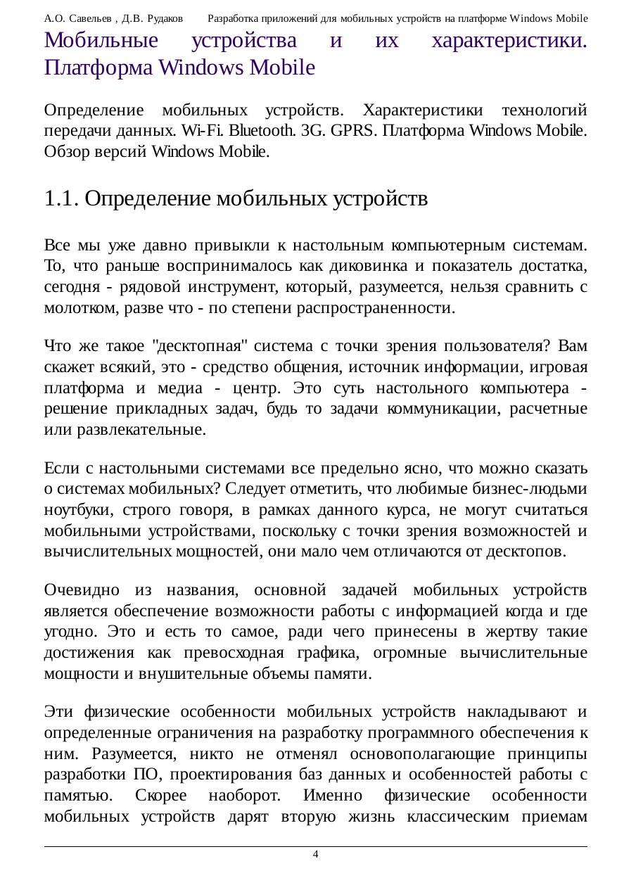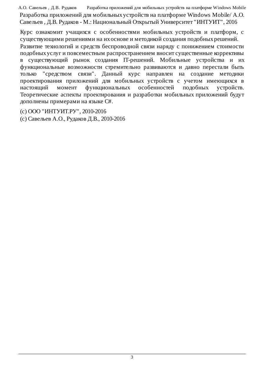 подобных услуг и повсеместным распространением вносит существенные коррективы в существующий рынок создания IT-решений. Мобильные устройства и их функциональные возможности стремительно развиваются и давно перестали быть только "средством связи". Данный курс направлен на создание методики проектирования приложений для мобильных устройств с учетом имеющихся в настоящий момент функциональных особенностей подобных устройств. Теоретические аспекты проектирования и разработки мобильных приложений будут дополнены примерами на языке C#.