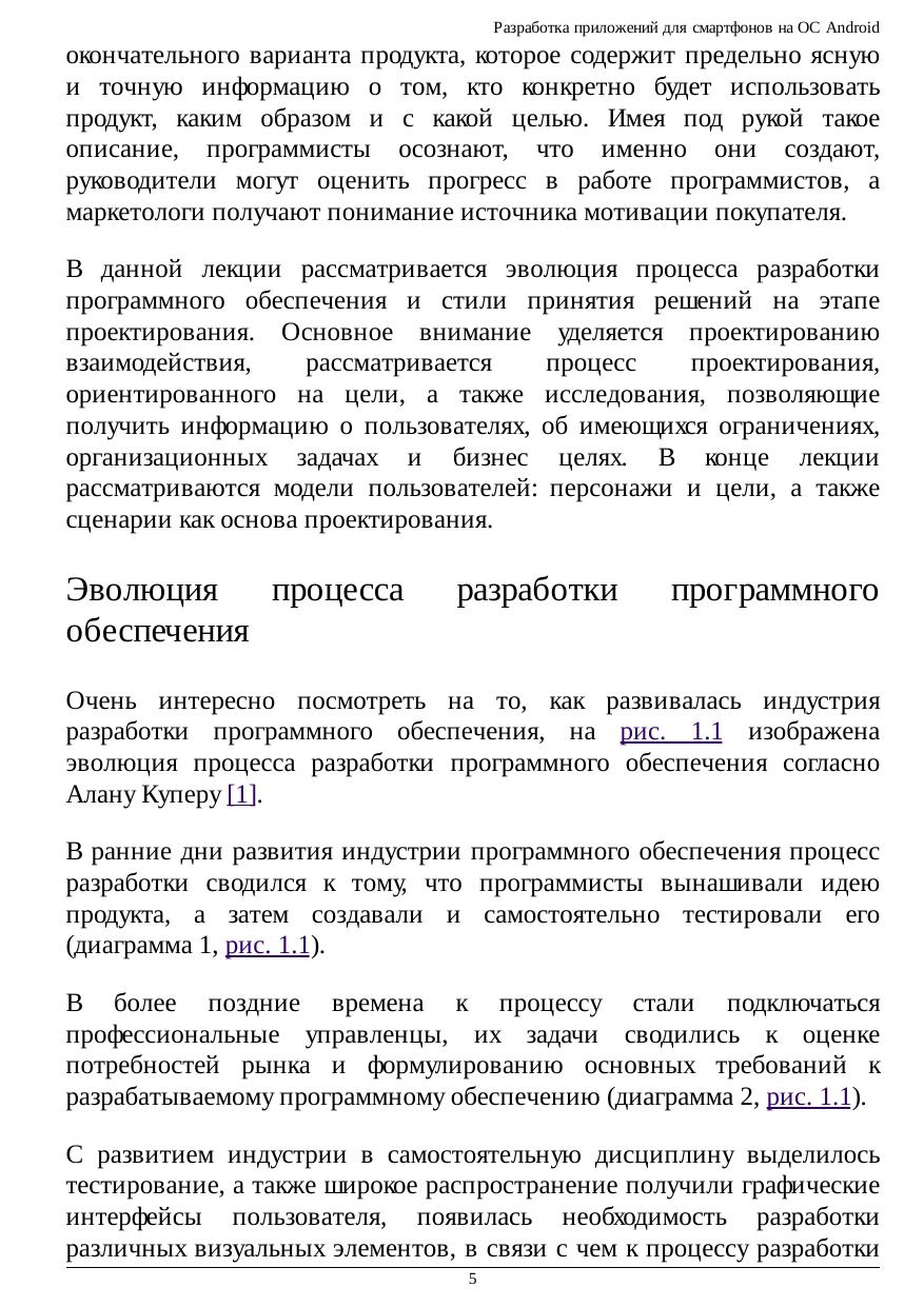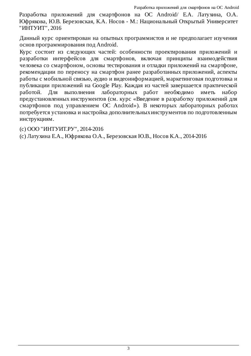 Данный курс ориентирован на опытных программистов и не предполагает изучения основ программирования под Android. Курс состоит из следующих частей: особенности проектирования приложений и разработки интерфейсов для смартфонов, включая принципы взаимодействия человека со смартфоном, основы тестирования и отладки приложений на смартфоне, рекомендации по переносу на смартфон ранее разработанных приложений, аспекты работы с мобильной связью, аудио и видеоинформацией, маркетинговая подготовка и публикации приложений на Google Play. Каждая из частей завершается практической работой. Для выполнения лабораторных работ необходимо иметь набор предустановленных инструментов (см. курс «Введение в разработку приложений для смартфонов под управлением ОС Android»). В некоторых лабораторных работах потребуется установка и настройка дополнительных инструментов по подготовленным инструкциям.