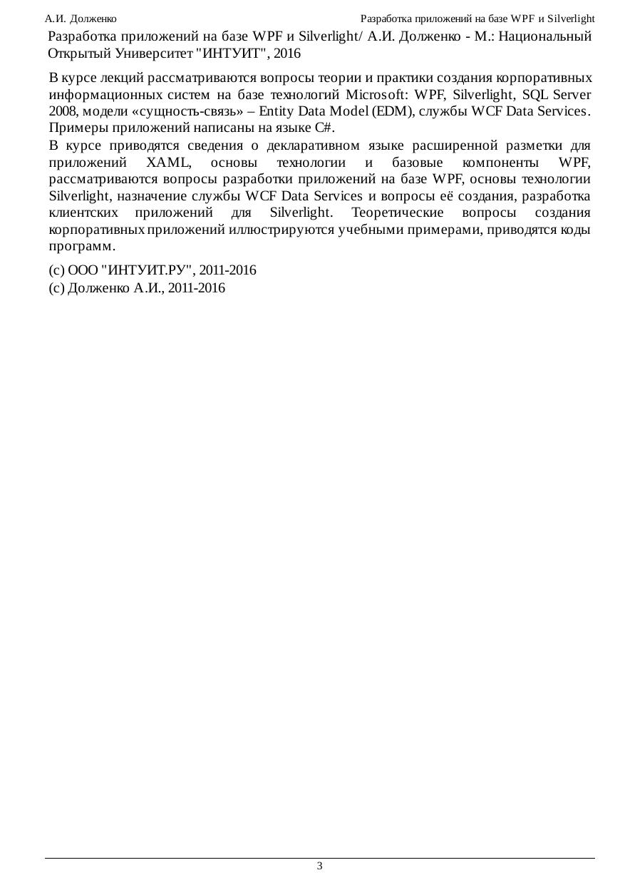 В курсе лекций рассматриваются вопросы теории и практики создания корпоративных информационных систем на базе технологий Microsoft: WPF, Silverlight, SQL Server 2008, модели «сущность-связь» – Entity Data Model (EDM), службы WCF Data Services. Примеры приложений написаны на языке C#. В курсе приводятся сведения о декларативном языке расширенной разметки для приложений XAML, основы технологии и базовые компоненты WPF, рассматриваются вопросы разработки приложений на базе WPF, основы технологии Silverlight, назначение службы WCF Data Services и вопросы её создания, разработка клиентских приложений для Silverlight. Теоретические вопросы создания корпоративных приложений иллюстрируются учебными примерами, приводятся коды программ.