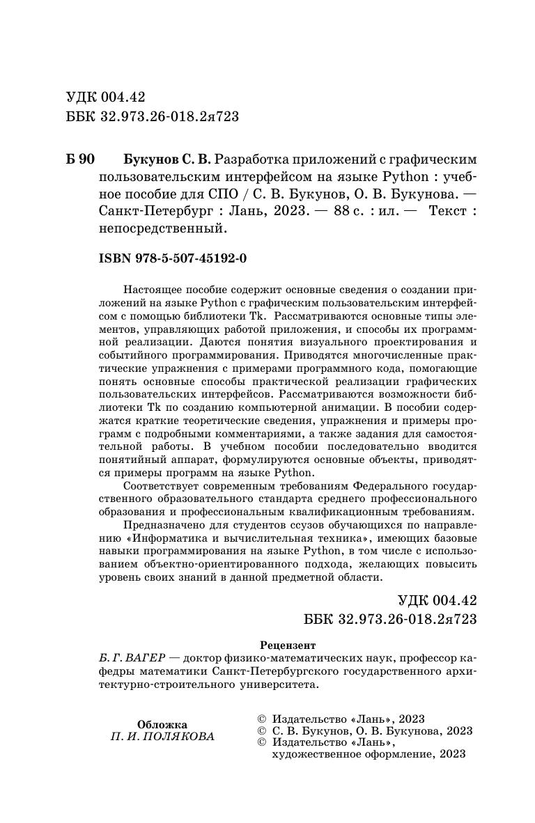 Настоящее пособие содержит основные сведения о создании приложений на языке Python с графическим пользовательским интерфейсом с помощью библиотеки Tk. Рассматриваются основные типы элементов, управляющих работой приложения, и способы их программной реализации. Даются понятия визуального проектирования и событийного программирования. Приводятся многочисленные практические упражнения с примерами программного кода, помогающие понять основные способы практической реализации графических пользовательских интерфейсов. Рассматриваются возможности библиотеки Tk по созданию компьютерной анимации. В пособии содержатся краткие теоретические сведения, упражнения и примеры программ с подробными комментариями, а также задания для самостоятельной работы. В учебном пособии последовательно вводится понятийный аппарат, формулируются основные объекты, приводятся примеры программ на языке Python. Соответствует современным требованиям Федерального государственного образовательного стандарта среднего профессионального образования и профессиональным квалификационным требованиям. Предназначено для студентов ссузов обучающихся по направлению «Информатика и вычислительная техника», имеющих базовые навыки программирования на языке Python, в том числе с использованием объектно-ориентированного подхода, желающих повысить уровень своих знаний в данной предметной области.