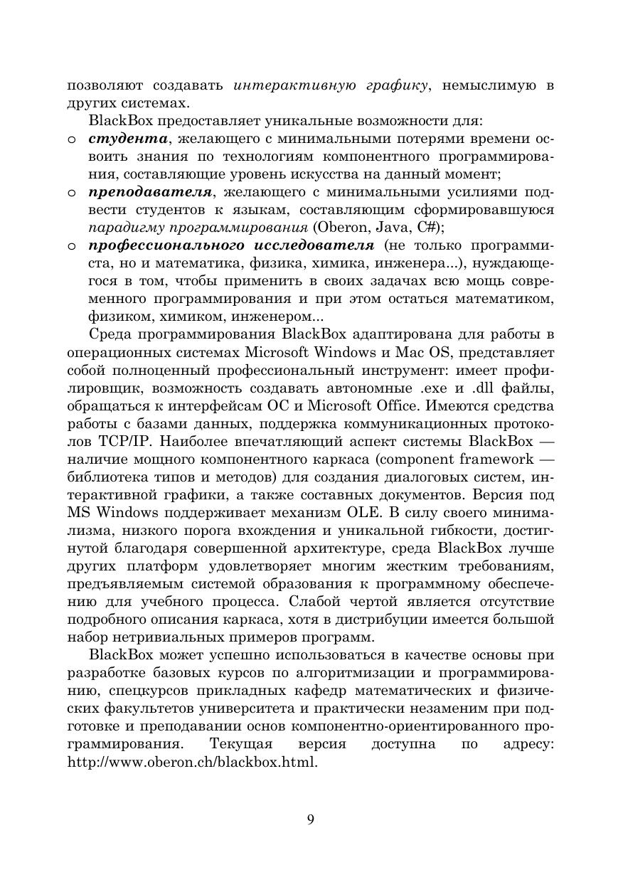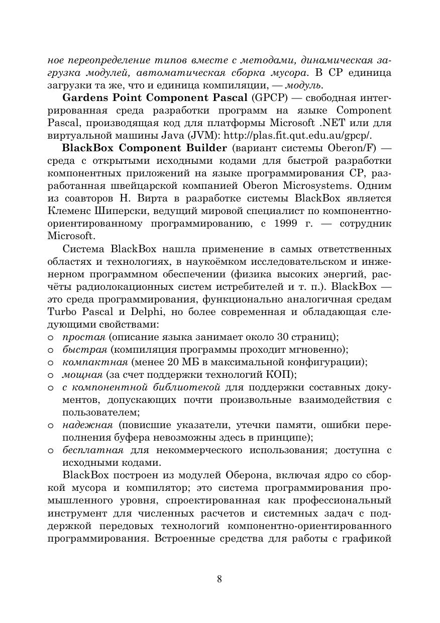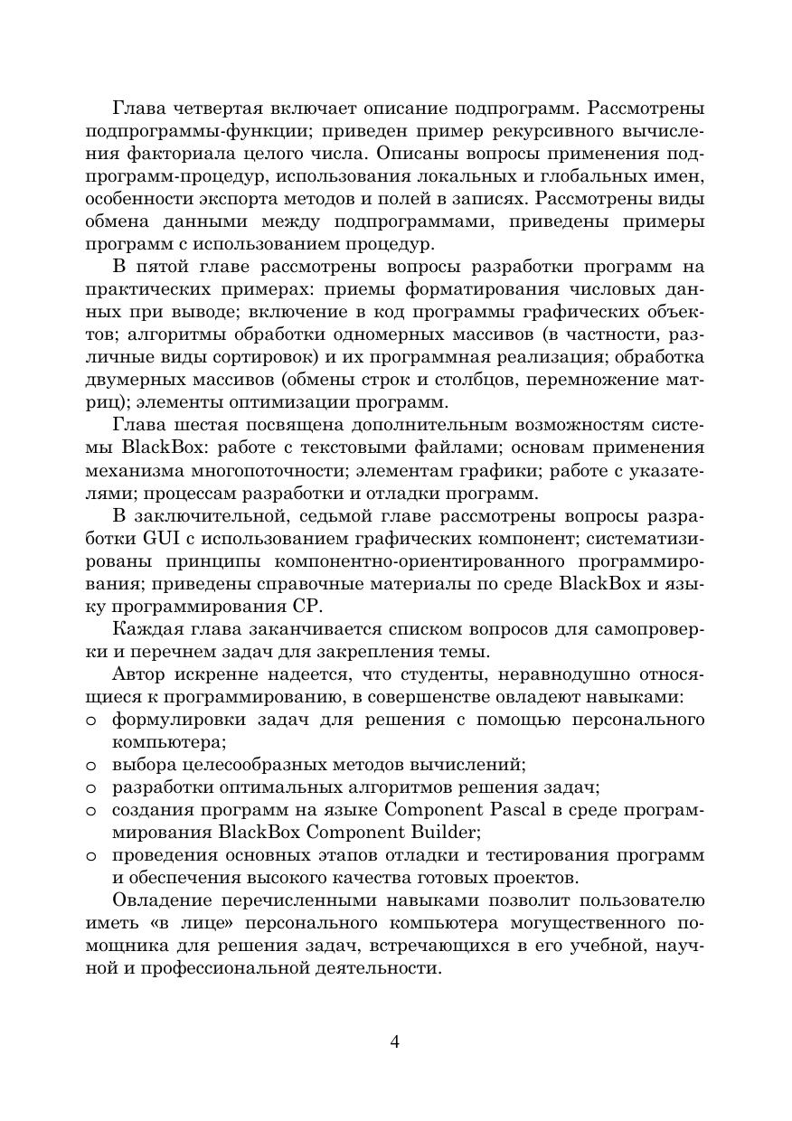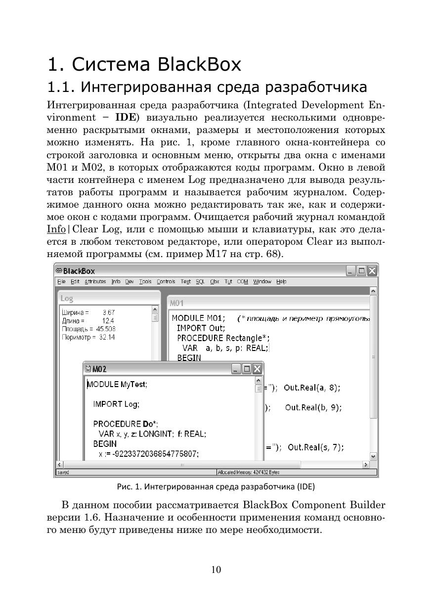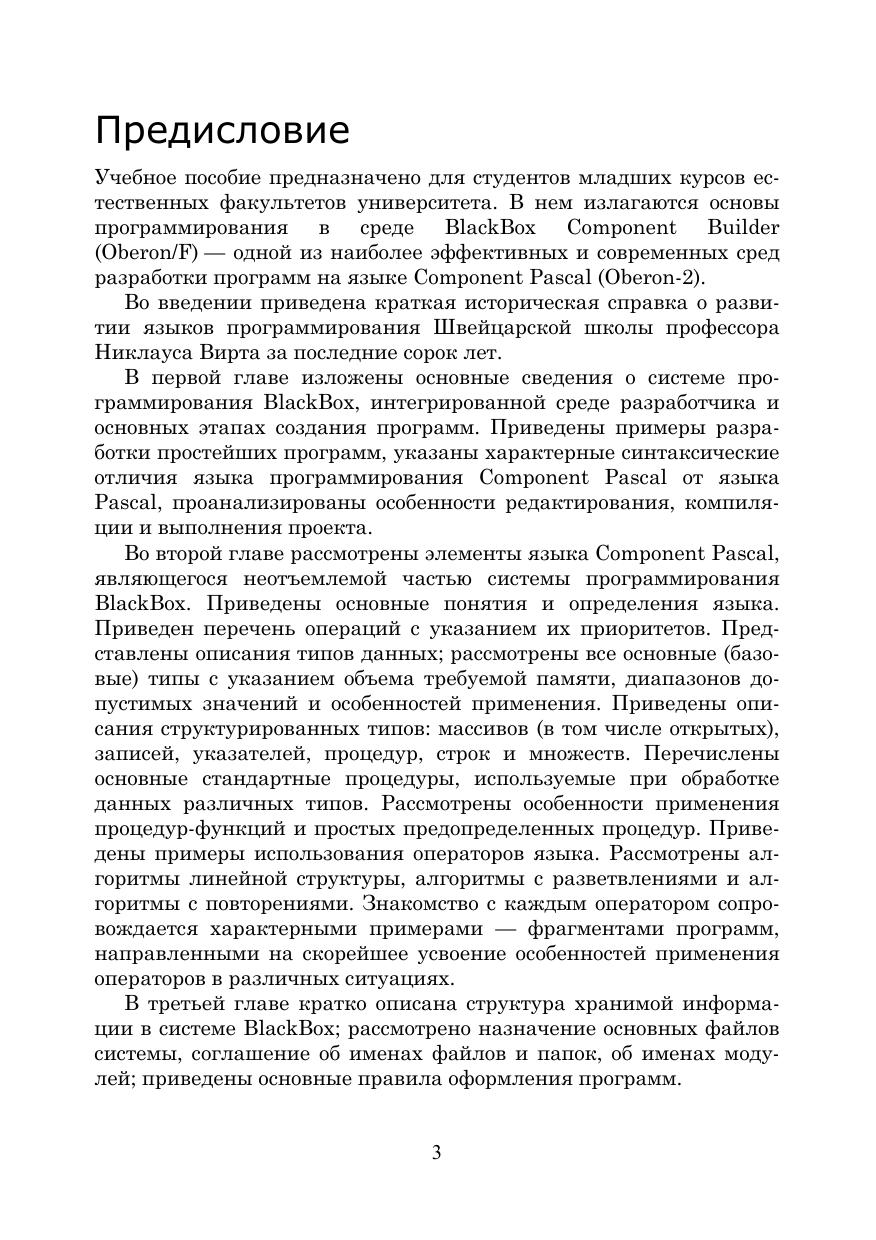 В учебном пособии излагаются основы программирования на языке Component Pascal (Oberon-2) в современной среде разработки приложений BlackBox Component Builder (Oberon/F). Приводятся описания интегрированной среды разработчика и рассматриваются вопросы разработки прикладных программ. Пособие предназначено для студентов младших курсов классических, педагогических и технических университетов, обучающихся по направлениям «Прикладная информатика», «Прикладная математика и информатика», а также может быть полезным при самостоятельном изучении основ компонентно-ориентированного программирования.