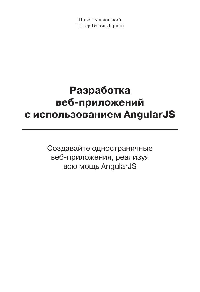 С появлением HTML5 и CSS3 разработка клиентских веб-приложений на языке JavaScript приобрела особую популярность. Создатели фреймворка AngularJS предприняли революционный подход к решению вопроса превращения браузера в самую лучшую платформу для разработки веб-приложений. Книга проведет вас через основные этапы конструирования типичного одностраничного веб-приложения. В ней обсуждаются такие темы, как организация структуры приложения, взаимодействие с различными серверными технологиями, безопасность, производительность и развертывание. После представления AngularJS и обзора перспектив клиентских веб-приложений, книга шаг за шагом проведет вас через создание достаточно сложного приложения. Издание будет наиболее полезно веб-разработчикам, желающим оценить или решившим применить фреймворк AngularJS для создания своих приложений. Предполагается, что читатель имеет некоторое знакомство с AngularJS, хотя бы на уровне понимания простейших примеров. Мы надеемся также, что вы обладаете знанием HTML, CSS и JavaScript