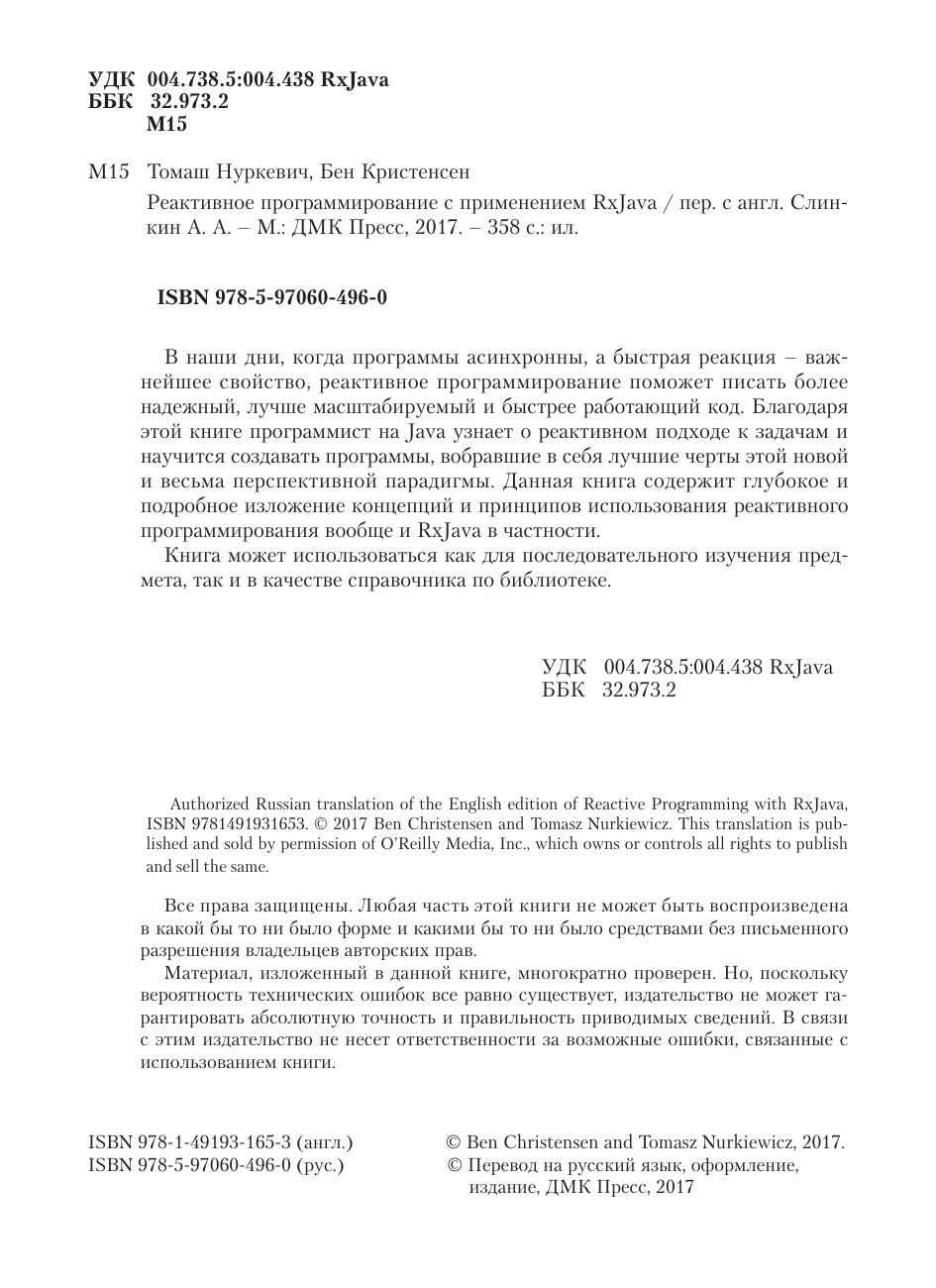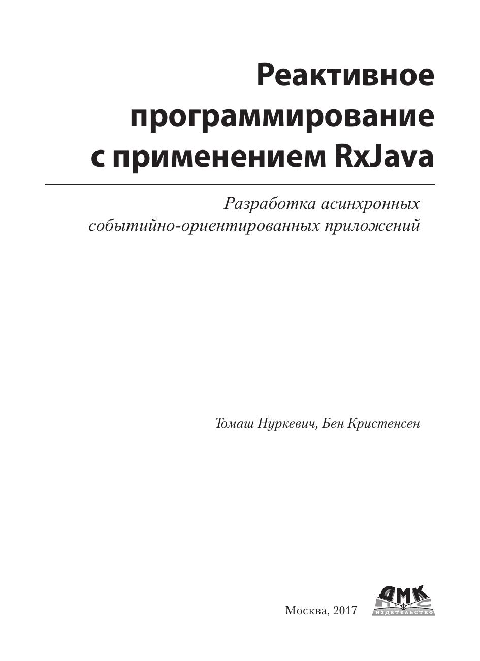 В наши дни, когда программы асинхронны, а быстрая реакция – важнейшее свойство, реактивное программирование поможет писать более надежный, лучше масштабируемый и быстрее работающий код. Благодаря этой книге программист на Java узнает о реактивном подходе к задачам и научится создавать программы, вобравшие в себя лучшие черты этой новой и весьма перспективной парадигмы. Данная книга содержит глубокое и подробное изложение концепций и принципов использования реактивного программирования вообще и RxJava в частности. Книга может использоваться как для последовательного изучения предмета, так и в качестве справочника по библиотеке.