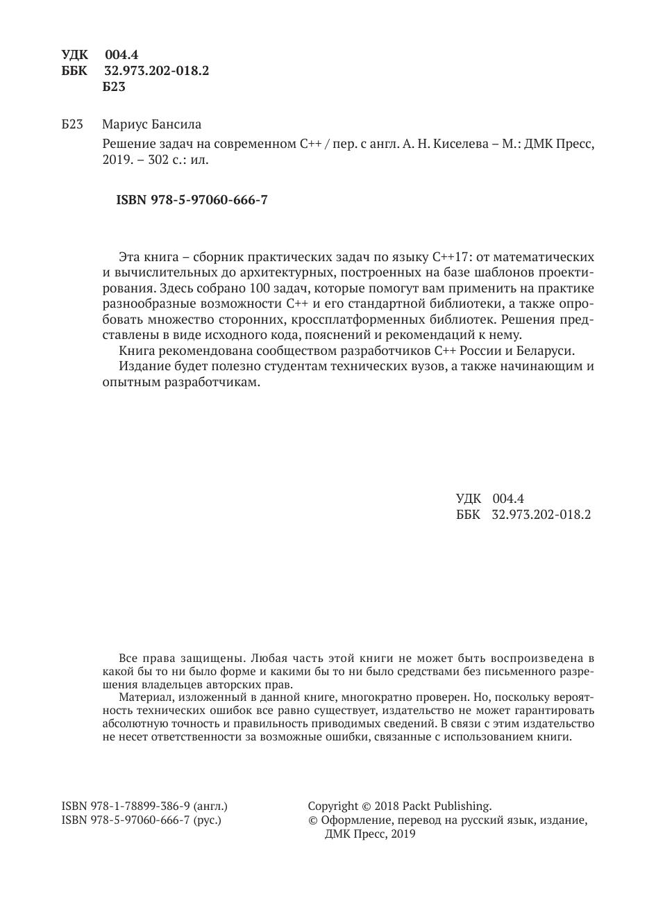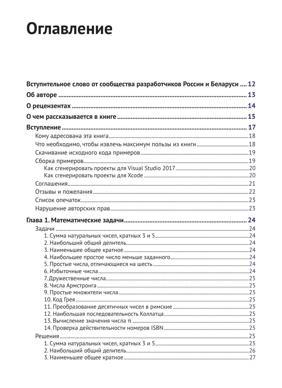 Эта книга – сборник практических задач по языку С++17: от математических и вычислительных до архитектурных, построенных на базе шаблонов проектирования. Здесь собрано 100 задач, которые помогут вам применить на практике разнообразные возможности C++ и его стандартной библиотеки, а также опробовать множество сторонних, кроссплатформенных библиотек. Решения представлены в виде исходного кода, пояснений и рекомендаций к нему. Книга рекомендована сообществом разработчиков С++ России и Беларуси. Издание будет полезно студентам технических вузов, а также начинающим и опытным разработчикам.