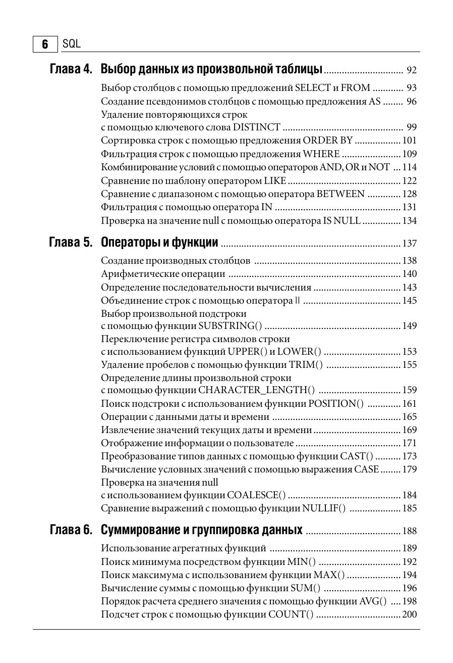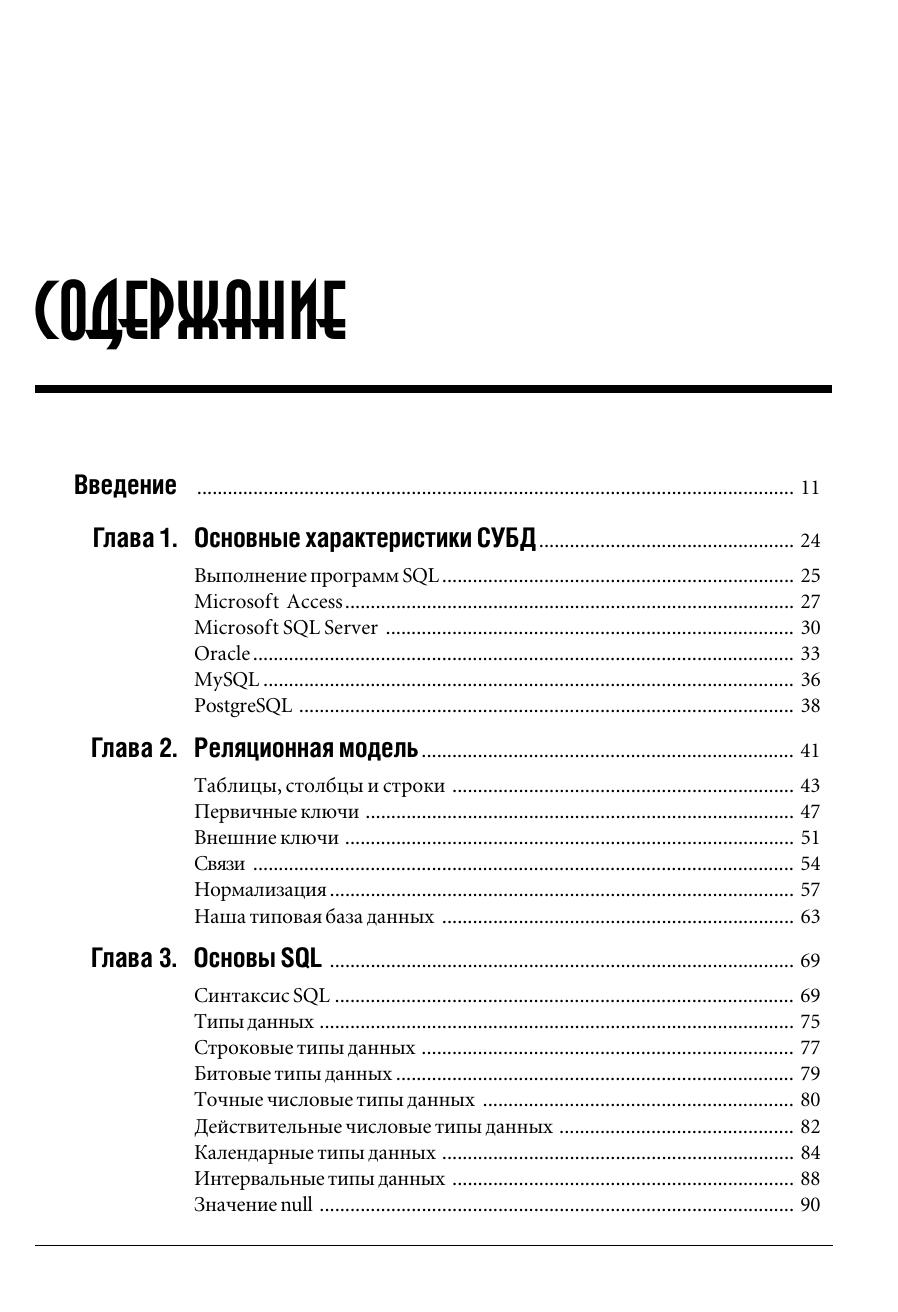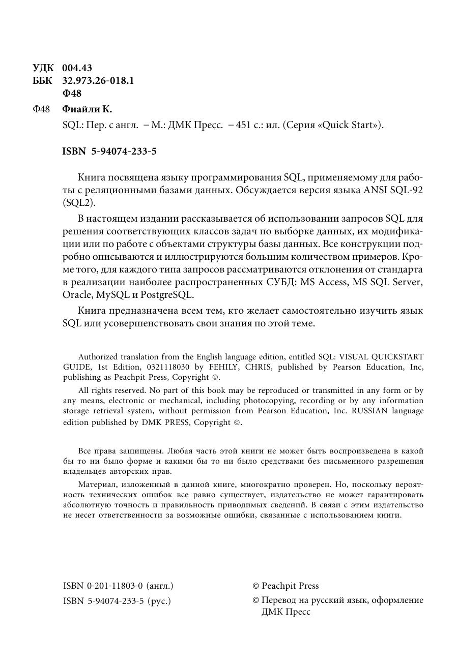 Книга посвящена языку программирования SQL, применяемому для работы с реляционными базами данных. Обсуждается версия языка ANSI SQL-92 (SQL2). В настоящем издании рассказывается об использовании запросов SQL для решения соответствующих классов задач по выборке данных, их модификации или по работе с объектами структуры базы данных. Все конструкции подробно описываются и иллюстрируются большим количеством примеров. Кроме того, для каждого типа запросов рассматриваются отклонения от стандарта в реализации наиболее распространенных СУБД: MS Access, MS SQL Server, Oracle, MySQL и PostgreSQL. Книга предназначена всем тем, кто желает самостоятельно изучить язык SQL или усовершенствовать свои знания по этой теме.
