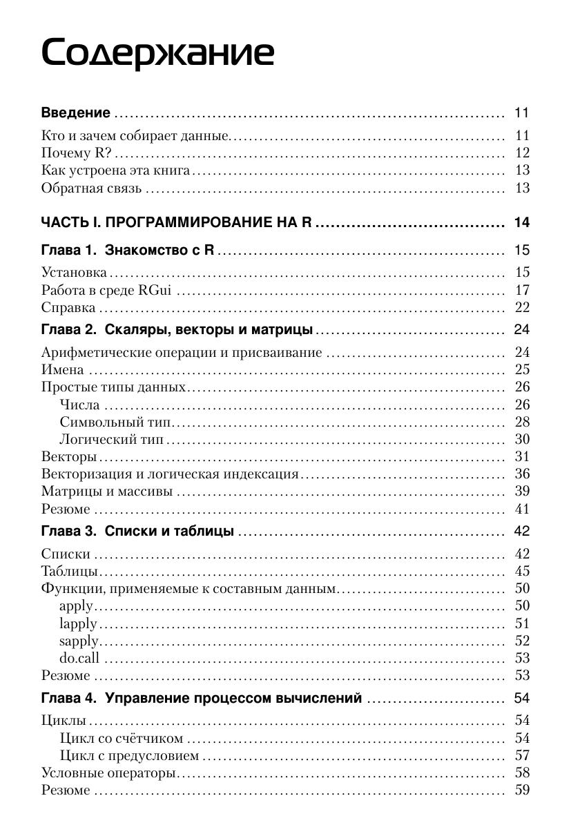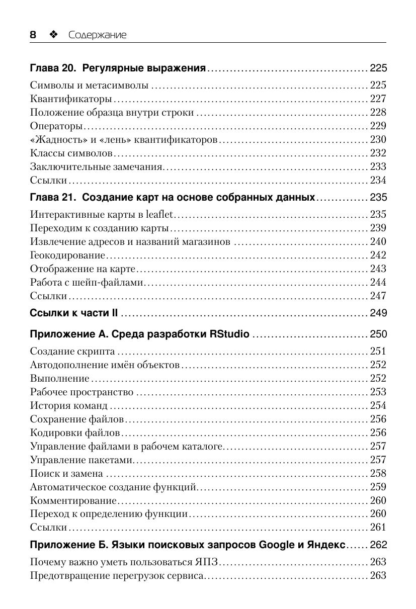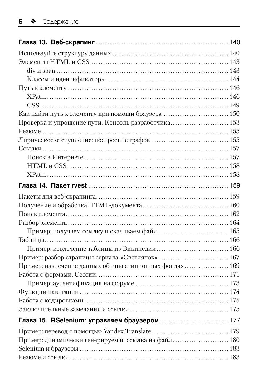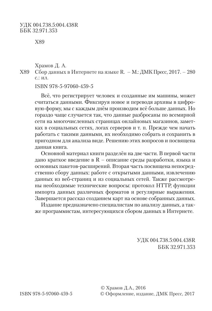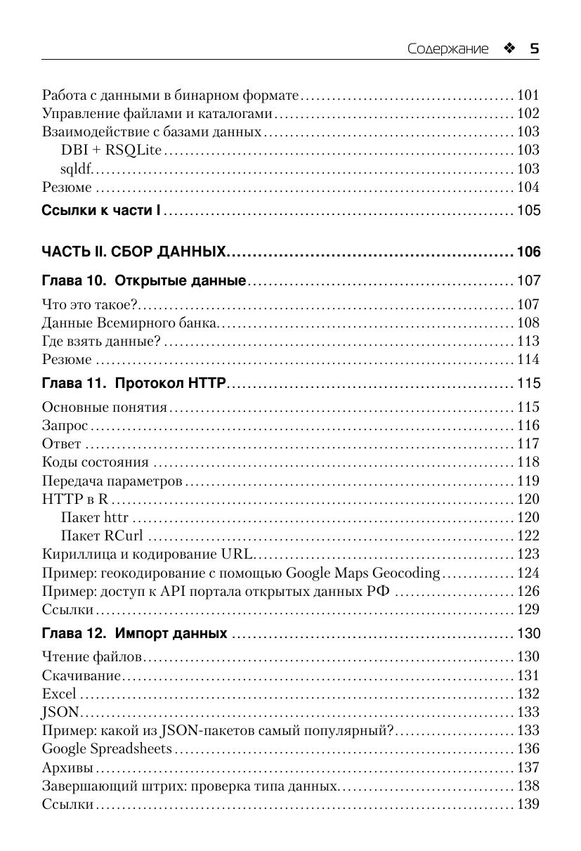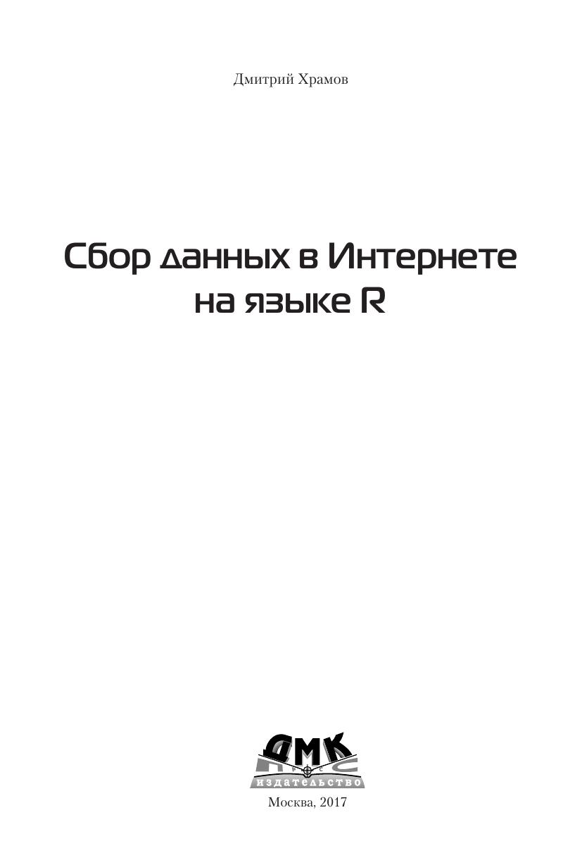 Всё, что регистрирует человек и созданные им машины, может считаться данными. Фиксируя новое и переводя архивы в цифровую форму, мы с каждым днём производим всё больше данных. Но гораздо чаще случается так, что данные разбросаны по всемирной сети на многочисленных страницах онлайновых магазинов, заметках в социальных сетях, логах серверов и т. п. Прежде чем начать работать с такими данными, их необходимо собрать и сохранить в пригодном для анализа виде. Решению этих вопросов и посвящена данная книга. Основной материал книги разделён на две части. В первой части дано краткое введение в R – описание среды разработки, языка и основных пакетов-расширений. Вторая часть посвящена непосредственно сбору данных: работе с открытыми данными, извлечению данных из веб-страниц и из социальных сетей. Также рассмотрены необходимые технические вопросы: протокол HTTP, функции импорта данных различных форматов и регулярные выражения. Завершается рассказ созданием карт на основе собранных данных. Издание предназначено специалистам по анализу данных, а также программистам, интересующихся сбором данных в Интернете.