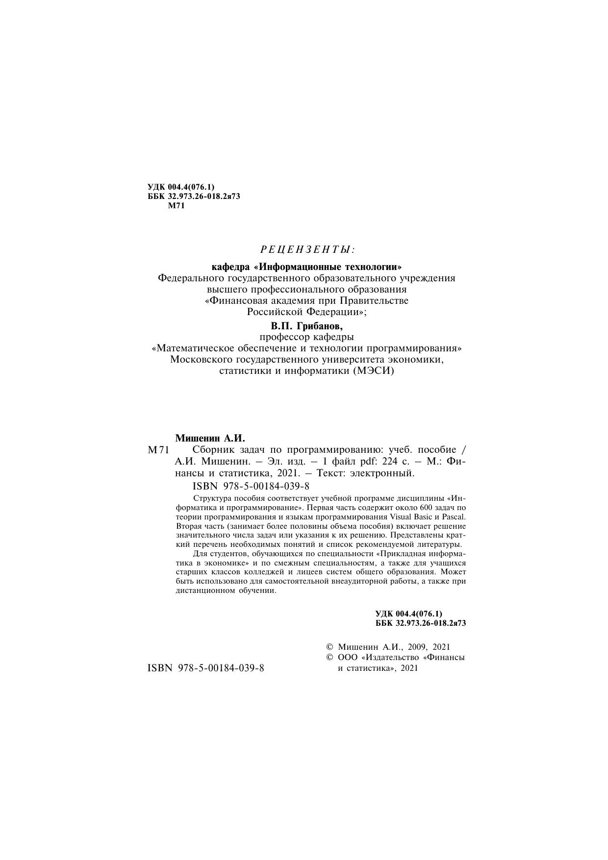 Структура пособия соответствует учебной программе дисциплины "Информатика и программирование". Первая часть содержит около 600 задач по теории программирования и языкам программирования Visual Basic и Pascal. Вторая часть (занимает более половины объема пособия) включает решение значительного числа задач или указания к их решению. Представлены краткий перечень необходимых понятий и список рекомендуемой литературы. Для студентов, обучающихся по специальности "Прикладная информатика в экономике" и по смежным специальностям, а также для учащихся старших классов колледжей и лицеев систем общего образования. Может быть использовано для самостоятельной внеаудиторной работы, а также при дистанционном обучении.