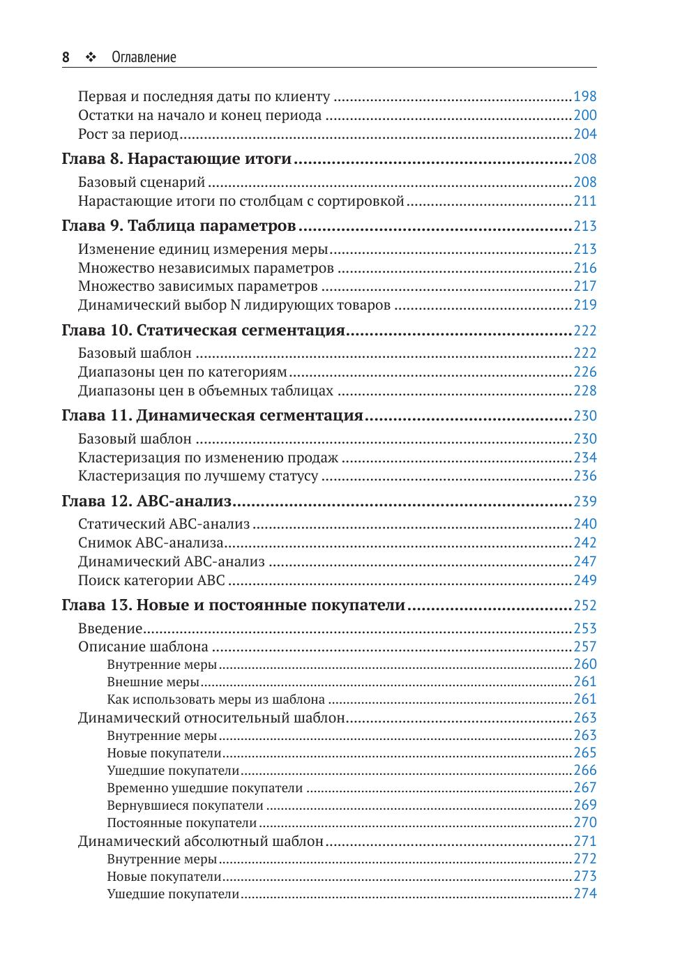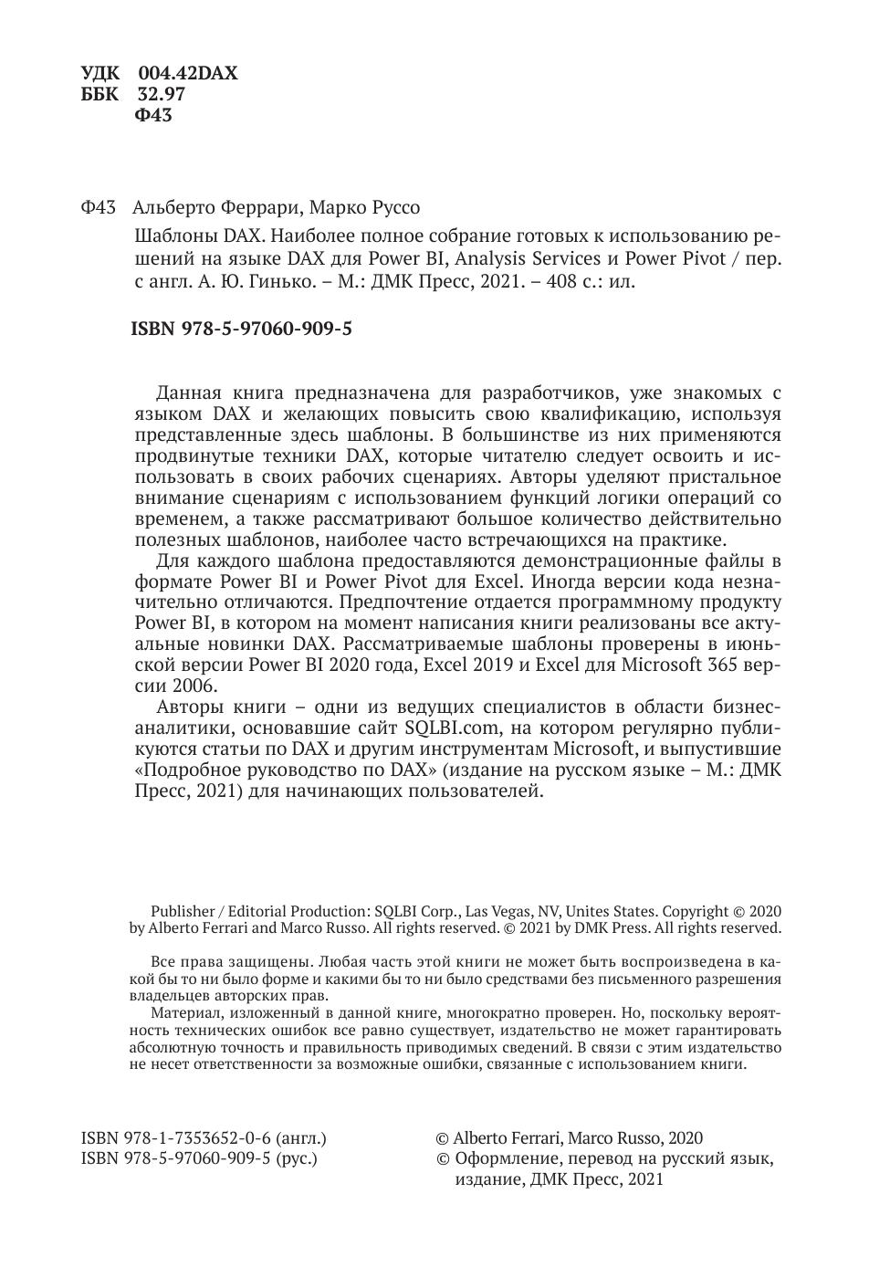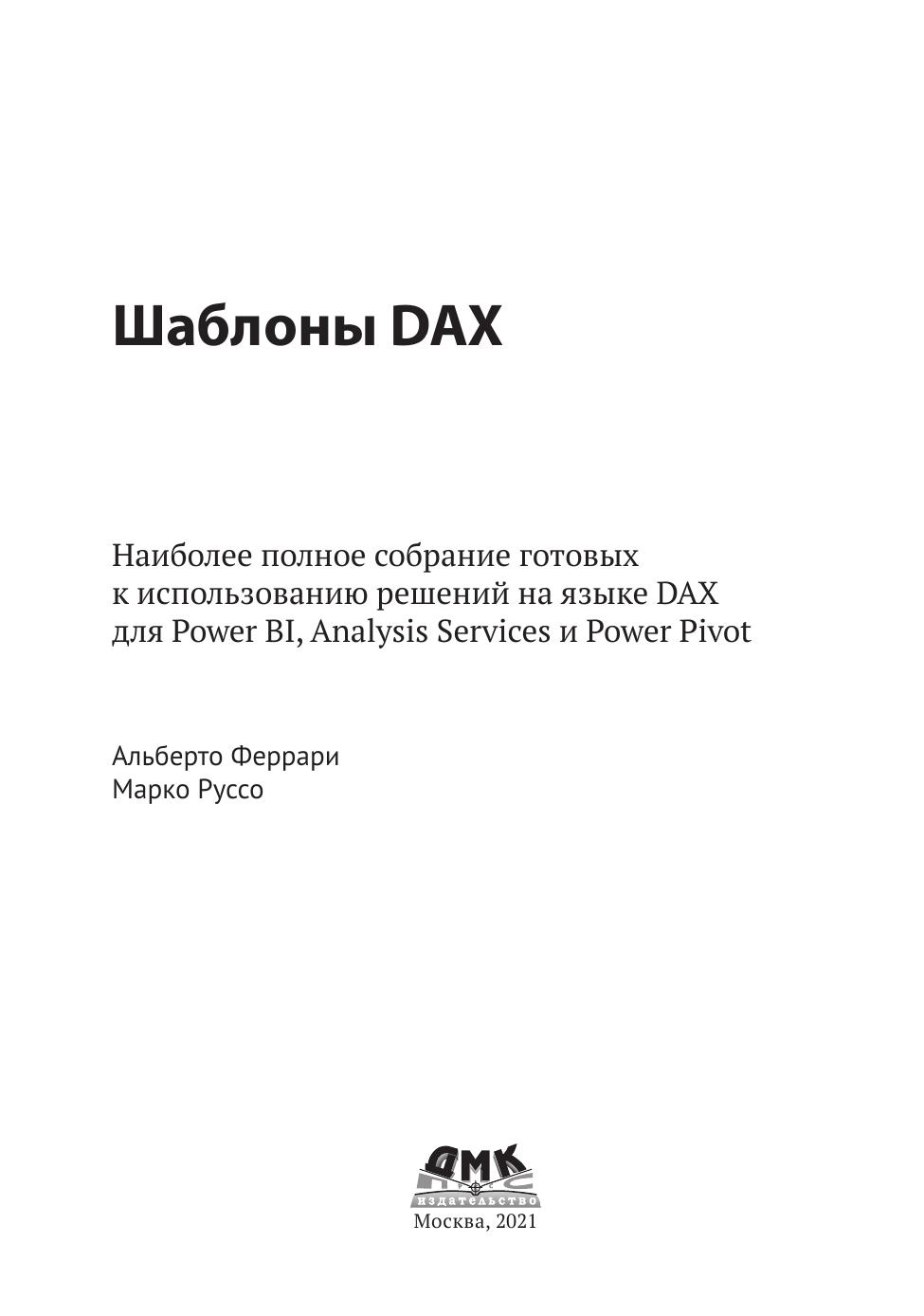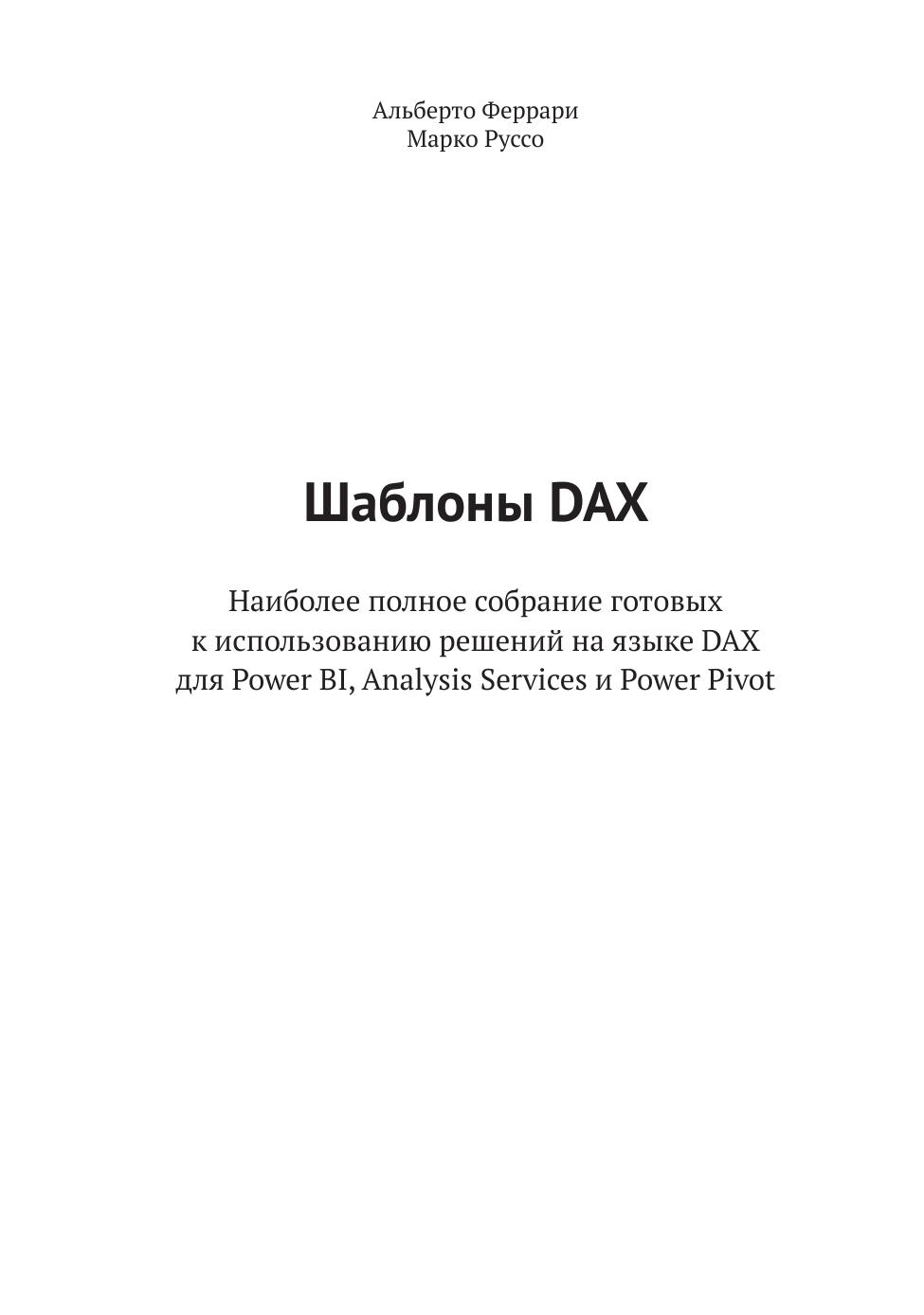 Данная книга предназначена для разработчиков, уже знакомых с языком DAX и желающих повысить свою квалификацию, используя представленные здесь шаблоны. В большинстве из них применяются продвинутые техники DAX, которые читателю следует освоить и использовать в своих рабочих сценариях. Авторы уделяют пристальное внимание сценариям с использованием функций логики операций со временем, а также рассматривают большое количество действительно полезных шаблонов, наиболее часто встречающихся на практике.