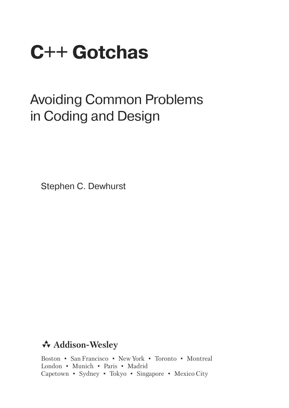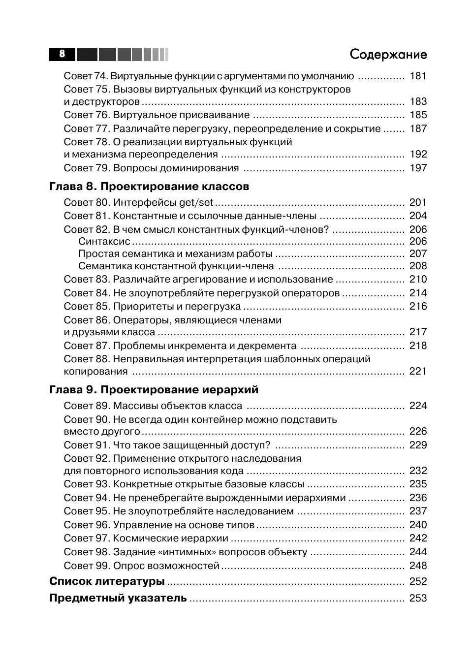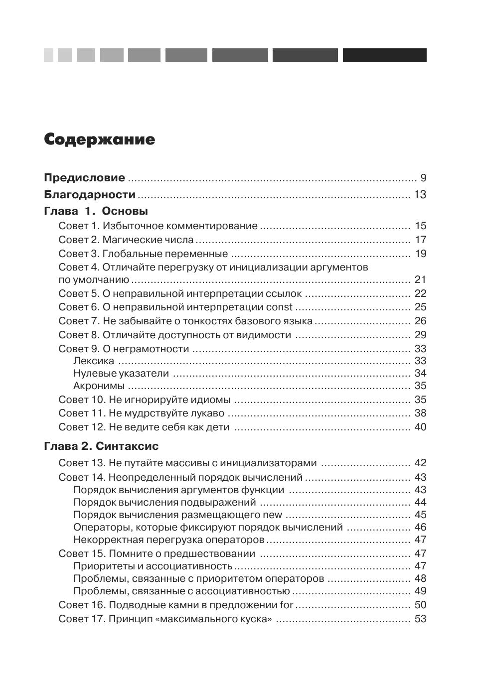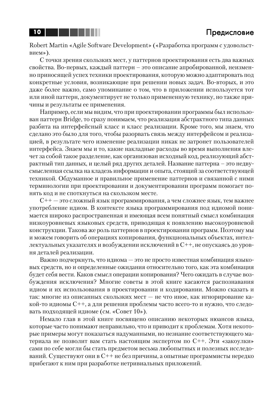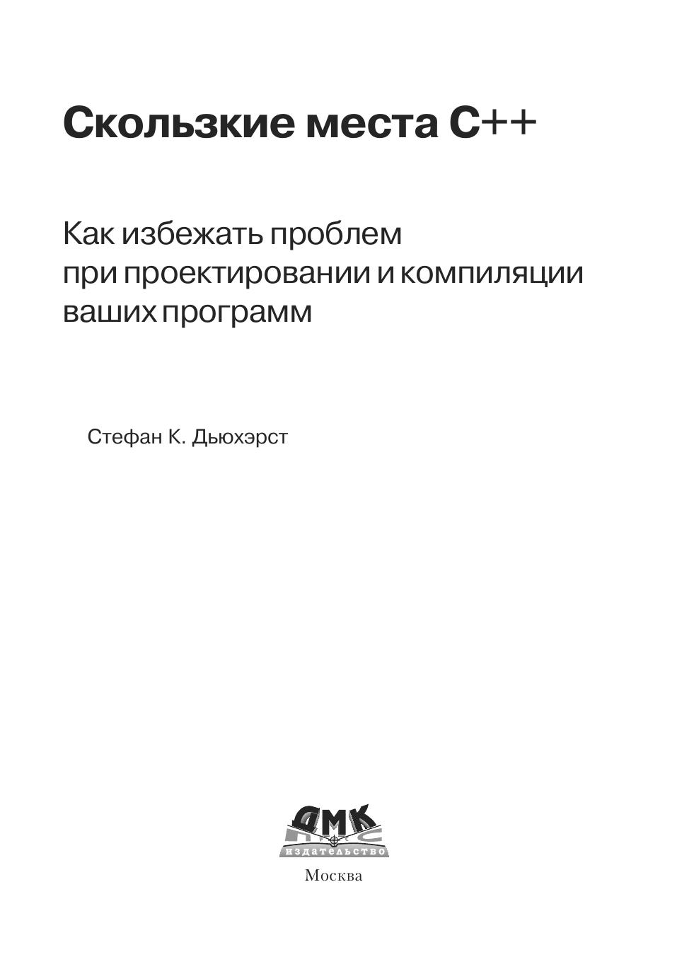 Вы держите в руках руководство по тому, как не допускать и исправлять 99% типичных, разрушительных и просто любопытных ошибок при проектировании и реализации программ на языке C++. Эту книгу можно рассматривать также, как взгляд посвященного на нетривиальные особенности и приемы программирования на C++. Обсуждаются как наиболее распространенные «ляпы», имеющиеся почти в любой программе на C++, так и сложные ошибки в использовании синтаксиса, пре-процессора, преобразований типов, инициализации, управления памятью и ресурсами, полиморфизма, а также при проектировании классов и иерархий. Все ошибки и их последствия обсуждаются в контексте. Подробно описываются способы разрешения указанных проблем. Автор знакомит читателей с идиомами и паттернами проектирования, с помощью которых можно решать типовые задачи. Читатель также узнает много нового о плохо понимаемых возможностях C++, которые применяются в продвинутых программах и проектах. На сайте http://www.semantics.org можно найти полный код примеров из книги. В книге рассказывается, как миновать наиболее серьезные опасности, подстерегающие программиста на C++. Программисты найдут в ней практические рекомендации, которые позволят им стать настоящими экспертами. Издание предназначено для всех программистов, желающих научиться писать правильные и корректно работающие программы на языке С++.