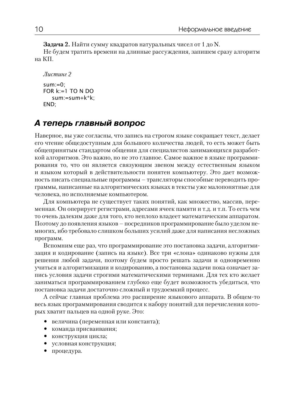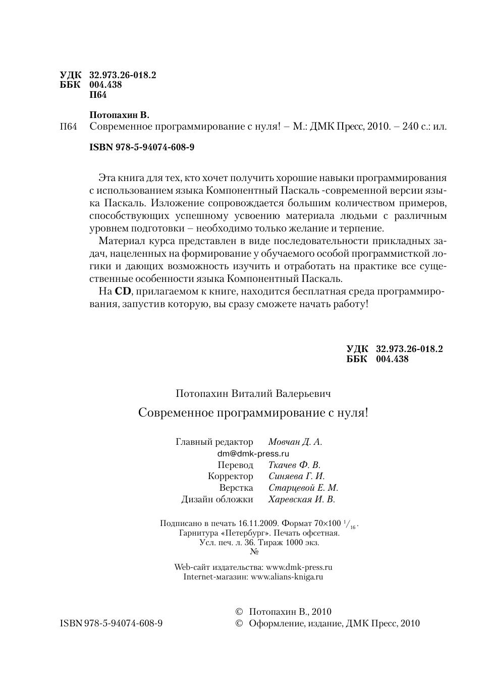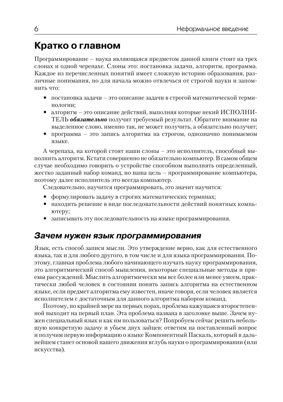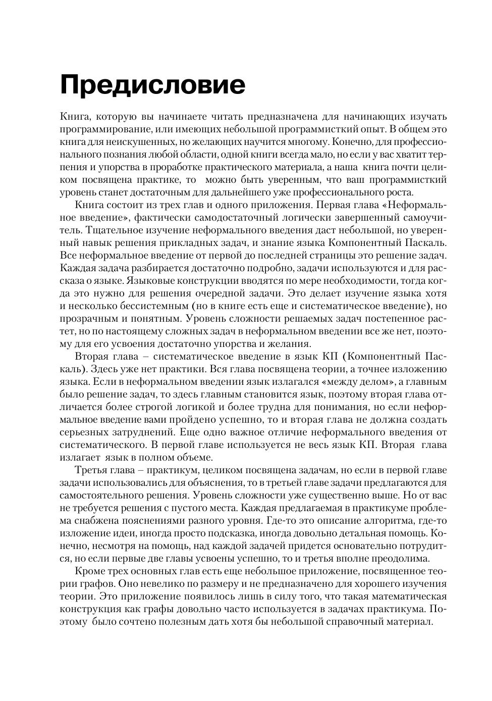 Эта книга для тех, кто хочет получить хорошие навыки программирования с использованием языка Компонентный Паскаль - современной версии языка Паскаль. Изложение сопровождается большим количеством примеров, способствующих успешному усвоению материала людьми с различным уровнем подготовки – необходимо только желание и терпение. Материал курса представлен в виде последовательности прикладных задач, нацеленных на формирование у обучаемого особой программисткой логики и дающих возможность изучить и отработать на практике все существенные особенности языка Компонентный Паскаль.