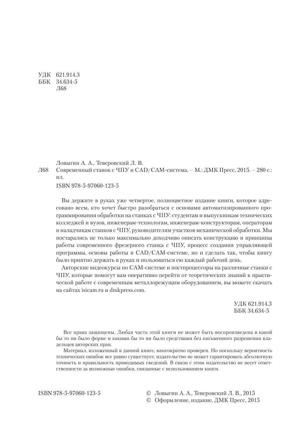 Вы держите в руках уже четвертое, полноцветное издание книги, которое адресовано всем, кто хочет быстро разобраться с основами автоматизированного программирования обработки на станках с ЧПУ: студентам и выпускникам технических колледжей и вузов, инженерам-технологам, инженерам-конструкторам, операторам и наладчикам станков с ЧПУ, руководителям участков механической обработки. Мы постарались не только максимально доходчиво описать конструкцию и принципы работы современного фрезерного станка с ЧПУ, процесс создания управляющей программы, основы работы в CAD/САМ-системе, но и сделать так, чтобы книгу было приятно держать в руках и пользоваться ею каждый рабочий день. Авторские видеокурсы по CAM-системе и постпроцессоры на различные станки с ЧПУ, которые помогут вам оперативно перейти от теоретических знаний к практической работе с современным металлорежущим оборудованием, вы можете скачать на сайтах isicam.ru и dmkpress.com.